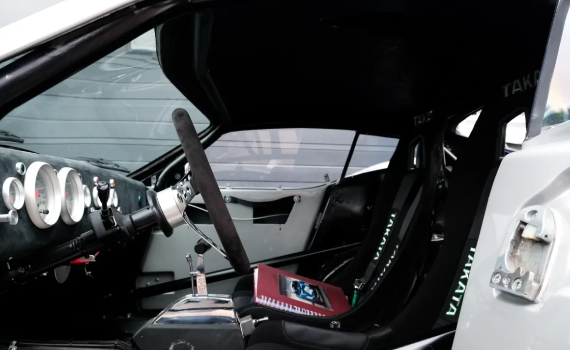 Elles servaient àdiminuer la faible possibilité de refroidissement des freins arrière. En fait, plus on passait de temps à regarder la voiture, plus on commençait à réaliser que Lamm et son équipe de restauration avaient préparé correctement cette voiture. Le verre latéral, unique, et l’éclairage des clignotants inférieurs étaient deux autres exemples de résolutions de conception intelligentes sans succomber au malaise du marché secondaire ou des billettes souvent vues dans les restomods ou les Custom-cars. Les choix de matériaux et de couleurs étaient risqués pour l’exposition de Peeble Beach mais bien résolus avec du vinyle touffeté cousu dans les portes et des sièges baquets profilés en tissu. Un ensemble de ceintures de sécurité de compétition Safecraft était installé avec des ancrages de barre de soutien arrière et des fermoirs à dégagement rapide du moyeu central.