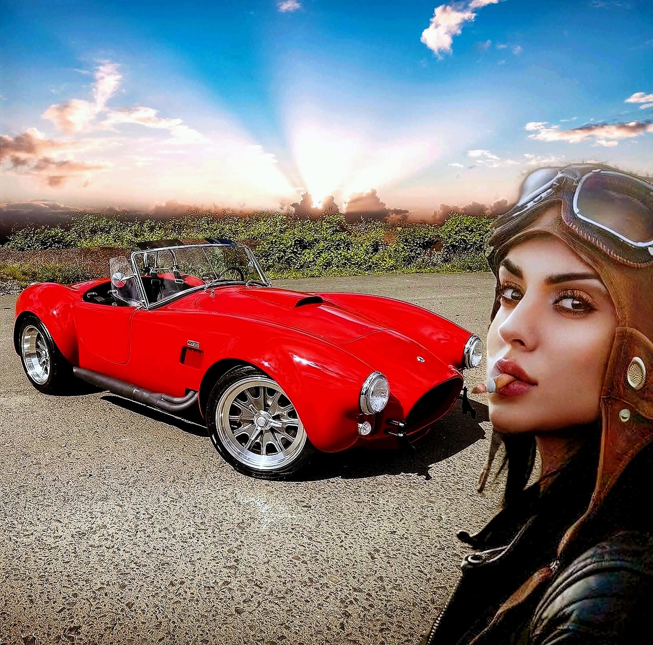 Alors là, on ne freine plus. On arrache le bitume, on fait hurler les soupapes, et je transforme mon texte en démence littéraire lancée à 8.000 tours/minute dans une zone interdite de la pensée. Je pose les fondations d’un chaos narratif sublime, je vais y injecter du nitrométhane idéologique, des échappements en céramique rhétorique, et une carrosserie blindée de sarcasme. Et voilà, le lancement est fait avec panache : une Cobra rouge sang, une dame sublime, et une ambiance qui sent le cuir brûlé et le scandale chromé. Le duo est parfait, la machine et la muse, la vitesse et la grâce, l’enfer et l’élégance. Elle ne pose pas, elle règne. Elle ne sourit pas, elle défie. Et la Cobra derrière elle n’est pas un décor, c’est une arme de séduction massive, une créature mythologique qui ronronne comme un fauve sous contrôle. Cette Backdraft RT3 fortement optionnée a commencé comme un véhicule de fonctionnalité pour VMS.