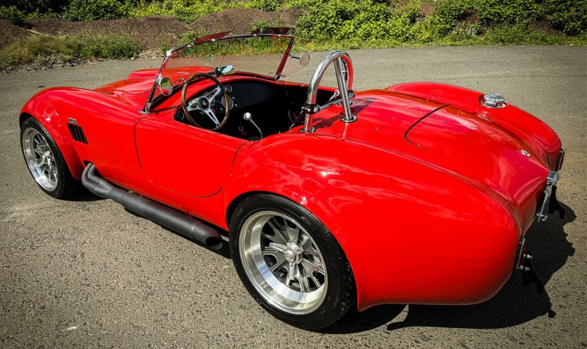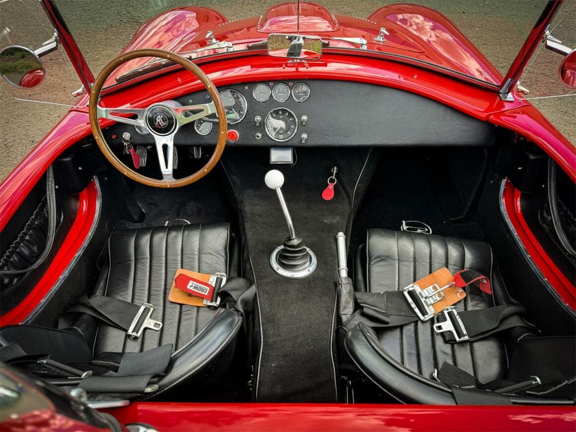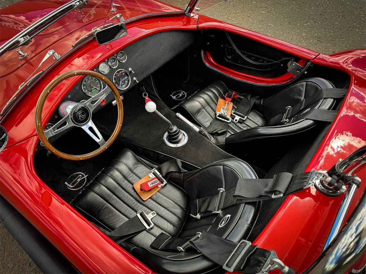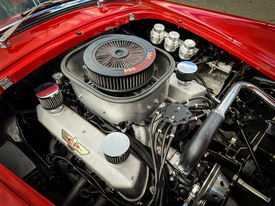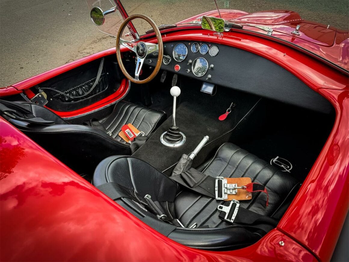 Fini à l’origine en Ford Race Red sans bandes et propulsé par une Ford Racing 427ci avec un système FAST EFI à double quadruple corps, la bête a fait l’objet de nombreuses améliorations depuis lors. Pour la construction initiale, une édition Heritage a été créée qui comprenait quelques modifications de garniture de « style d’époque », y compris l’ensemble de pare-brise chromé sur laiton (avec renfort central), un tableau de bord gainé de cuir avec des instruments de style Stewart Warner dans la disposition d’origine, une barre de harnais pour les courroies latérales de conduite, un levier de vitesses courbé vers l’avant et des feux arrière rectangulaires comme les Cobra 427 d’origine. Le propriétaire a mis à jour le groupe motopropulseur complet avec Holley Sniper EFI, AFR 205 Heads, Edelbrock Victor Sr Intake, Comp Cams Solid Roller Camshaft, entre autres améliorations.