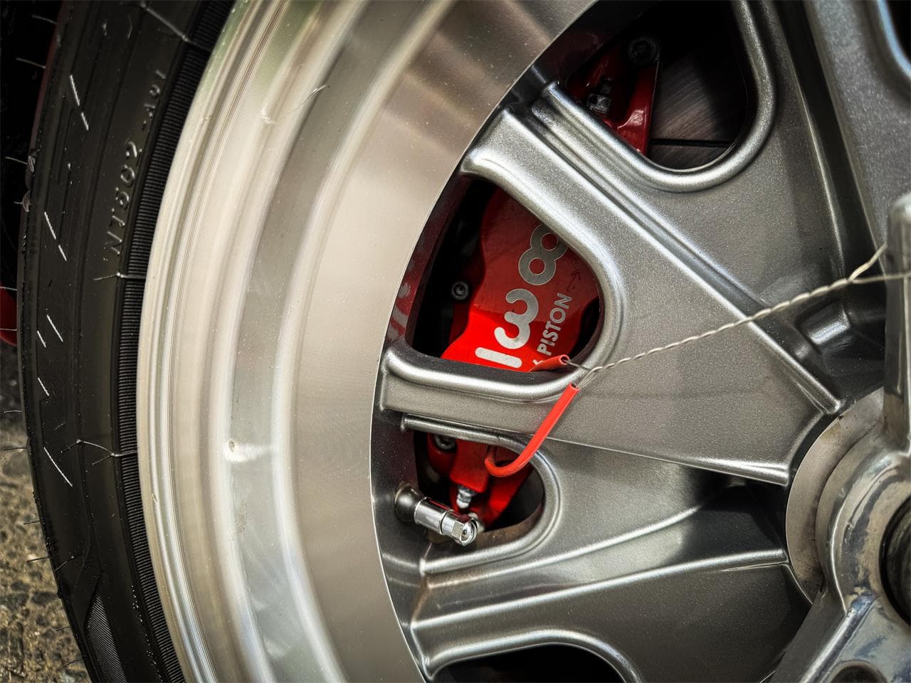 La transmission a également été mise à niveau vers une transmission manuelle Tremec T-56 Magnum à 6 vitesses avec un levier de vitesses Hanlon Motorsports. La pochette est de McLeod. Un accident (un attentat ?) dans le garage a entraîné une égratignure de l’aile, ce qui a conduit à une repeinture complète inutile mais magnifique par Connecticut Custom, en Race Red. La peinture fait vraiment briller cette voiture, l’un des plus beaux travaux de peinture sur une Backdraft. Parmi les autres améliorations apportées à la voiture au cours de ces améliorations, citons un kit complet de freins à disque Wilwood aux 4 roues avec des rotors percés et fendus et des étriers rouges, ainsi que les meilleurs rétroviseurs latéraux pour ces voitures de DCC. La bête, à vendre, a été entièrement inspectée, réglée, détaillée et prête à être amenée en Europe