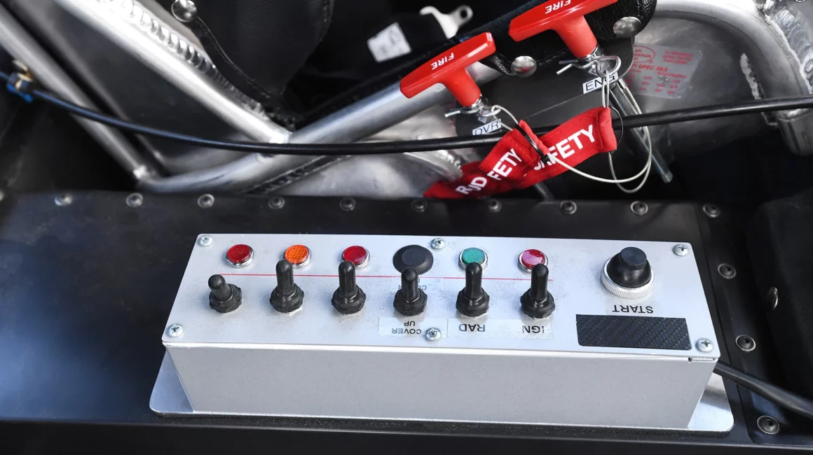 Wayne a insisté pour conserver le coté reconnaissable du tableau de bord qui descend jusqu’au panneau de commande, ou se trouvent le levier des vitesses, la commande du parachute et un interrupteur d’arrêt principal. Les panneaux de porte formés en métal sont en place ainsi que les poignées de porte, bien que tous les vitrages, y compris les aérations, sont en Lexan. L’habitacle reste indéniablement celui d’une Corvette. Depuis le début, Wayne s’était fixé pour objectif la classe Grand Tourisme de la “Southern California Timing Association” (SCTA) qui est spécifique aux voitures de sport deux places.