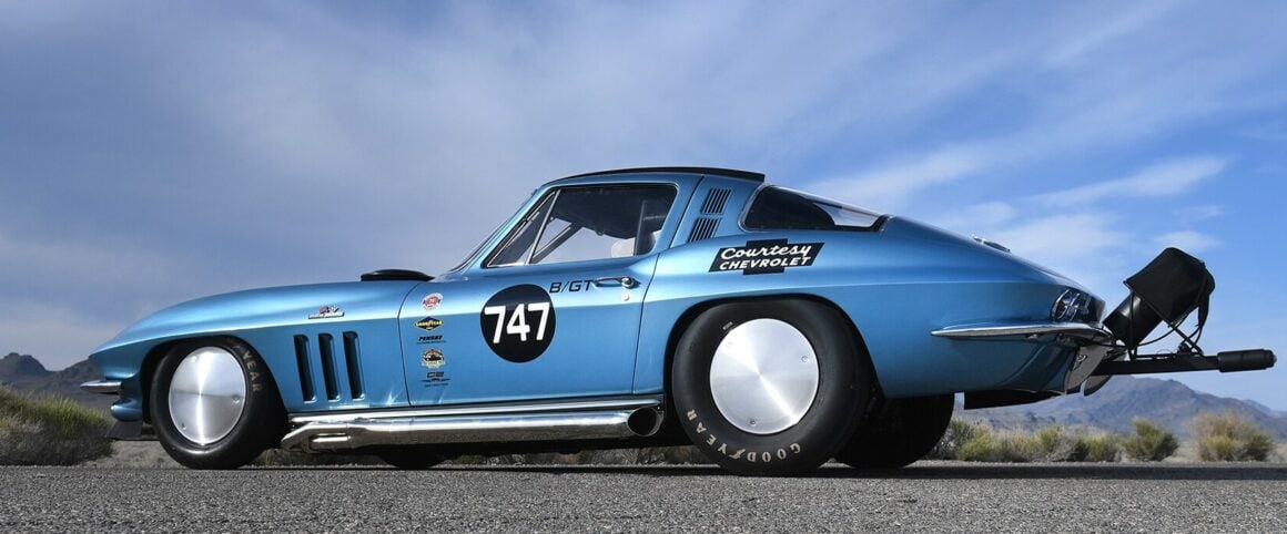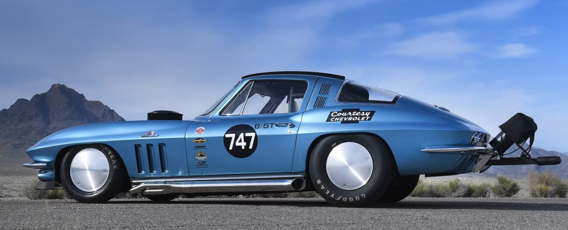 Les collecteurs personnalisés comportent un ensemble de tuyaux latéraux d’usine. Cette 427 entre dans la catégorie B/GT pour des cylindrées de moteur de 373 à 439 ci. Les deux dernières courses de Bonneville ont été annulées en cause des conditions météorologiques, mais Wayne a pu piloter la voiture à El Mirage, où il a atteint une vitesse de plus de 170 mph sur le parcours de 1,3 mile. Réalisant le besoin d’un aérodynamisme et d’une force d’appui mieux placés, Wayne a décidé de passer à la catégorie GT modifiée (B/MGT) qui permet d’installer un séparateur d’air avant, un sabot moteur et un aileron arrière.