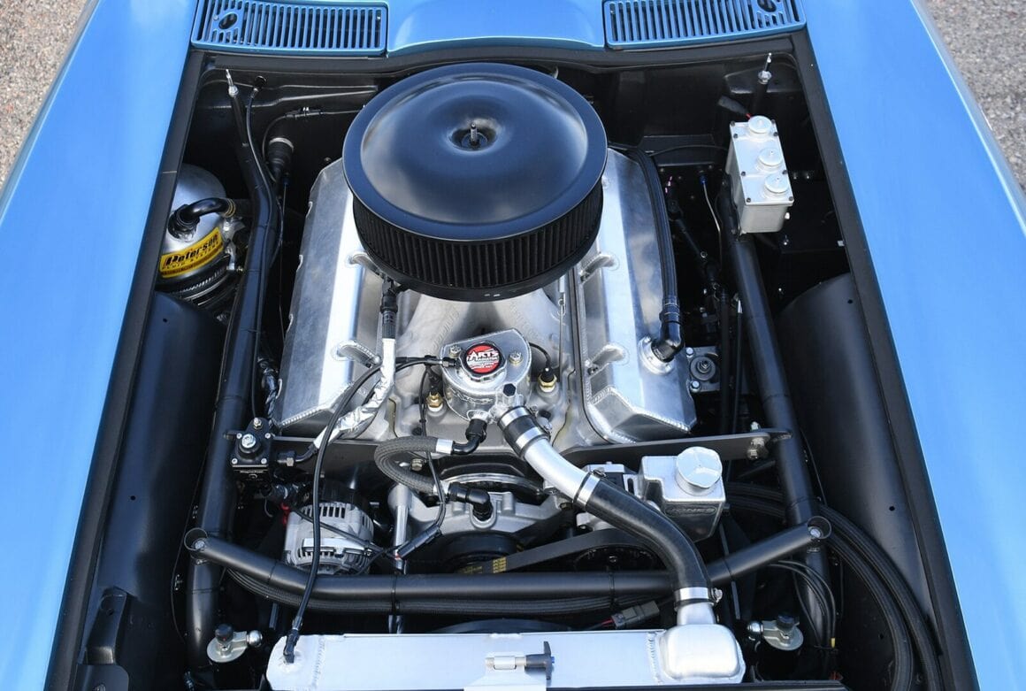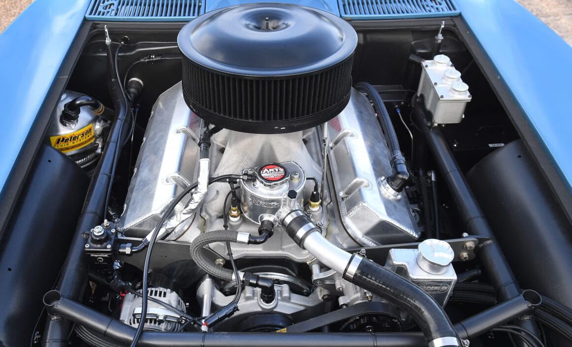 Tout cela mène à un Big bloc 427ci, une chose qui fait sourire les puristes de la Corvette, car la ’65 n’était proposée qu’avec le 396ci… Le moteur 427ci a été assemblé par le motoriste de NASCAR Jeff Collins et est basé sur un bloc Big-M doté d’un vilebrequin Eagle 4340, de bielles Oliver en billette, de cames à rouleaux Bullet et de composants de commande de soupapes Isky et Jesel. Les culasses et l’admission en aluminium Pro-Filer sont alimentées par un carburateur Brazwell 1000cfm, tandis qu’un système de lubrification à carter sec assure les régimes soutenus.