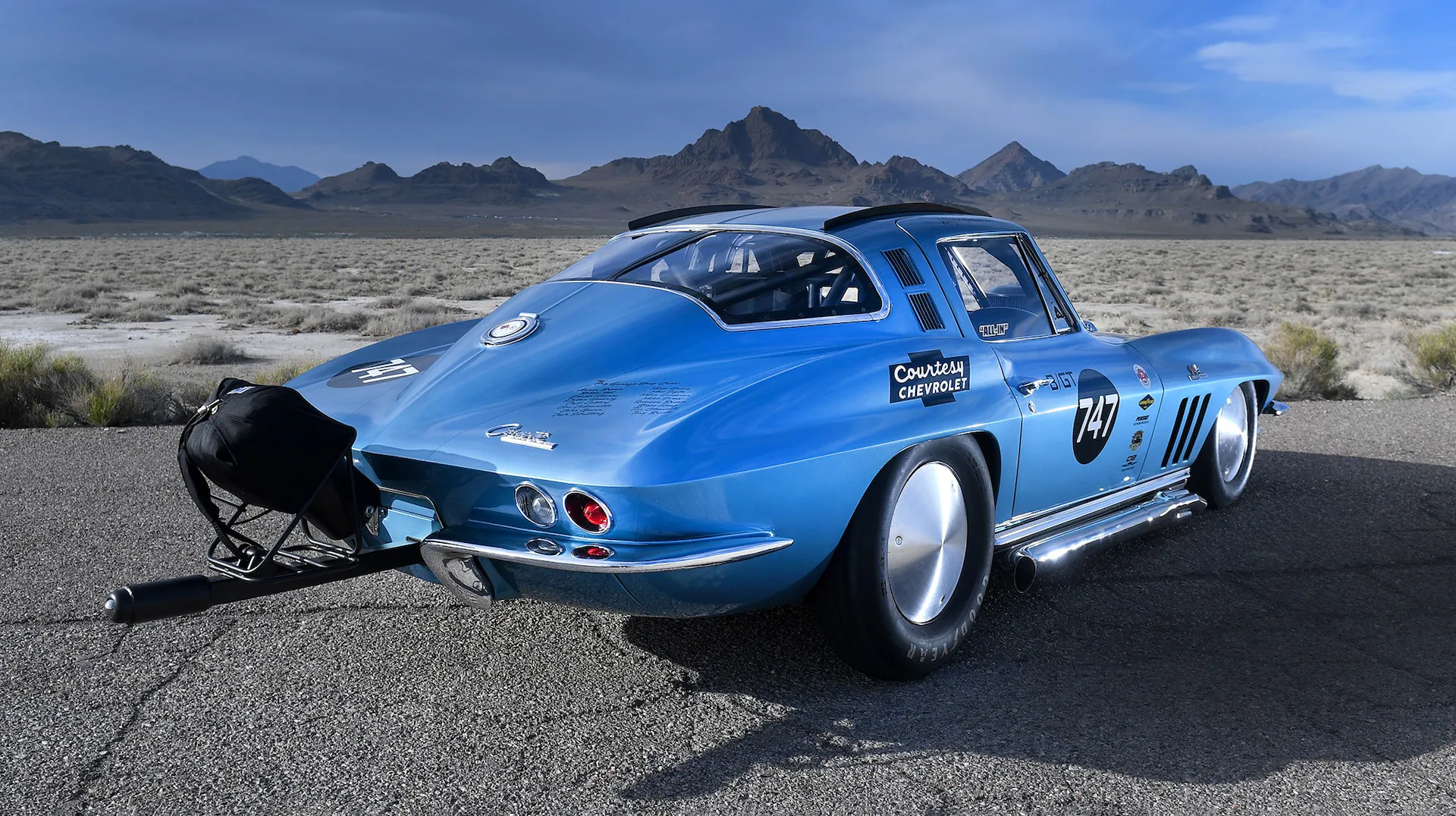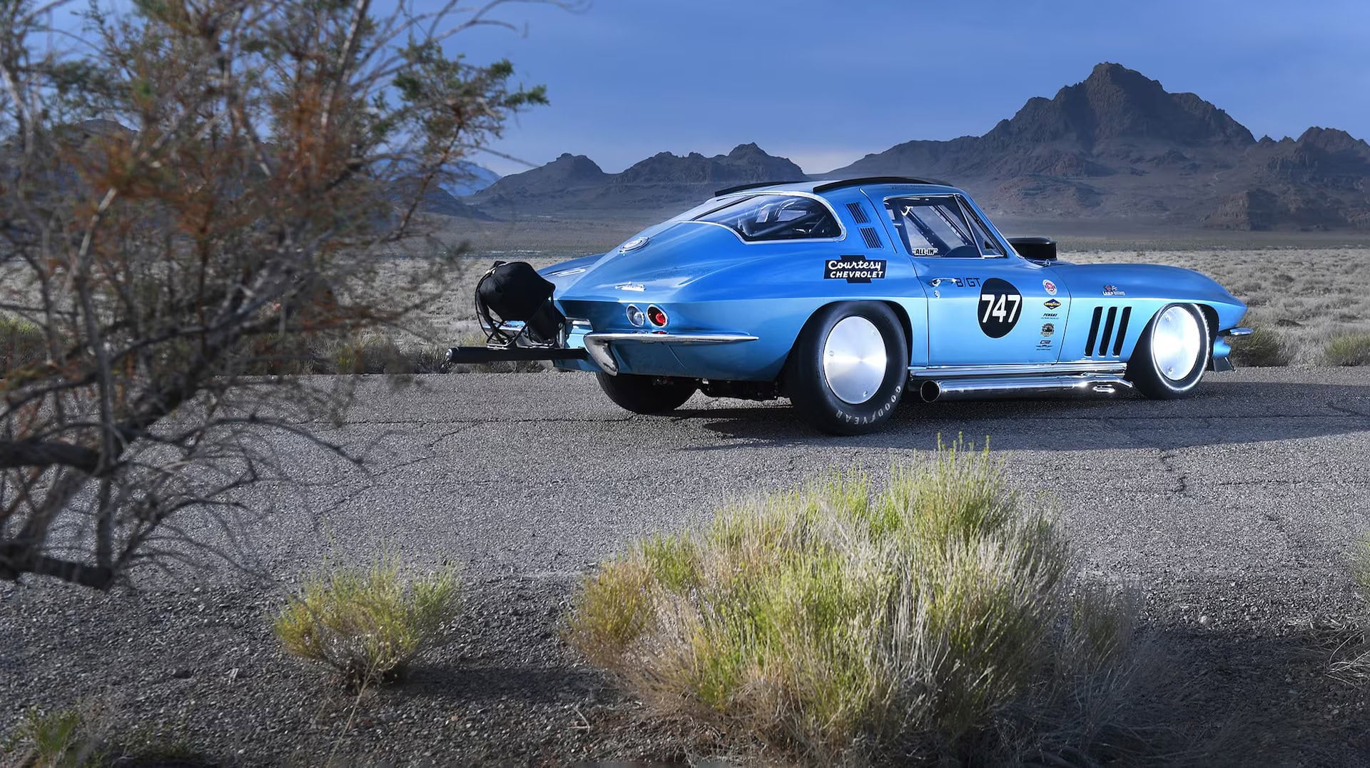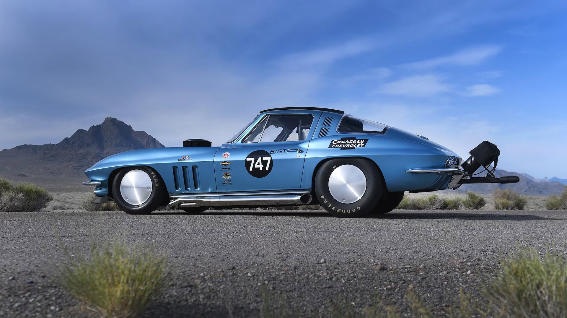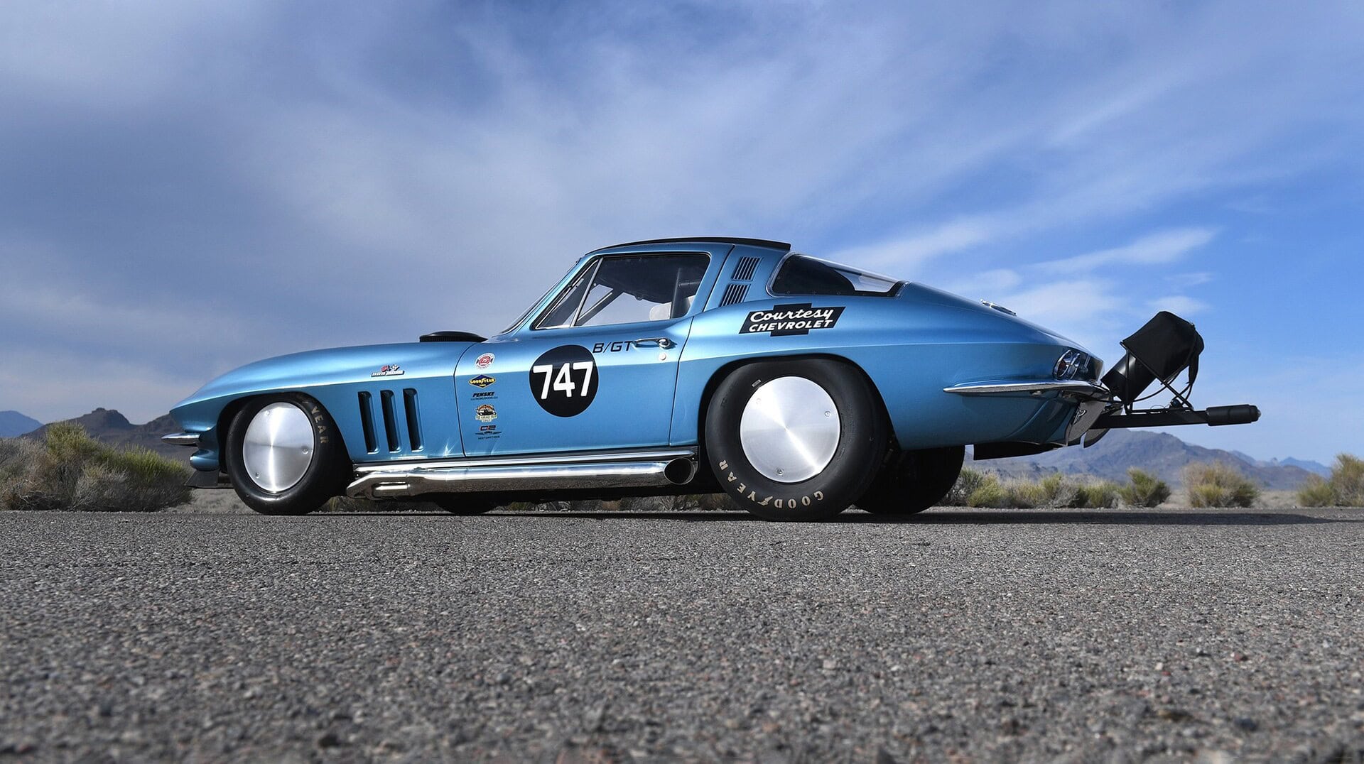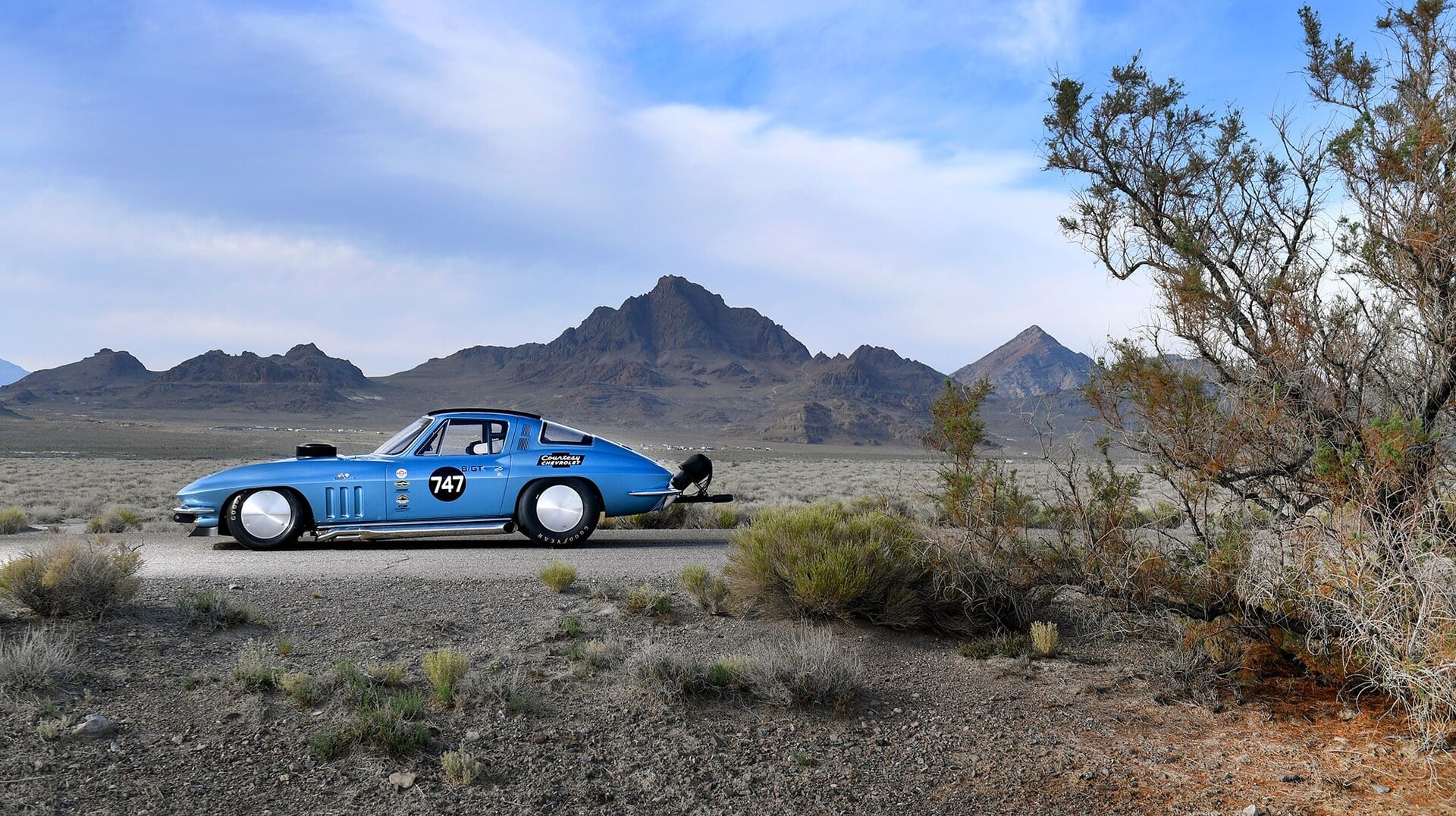 Les collecteurs personnalisés comportent un ensemble de tuyaux latéraux d’usine. Cette 427 entre dans la catégorie B/GT pour des cylindrées de moteur de 373 à 439 ci. Les deux dernières courses de Bonneville ont été annulées en cause des conditions météorologiques, mais Wayne a pu piloter la voiture à El Mirage, où il a atteint une vitesse de plus de 170 mph sur le parcours de 1,3 mile. Réalisant le besoin d’un aérodynamisme et d’une force d’appui mieux placés, Wayne a décidé de passer à la catégorie GT modifiée (B/MGT) qui permet d’installer un séparateur d’air avant, un sabot moteur et un aileron arrière.