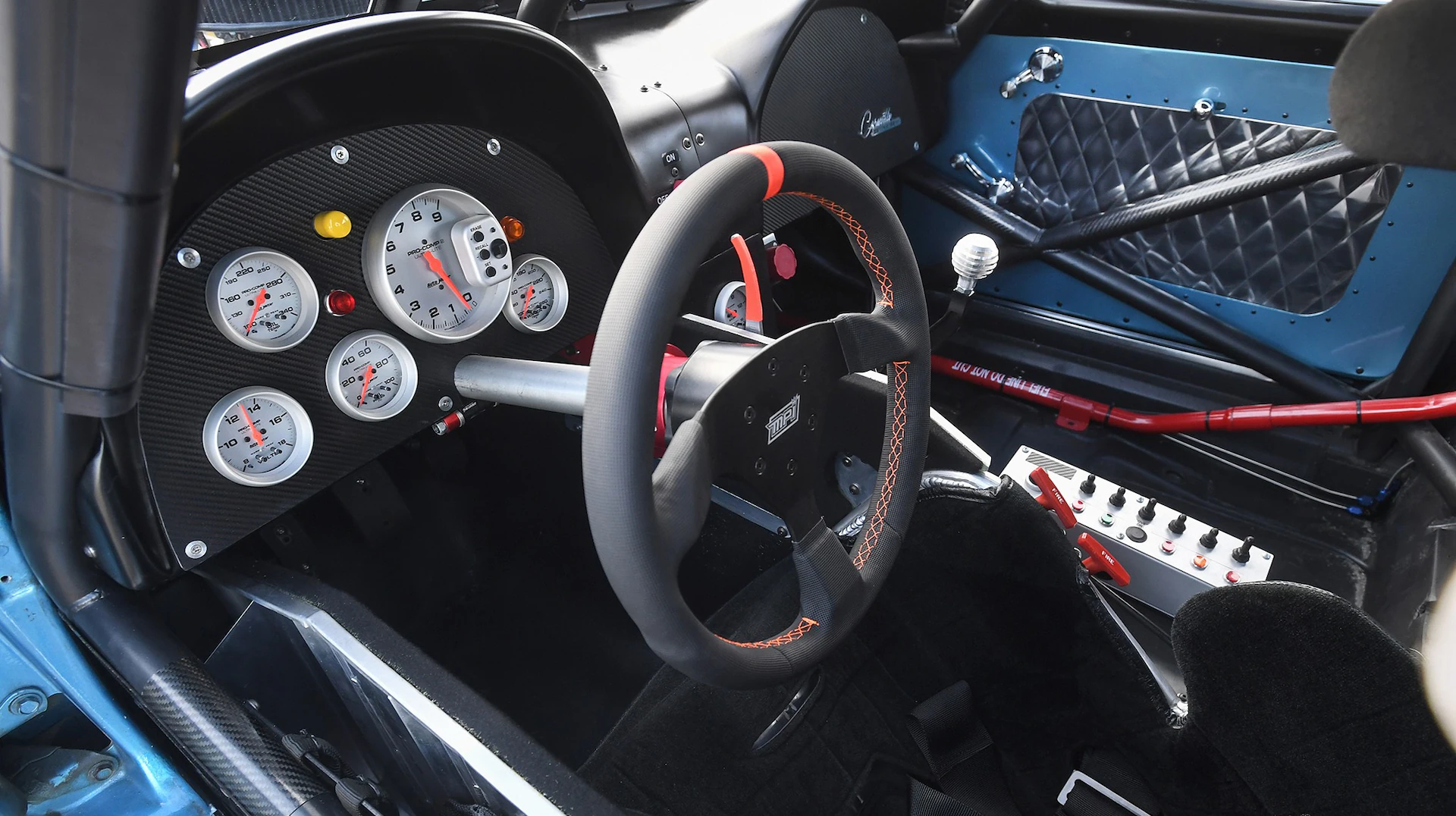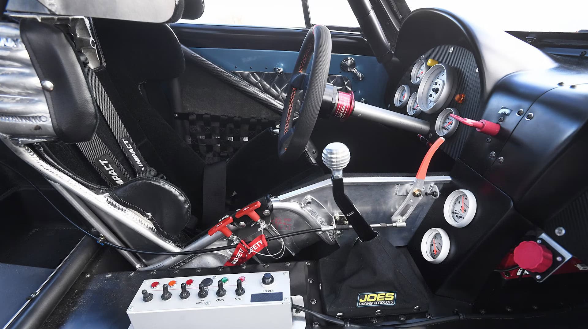 Wayne a insisté pour conserver le coté reconnaissable du tableau de bord qui descend jusqu’au panneau de commande, ou se trouvent le levier des vitesses, la commande du parachute et un interrupteur d’arrêt principal. Les panneaux de porte formés en métal sont en place ainsi que les poignées de porte, bien que tous les vitrages, y compris les aérations, sont en Lexan. L’habitacle reste indéniablement celui d’une Corvette. Depuis le début, Wayne s’était fixé pour objectif la classe Grand Tourisme de la “Southern California Timing Association” (SCTA) qui est spécifique aux voitures de sport deux places.
