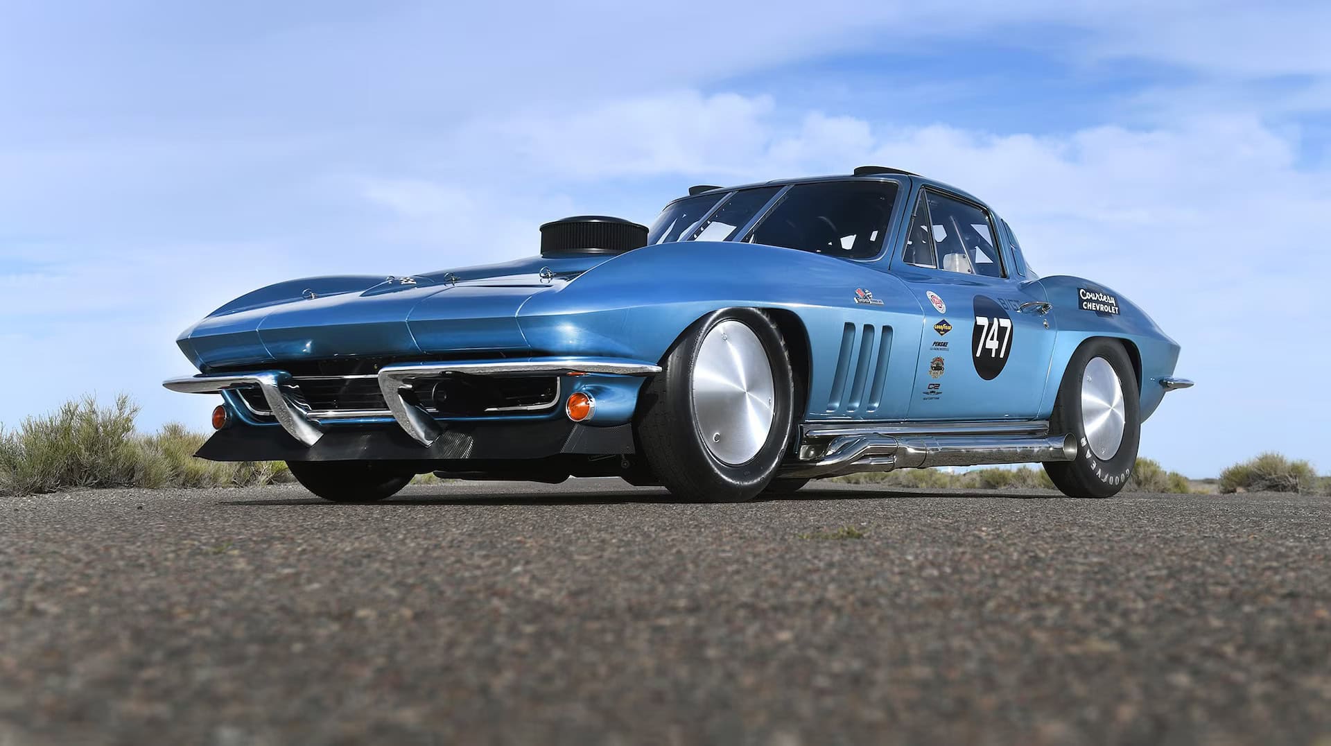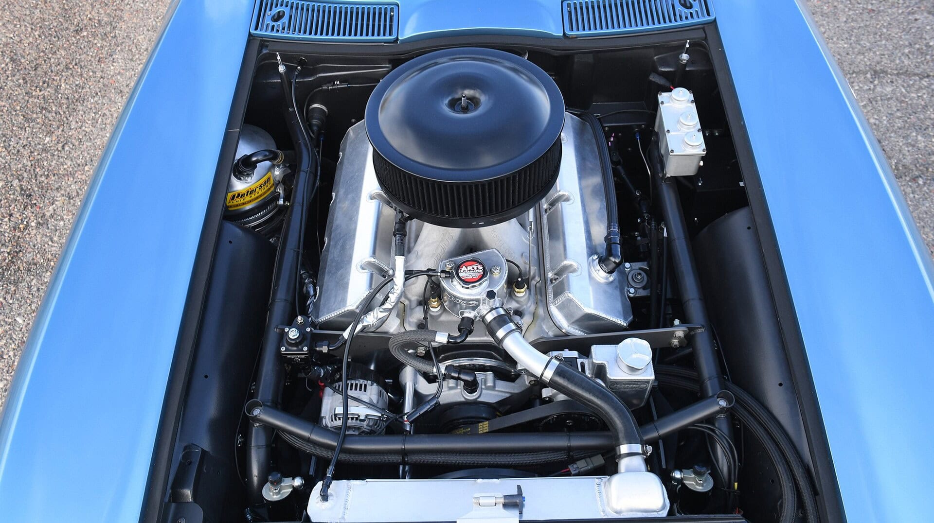 Tout cela mène à un Big bloc 427ci, une chose qui fait sourire les puristes de la Corvette, car la ’65 n’était proposée qu’avec le 396ci… Le moteur 427ci a été assemblé par le motoriste de NASCAR Jeff Collins et est basé sur un bloc Big-M doté d’un vilebrequin Eagle 4340, de bielles Oliver en billette, de cames à rouleaux Bullet et de composants de commande de soupapes Isky et Jesel. Les culasses et l’admission en aluminium Pro-Filer sont alimentées par un carburateur Brazwell 1000cfm, tandis qu’un système de lubrification à carter sec assure les régimes soutenus.