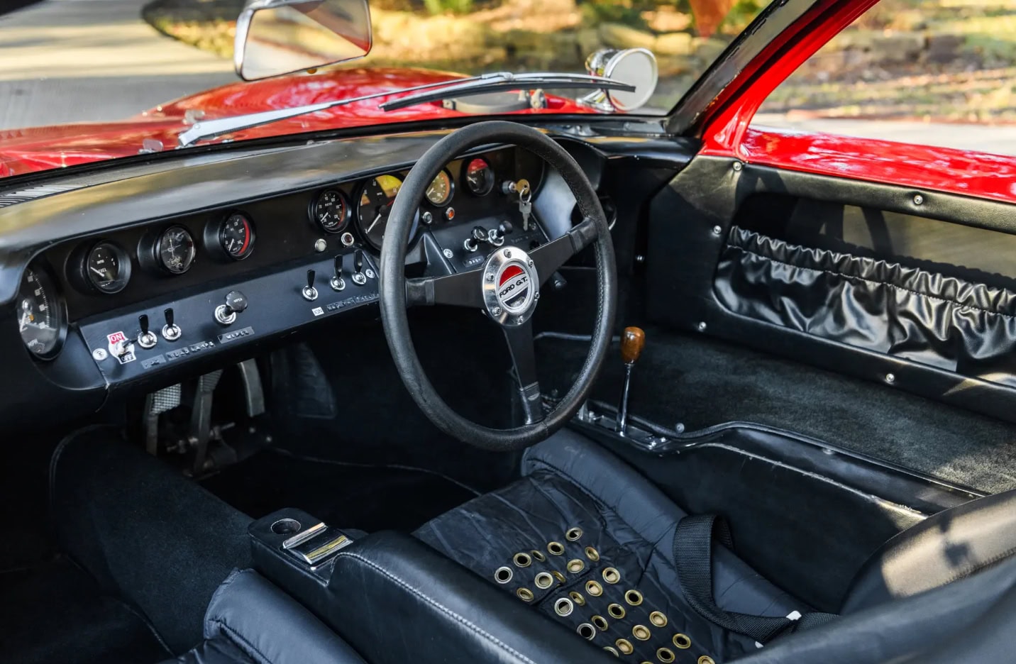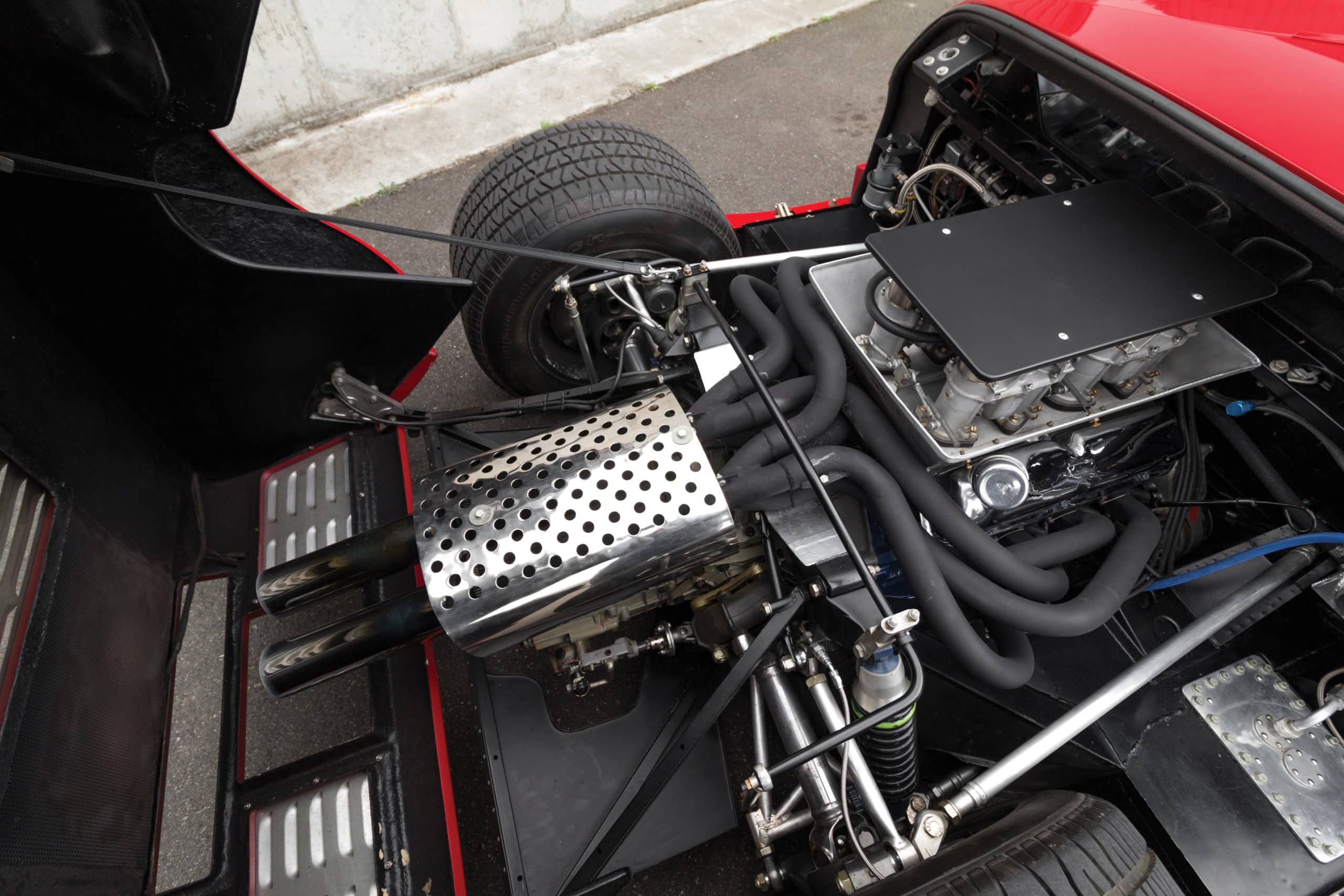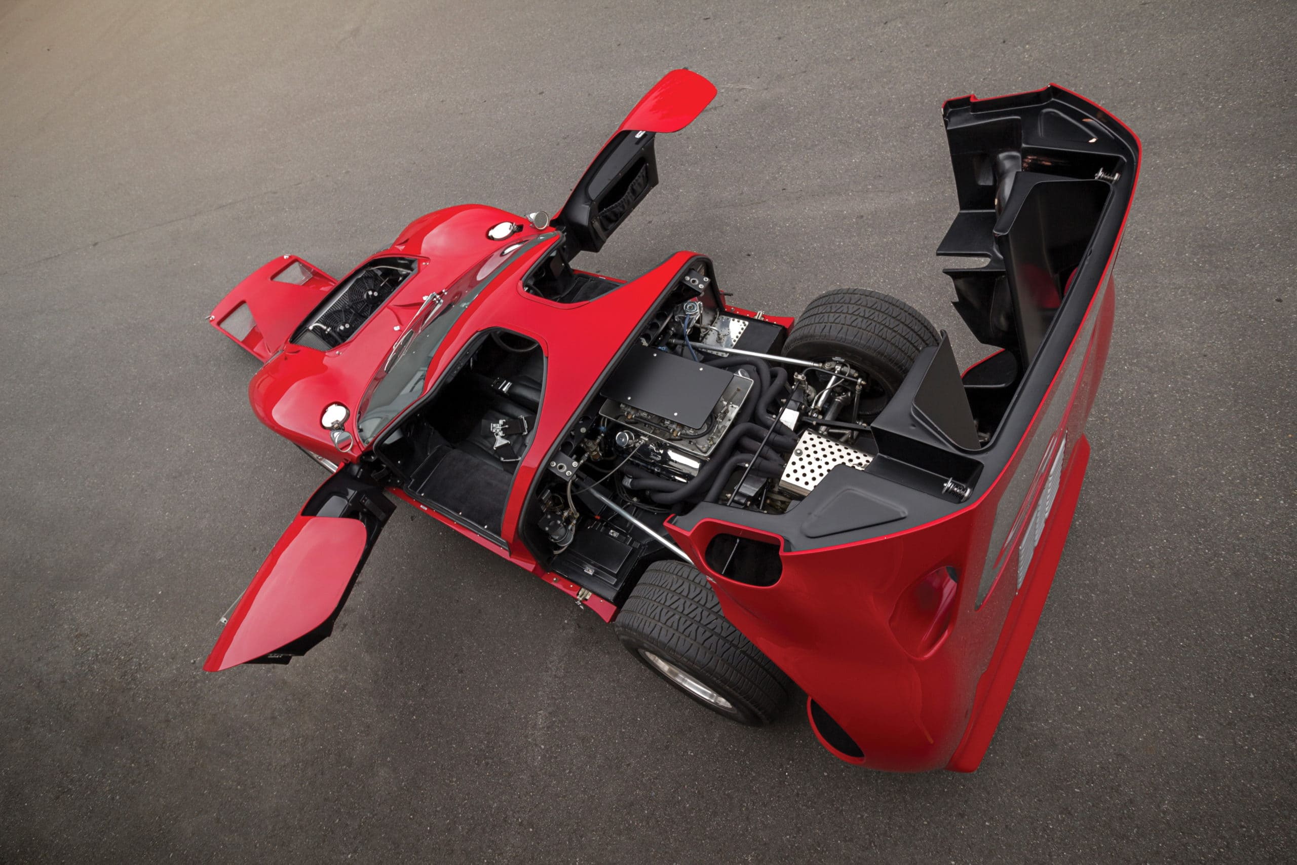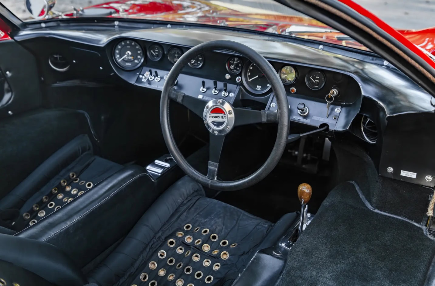 Peinte en rouge Carmen avec un intérieur noir, le châssis P/1058 a été officiellement affecté au programme de promotion et de liquidation en février 1967, puis a rejoint six autres voitures identiques au sein du département commercialisation de la division Ford. Bien qu’il existe quelques divergences concernant les détails de quelle GT40 est apparue dans quel concessionnaire particulier, les recherches de l’expert de la marque Ronnie Spain, telles que révélées dans son ouvrage de 2024 “Ultimate GT40 – The Definitive History”, affirment que P/1058 a été présentée en avril 1967 chez le légendaire concessionnaire Tasca Ford à Seekonk, dans le Massachusetts, à l’occasion du troisième anniversaire du modèle Mustang. Bob Tasca étant une figure de l’ère “Total Performance”…