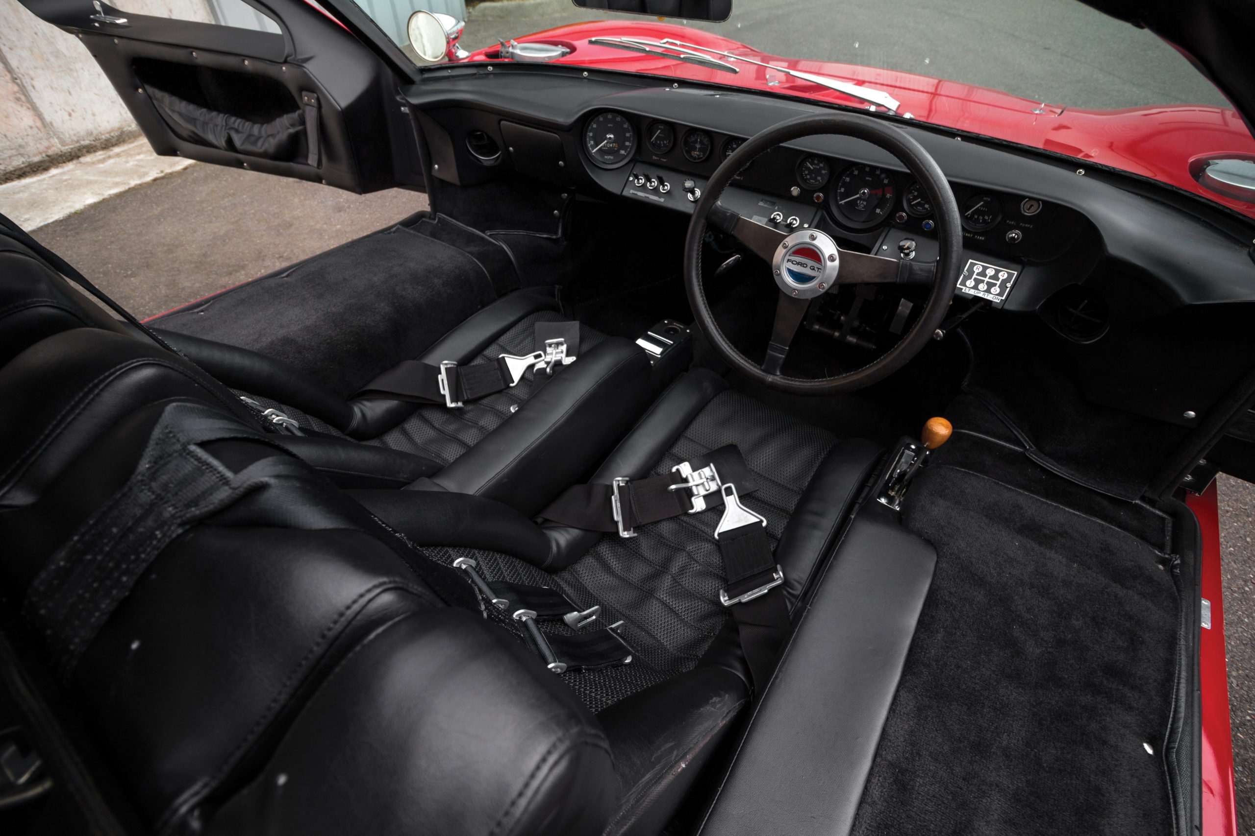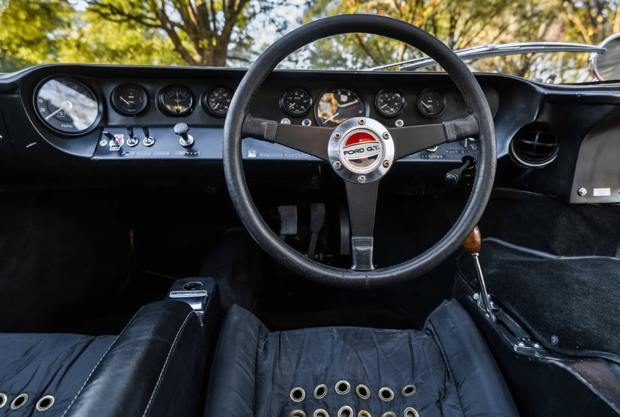 Mais pas que ça… S’y ajoutaient : un pare-brise chauffant, des sièges garnis de cuir, des rangements dans les portières, un cendrier, un allume-cigare et une moquette intégrale… C’était dérisoire… Elles étaient également équipées de roues à rayons “Borrani” et arboraient le logo “FORD” en lettres capitales à l’avant, à l’instar de la Mustang… Afin de vendre, Ford a mis en place un plan marketing baptisé “Programme de Promotion et de Vente”. Dans ce cadre, les voitures étaient présentées de concession en concession et vendues au fur et à mesure… Cette GT40 est l’un des 20 Mk I affectés à ce programme. En décembre 1966, elle faisait partie d’un lot de sept GT40 expédiées ensemble de l’usine FAV de Slough vers l’usine Ford de Dearborn.