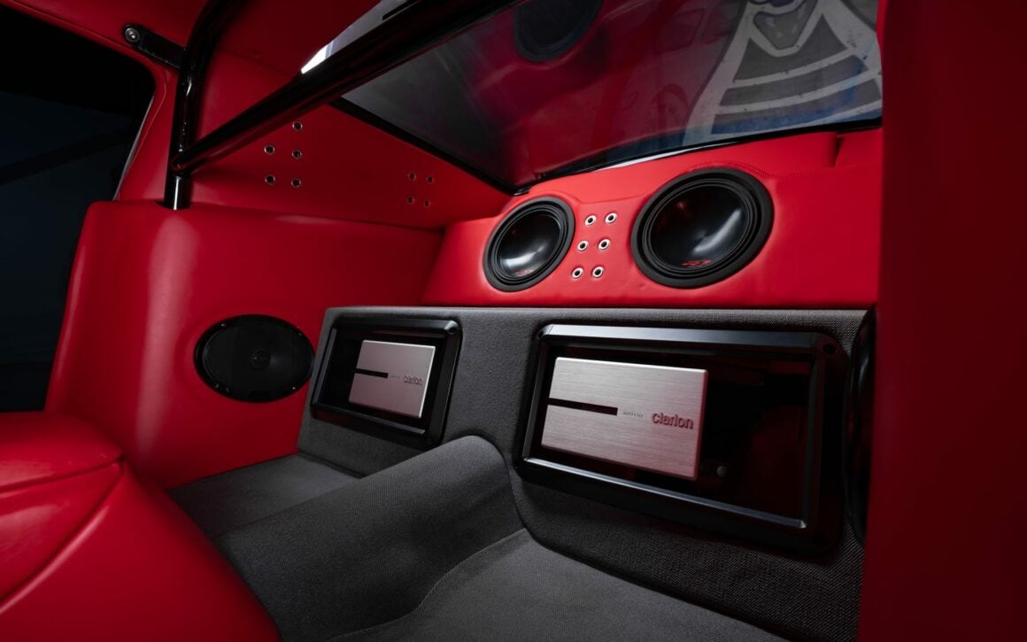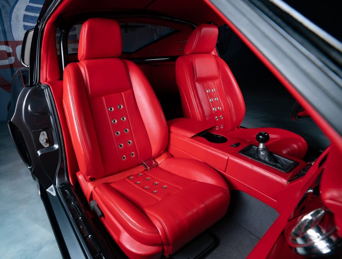 La carrosserie est une construction neuve en aluminium d’inpiration Mustang’67 élaborée par “Galpin” sur laquelle ont été ajouté des évents d’ailes, des tuyaux d’échappement latéraux, des poignées de porte érasées… Tout 100% neuf ! Toujours rien de la Mustang d’origine… Pour l’intérieur : compteurs “AutoMeter”, climatisation “Vintage Air”, vitres électriques pneumatiques, équipement stéréo à écran tactile “Alpine” câblé à des amplificateurs et haut-parleurs “Clarion” avec l’appoint de subwoofers issus du marché secondaire (re-sic !).