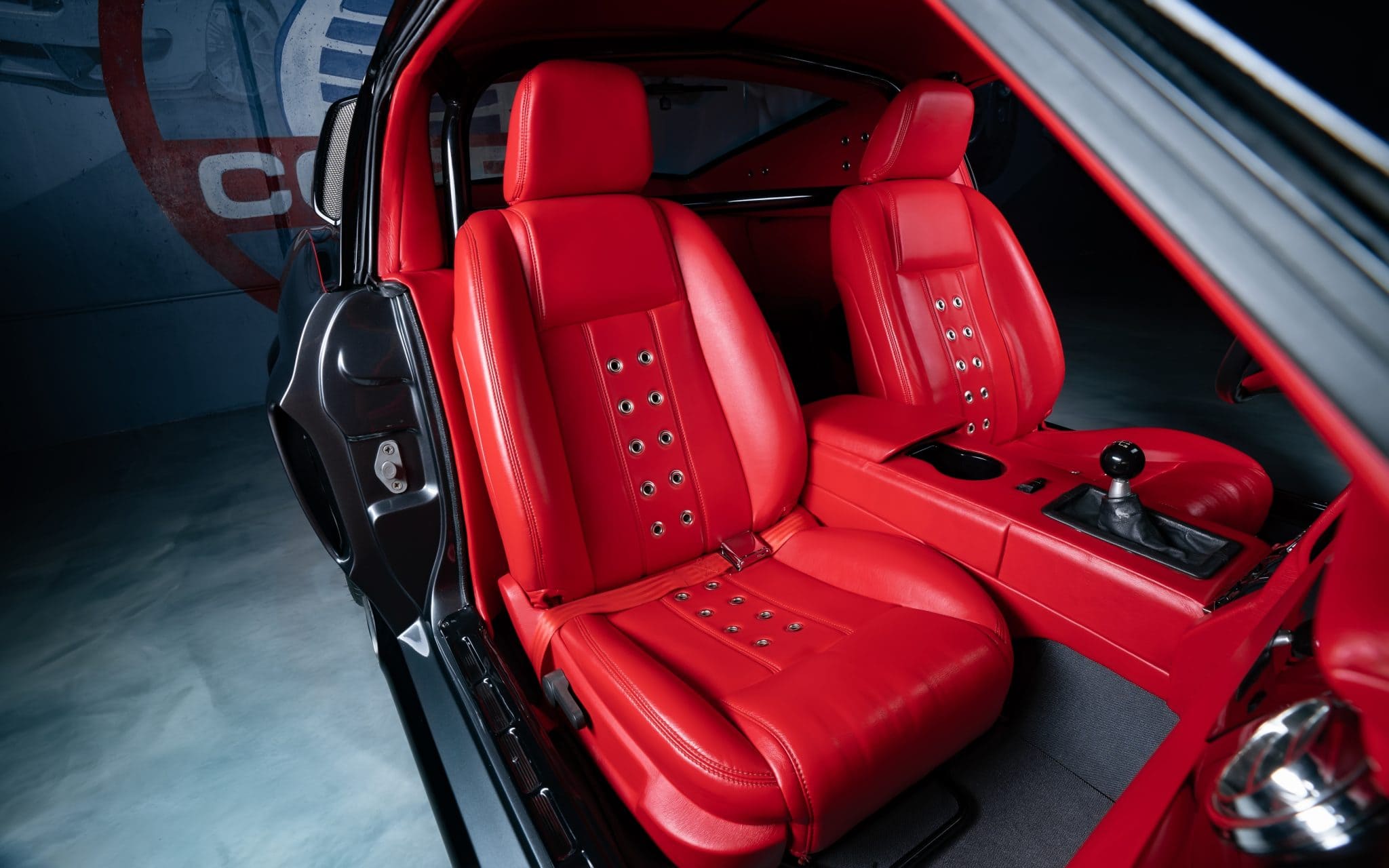 Les sièges baquets sont des ‘King” en cuir rouge qui complétés par une sellerie assortie sur le tableau de bord, les panneaux de porte et la console centrale, les tapis et autres finition étant de même couleur. Rien, absolument rien n’est d’origine. Le mystère est “pourquoi se référencer à une Mustang’67 qui a été acquise puis présentée comme ayant été reconstruite ?”… Strictement rien n’a été ré-utilisé, sauf les documents d’immatriculation afin que la création ne vienne plus du néant mais d’une source sure (quoiqu’incertaine) qui permet ainsi une immatriculation de Ford Mustang 1967…