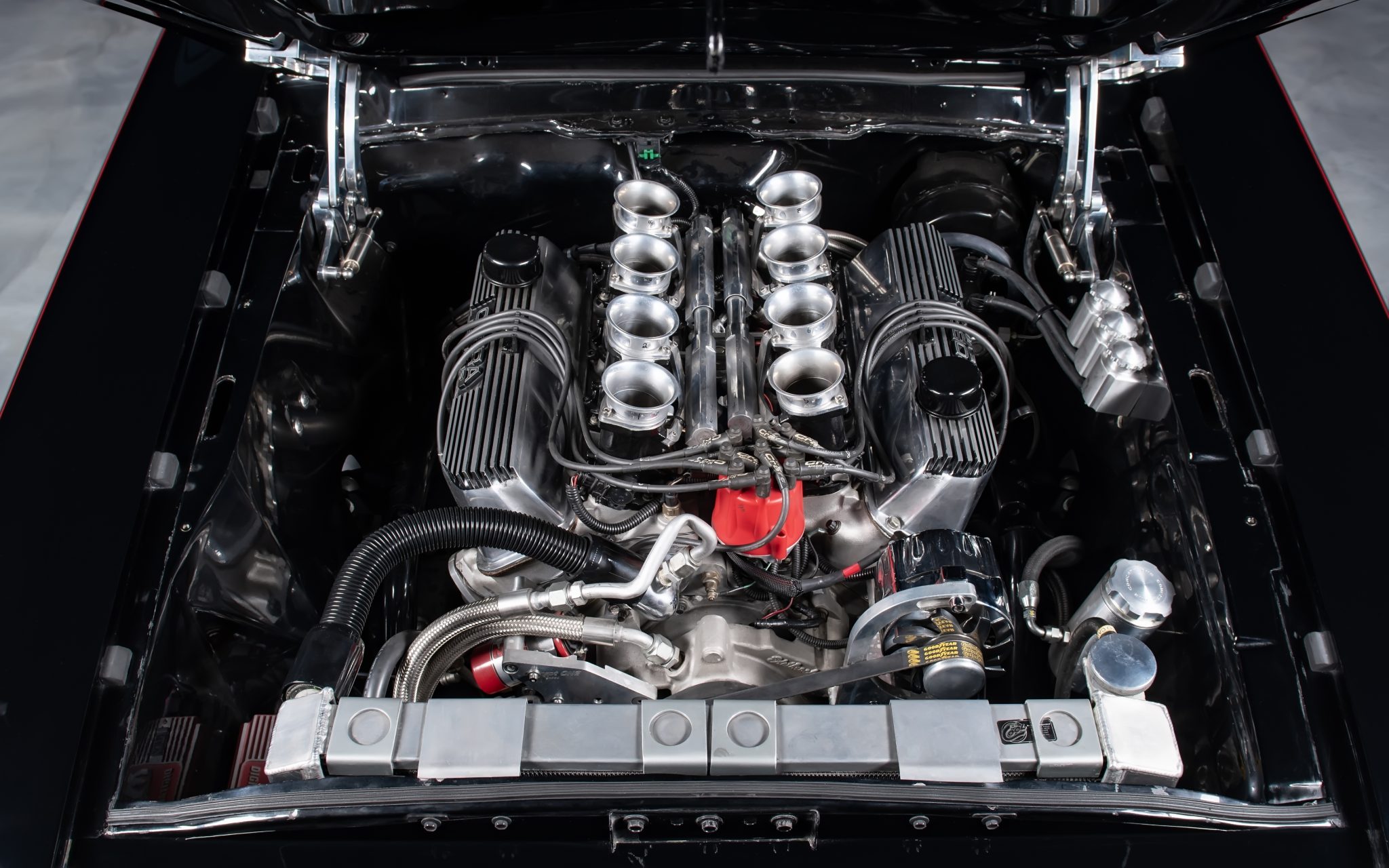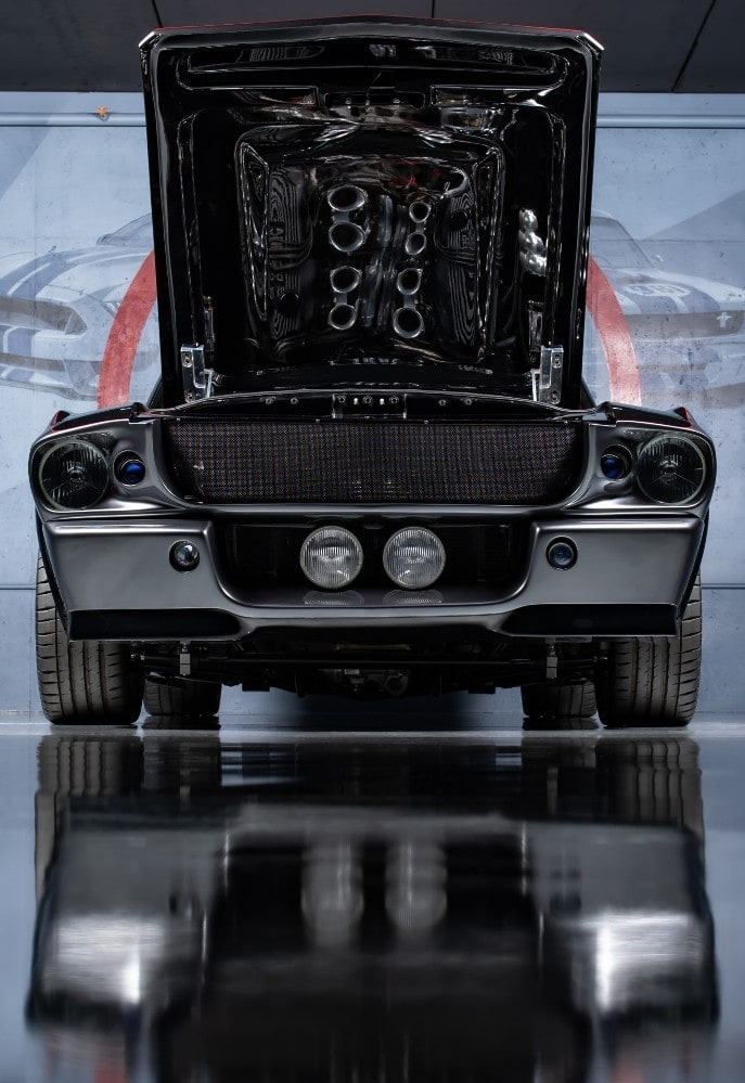 La carrosserie a été désolidarisée du châssis, de ses trains roulants ainsi que de son moteur et sa boite de vitesse. A ce stade c’était donc le dépeçage d’un tout nommé Ford Mustang’67 qui donc ne l’était plus. Un nouveau châssis n’ayant strictement en commun avec l’original, formé d’un ensemble de tubes et équipé de trains de roulement “Ridetech”, a été réalisé par “Schwartz Performance”… Un tout nouveau bloc-moteur V8 482ci de 875cv “à l’ancienne mais contemporain”, fabriqué de A à Z par “Craft Racing Engines” a été installé comprenant une gestion-moteur “FAST” et un système d’allumage “MSD”...