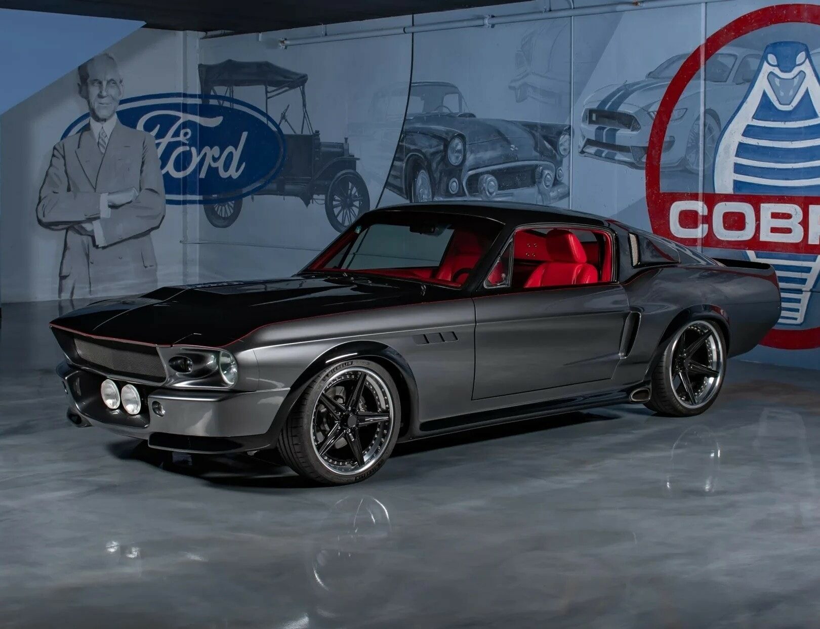 Ce tout a été assorti d’une nouvelle boîte manuelle 6 vitesses “Tremec”. Rien de la Ford originale jusqu’ici… L’équipement supplémentaire indispensable comprend des nouveaux trains roulant avec des suspensions multi-fonctions électriques comprenant des “coilovers réglables” orchestrés (sic !) par “Ridetech Engineering”, des freins “Outlaw” avec étriers “Wilwood”, des jantes “Billet Specialties” à diamètre décalé (19′ et 20’po) habillées de pneus “Michelin Pilot Sport” 235/35 AV et 285/30 AR à l’arrière… Waouhhh ! Que de pubs gratuites !