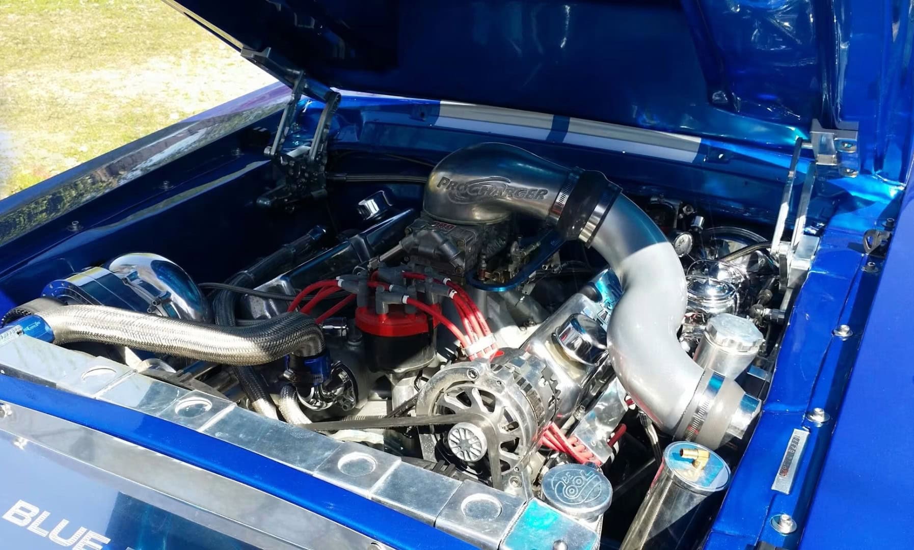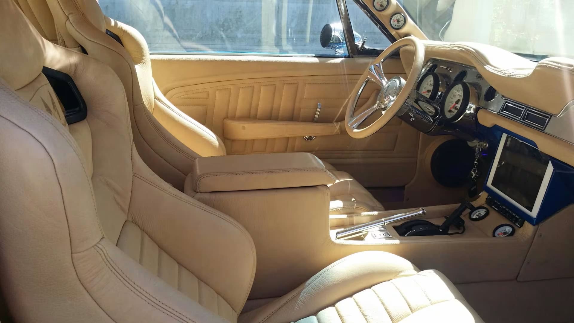 Cela m’en filerait presque la gerbe… Pffff ! Vous causer de cette Mustang’67 Resto Mod, motorisée d’un V8 Ford 500ci avec Procharger F1R blower disposant de 3 intercooler’s pour développer 975cv offerts au train arrière Positraction via une transmission “Super Streetfighter C6”, est jouissif. Pas que motorisation car la caisse est également exceptionnelle, peinte en Kandy Blue, avec un habitacle soigné réalisé en cuir de peaux de Bisons (natifs des USA)…