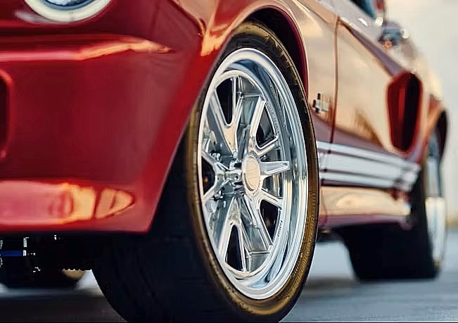 Le freinage est assuré par des freins à disque “Baer” de 13po aux quatre roues, tandis que l’allure est complétée par des jantes Shelby polies de 18 pouces chaussées de pneus Nitto haute performance dimensionnés pour tirer pleinement parti des passages de roues arrière élargis. Cet ensemble jantes et pneus modernes offre une adhérence optimale, procurant au conducteur un plaisir de conduite intense dès les premières accélérations.