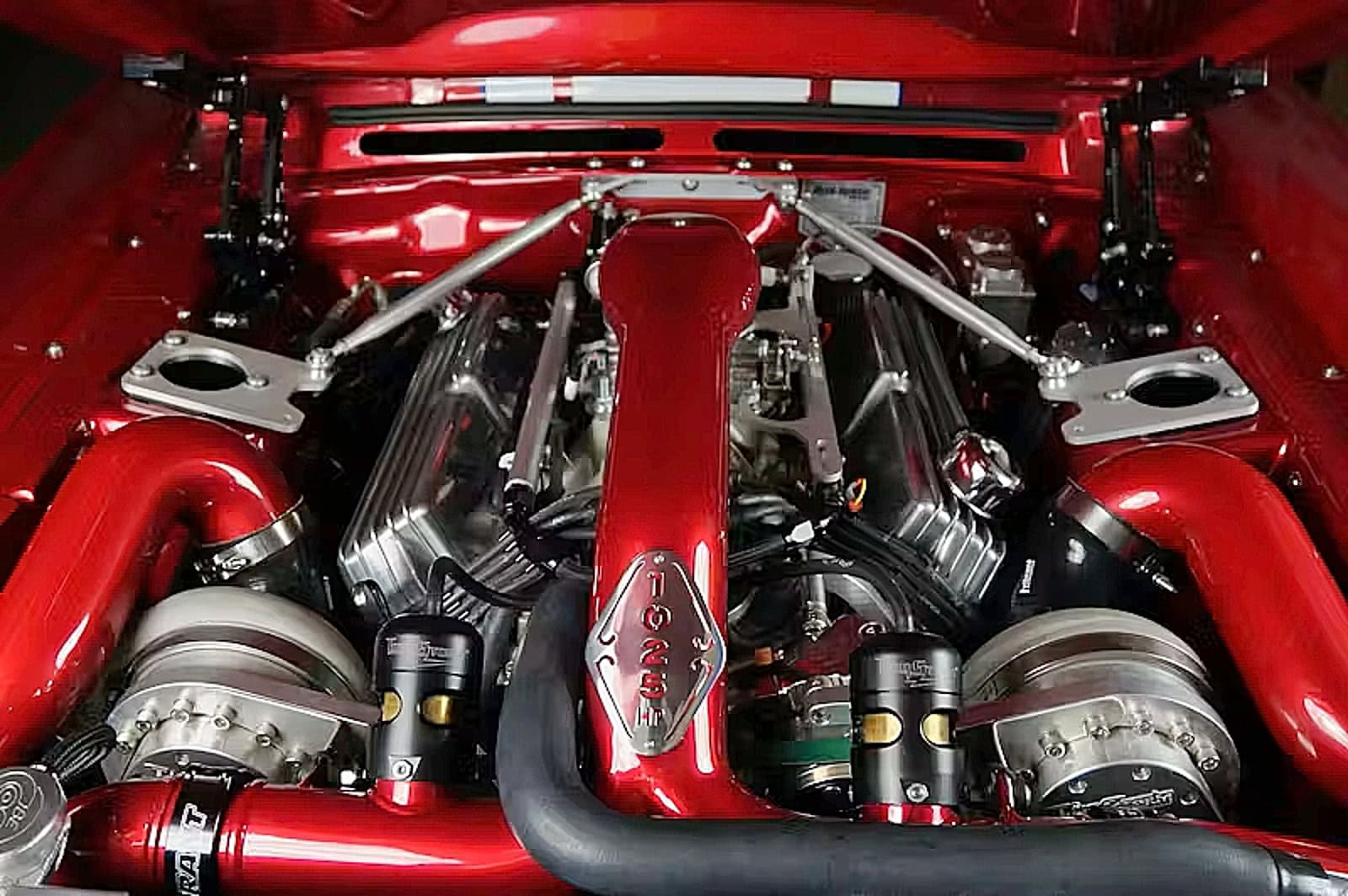 Tout au long de sa réalisation, “Red River Customs” s’est attaché à développer une puissance impressionnante, mais maîtrisable et constante. Un moteur Windsor de 427ci (7 litres) préparé par “Prestige Motorsports” développe 1.025cv grâce à deux compresseurs “TorqStorm”, une injection électronique Holley, une admission d’air sur mesure de 4po (10 cm) et deux échangeurs. Ce système privilégie une montée en pression linéaire et une stabilité thermique…