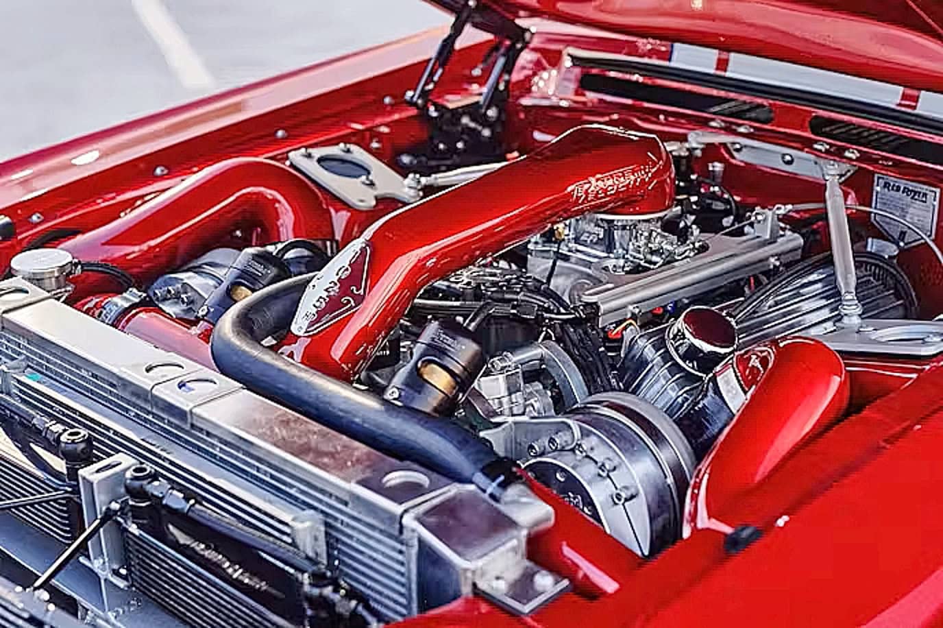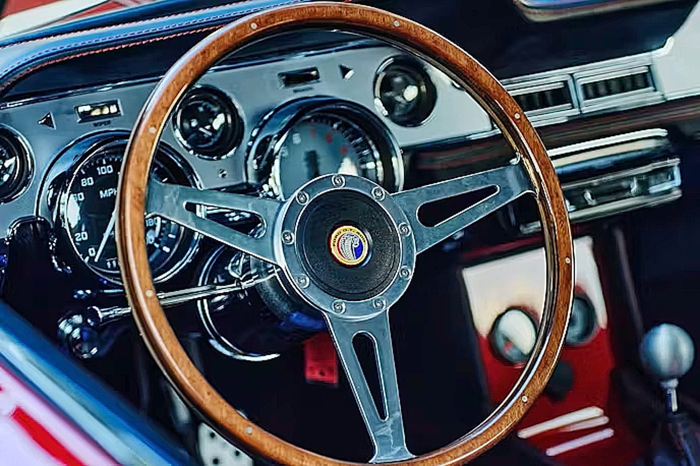 Cela afin de stabiliser les températures d’admission sous charge soutenue et de maintenir des performances constantes, lesquelles sont encore stabilisées par un système d’injection électronique Holley qui gère le carburant et l’allumage, garantissant ainsi que le petit bloc à double suralimentation vole comme un papillon et pique comme une abeille. L’habitacle modernisé, habillé de cuir noir à surpiqûres rouges, est doté de cadrans Classic Instruments gris.