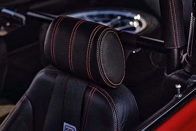 C’est un clin d’œil à l’héritage Shelby empreint d’une allure résolument moderne. Des détails comme le bouchon de réservoir inspiré du Mans, les vitres teintées grises, l’arceau de sécurité sur mesure et les badges GT500 Twin-Supercharged apportent une touche personnalisée à cette création. À l’intérieur, l’habitacle reflète la même philosophie. La sellerie en cuir noir, rehaussée de surpiqûres rouges, offre un contraste saisissant.