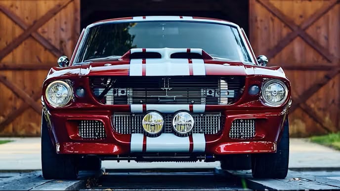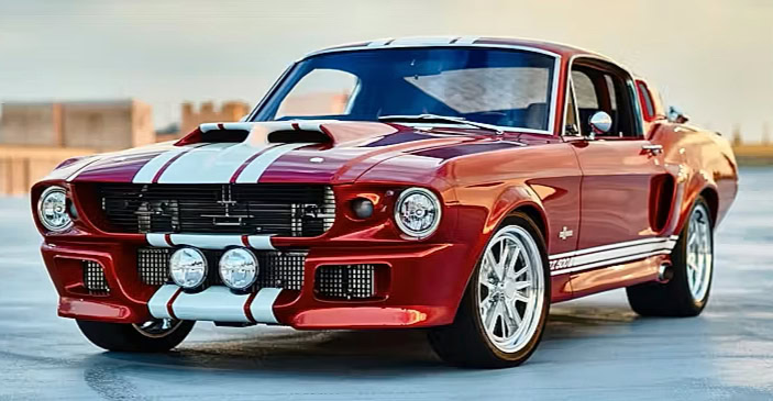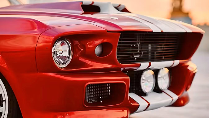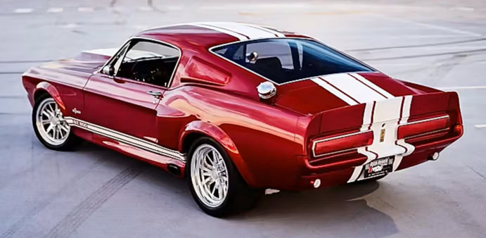 Sa silhouette est prétendue “indéniablement Shelby”, ce qui est faux car aucune Shelby n’était telle qu’elle se prétend devenue, mais son allure distingue immédiatement ce bolide de 1967 du modèle de série. Plus basse, elle est chaussée de pneus modernes plus larges. Cette transformation ne prétend pas être une restauration pour concours, elle s’appuie plutôt sur le look approximatif d’une Shelby GT500 “Continuation” aboutissant à une fantaisie délurée.