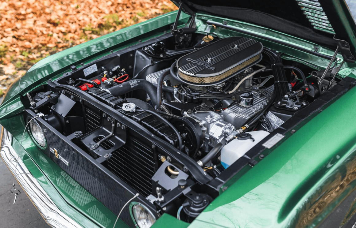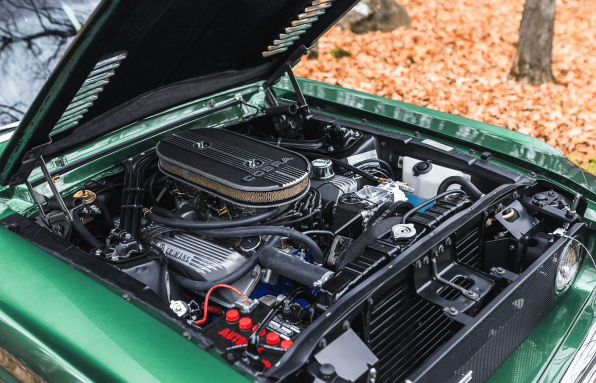 Elle s’avère être dans une spécification impressionnante et rarement vue, signalée par les experts de la marque Shelby comme l’un des six exemples de la GT500 produite pour 1967 avec une transmission manuelle à quatre vitesses, la climatisation “usine” et la fameuse peinture Dark Moss Green, dont seulement trois sont connues pour survivre dans cette couleur étonnante avec un intérieur en vinyle noir. Alimentée par un V8 428ci Cobra, première année d’utilisation par Shelby pour le big bloc très convoité. La restauration, primée, a été exécutée par des spécialistes de la marque, d’ou un “Prix d’or au Concours SAAC 47 en juin 2022”, vraisemblablement offert compte-tenu du montant stratosphérique que le proprio a du payer au carrossier/restaurateur…