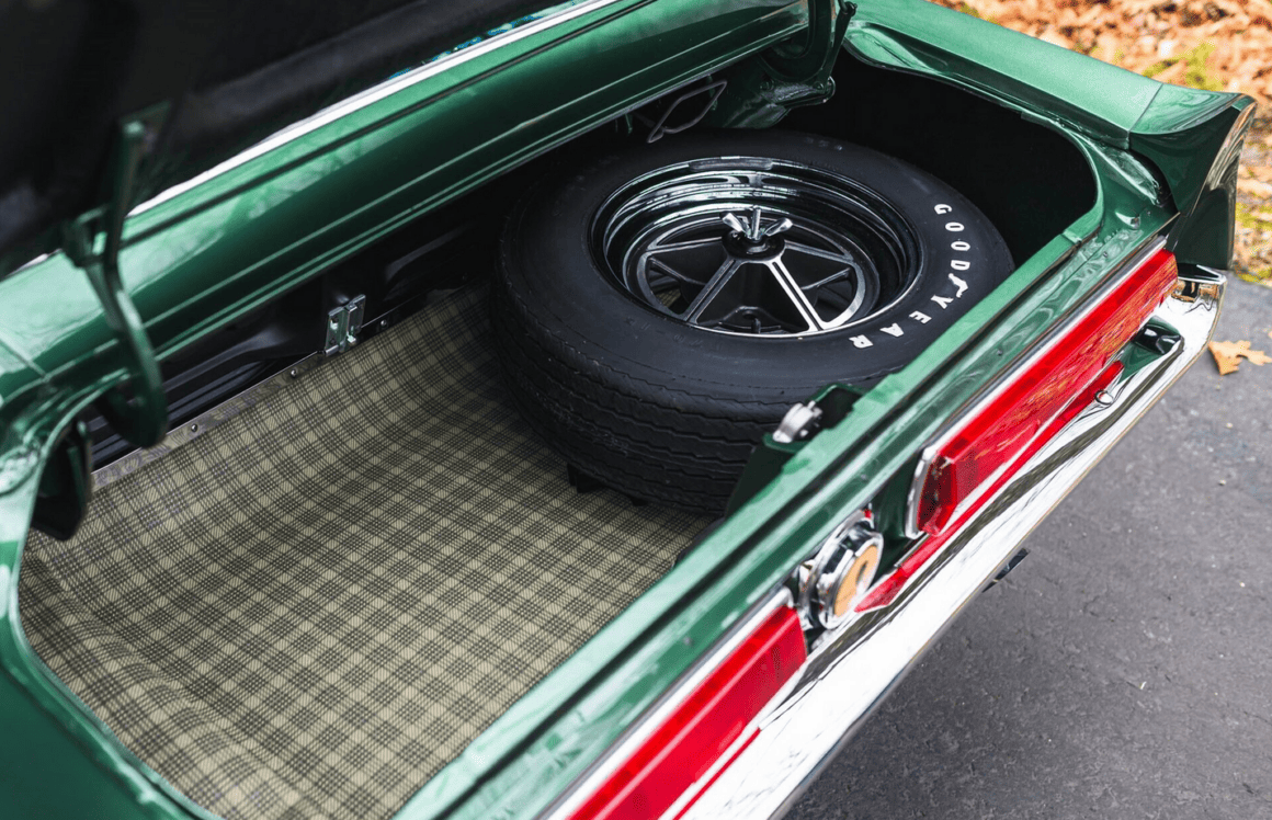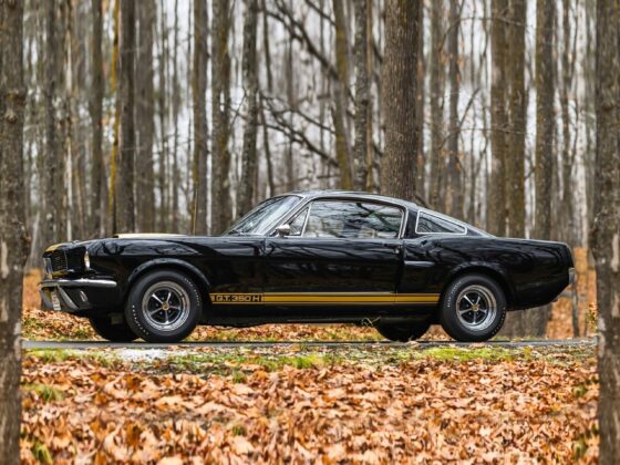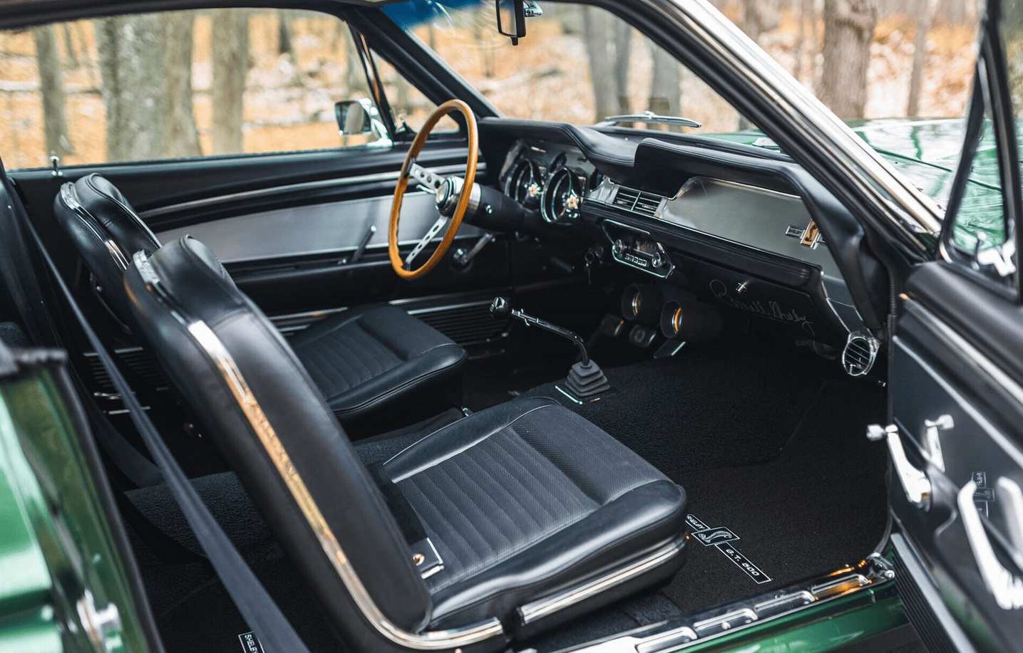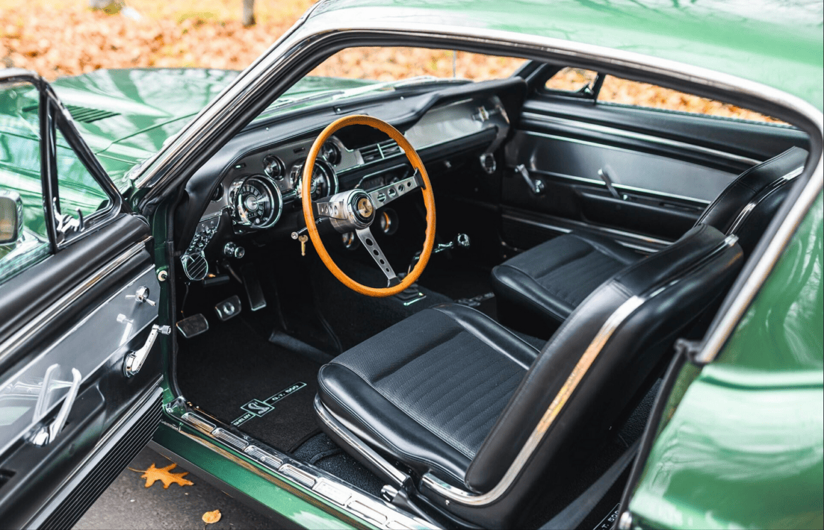 L’intérieur en pur vinyle noir est par contre rarement vu comme étant une distinction exceptionnelle, sauf par les collectionneurs de ces modèles… Le dossier fourni à l’appui de la vente Sotheby’s comporte les correspondances de plusieurs experts de la marque Shelby notant que cette voiture est l’une des 43 construites en 1967 avec une transmission manuelle à quatre vitesses et une climatisation montée en usine, dont six seulement ont été peintes cette couleur étonnante et dont trois sont censés rester existantes. Pour se plier aux lois du consumérisme, est indiqué que la configuration de la bête est “impressionnante” car bénéficiant en outre d’options d’usine détaillées répertoriées sur une copie d’accompagnement de son ordre de vente original.