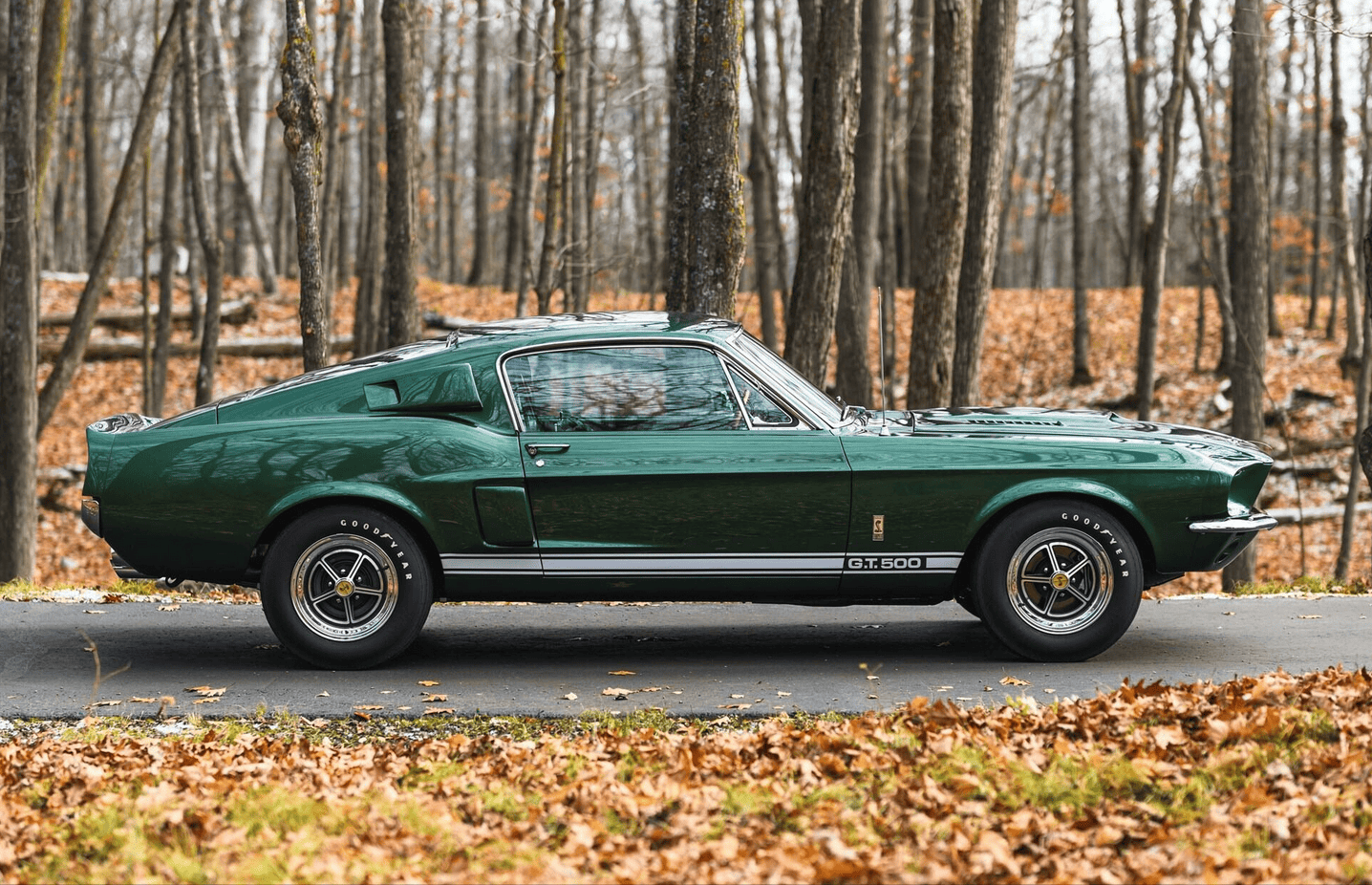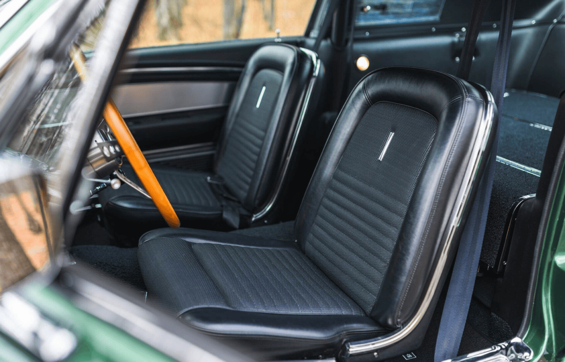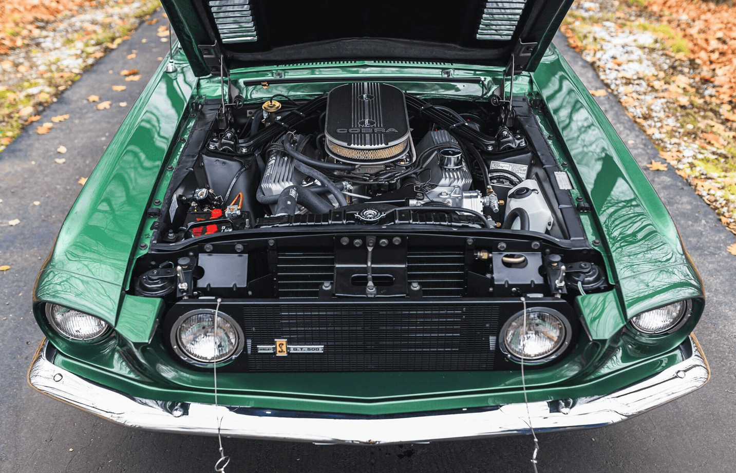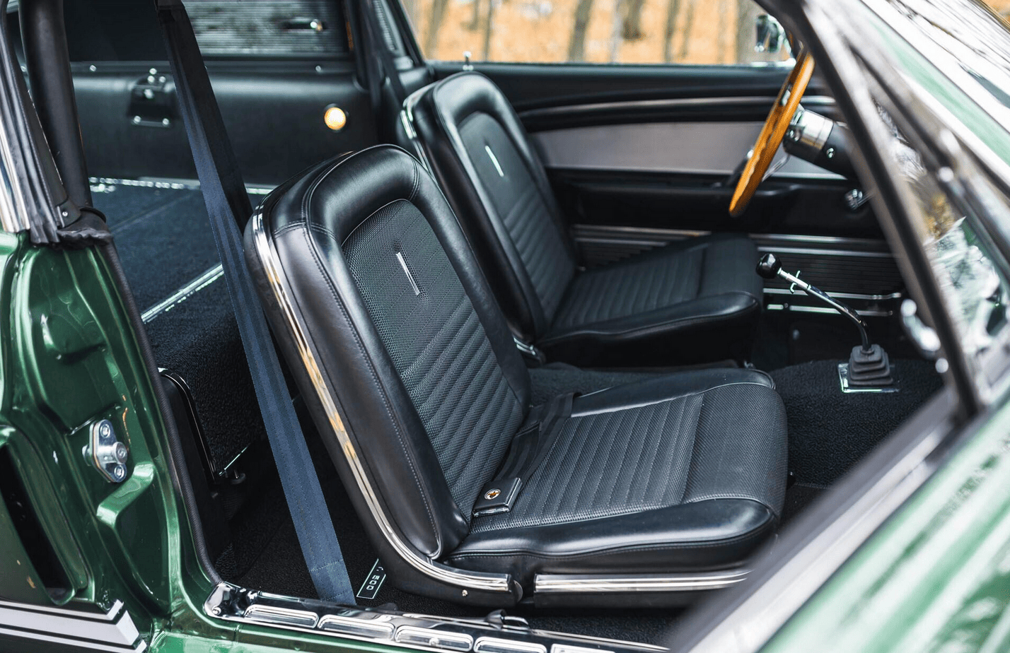 La GT500 avait un nez spécial avec une sorte de cuillère-mesure unique dans sa Gueule/Calandre et des feux de route montés au dedans de la calandre, ce qui a offert à la Shelby Mustang un comportement inoubliablement agressif, limite dangereux… À l’arrière, un becquet a été ajouté. En outre, des entrées d’air d’air ont été ajoutées dans les flancs en avant des roues arrière. Ils ne servaient qu’à l’esthétique dit “de la complexification”... Des ceintures d’insécurité avec des harnais d’épaule en rouleaux d’inertie ont complété l’arôme de compétition “potentielle” de la voiture. Un pur piège à cons, dans lequel je suis tombé plusieurs fois… Cette GT500 de 1967, fraîchement restaurée et primée, est finie dans sa combinaison de couleurs originales Dark Moss Green…