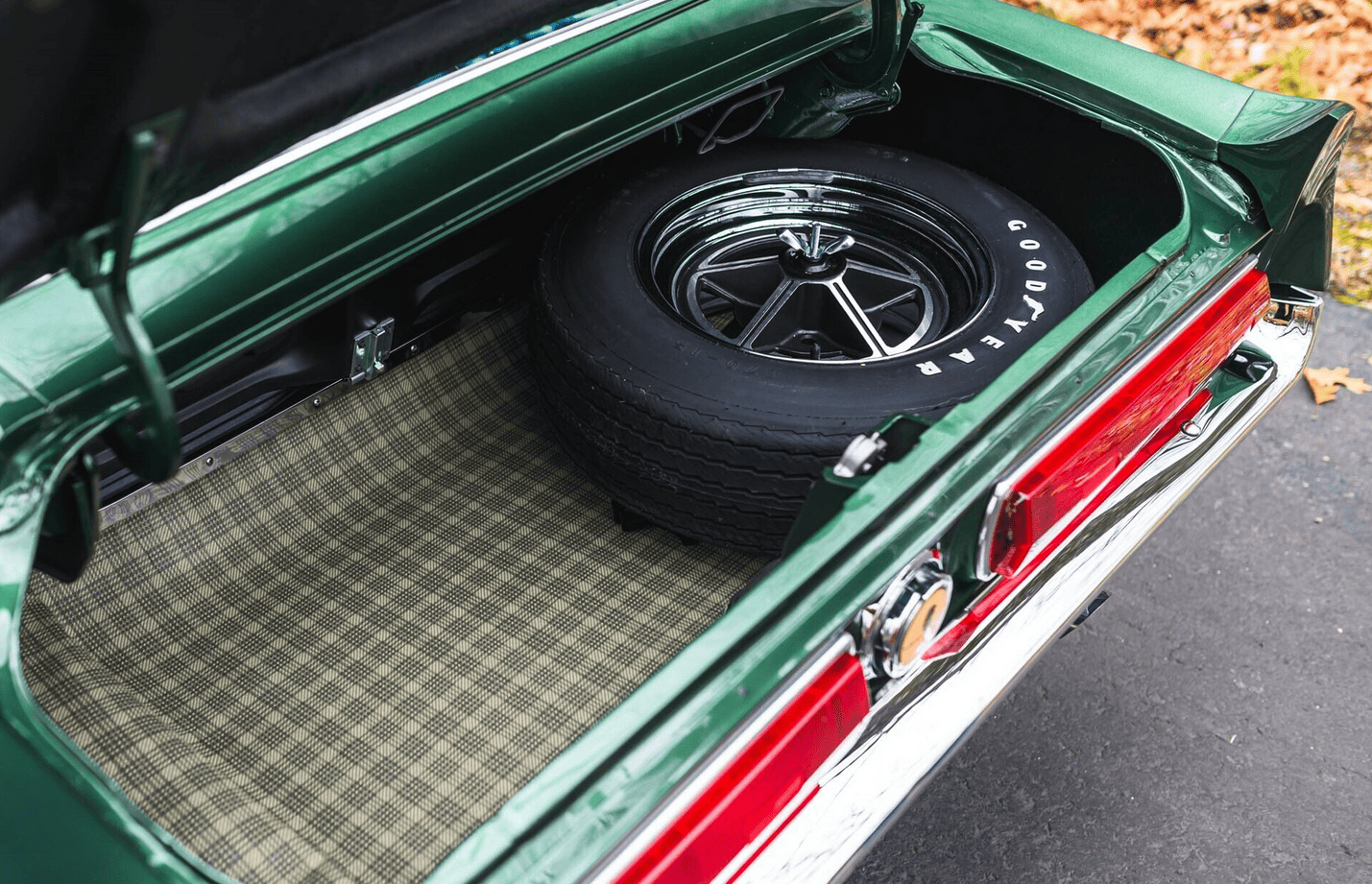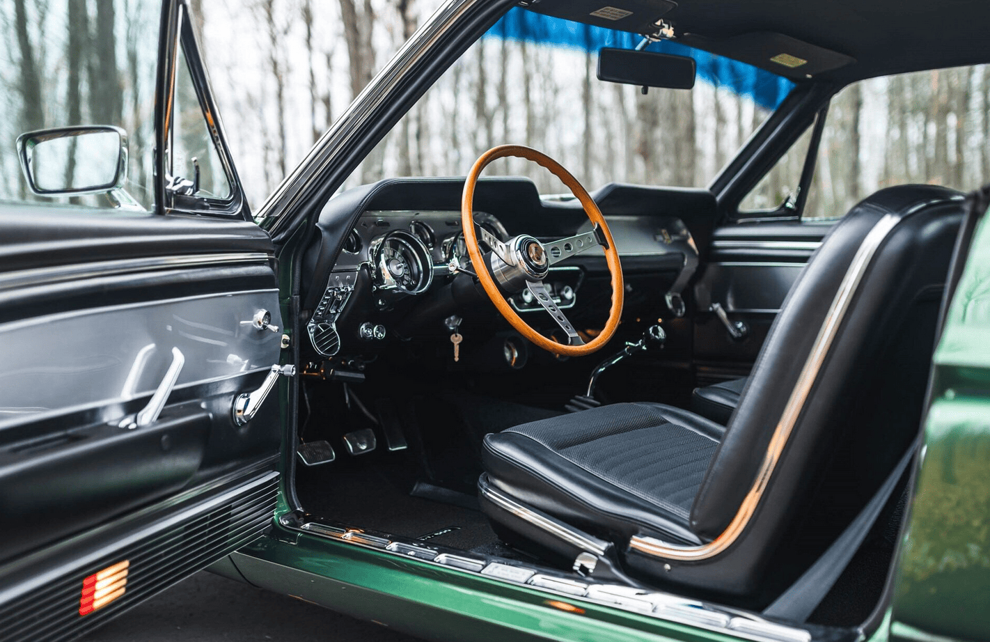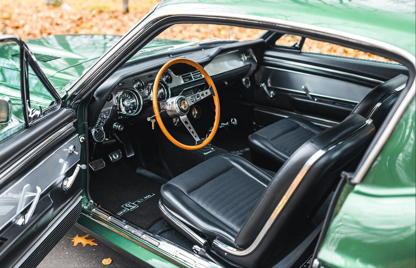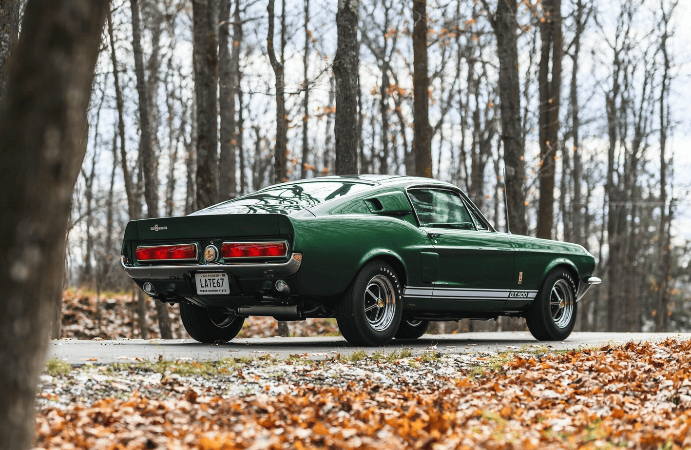 La GT500 avait un nez spécial avec une sorte de cuillère-mesure unique dans sa Gueule/Calandre et des feux de route montés au dedans de la calandre, ce qui a offert à la Shelby Mustang un comportement inoubliablement agressif, limite dangereux… À l’arrière, un becquet a été ajouté. En outre, des entrées d’air d’air ont été ajoutées dans les flancs en avant des roues arrière. Ils ne servaient qu’à l’esthétique dit “de la complexification”... Des ceintures d’insécurité avec des harnais d’épaule en rouleaux d’inertie ont complété l’arôme de compétition “potentielle” de la voiture. Un pur piège à cons, dans lequel je suis tombé plusieurs fois… Cette GT500 de 1967, fraîchement restaurée et primée, est finie dans sa combinaison de couleurs originales Dark Moss Green…