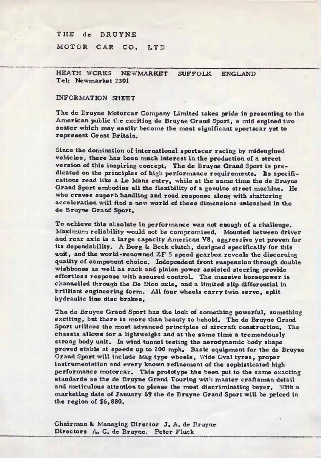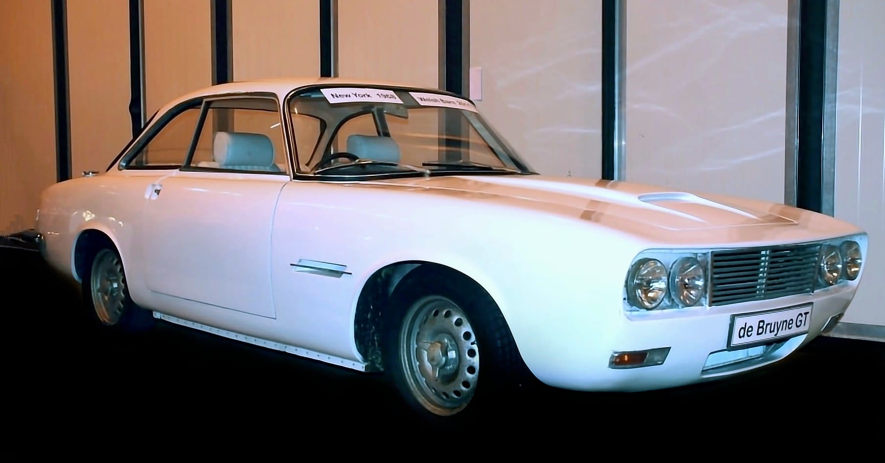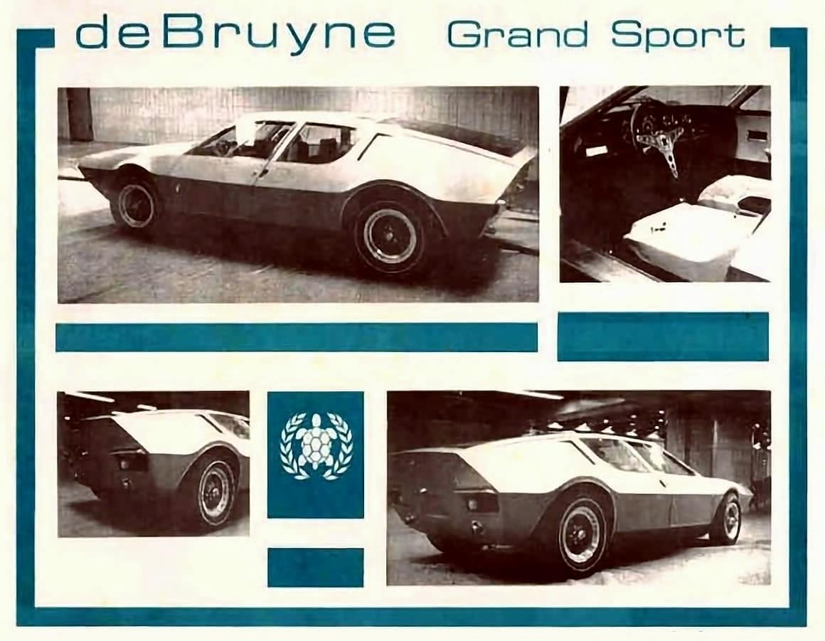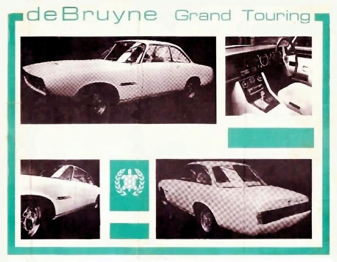 Deux voitures badgées “de Bruyne” sont fabriquées puis présentées au Salon de New York 1969. L’une étant l’ex Gordon Keeble nommée “de Bruyne GT” avec un relifting des faces avant et arrière et l’autre étant un nouveau coupé futuriste “Gran-Sport” tout en angles vifs et moteur central. Très peu de gens ont pu les voir… En exclusivité planétaire, je publie donc ici les seules photos au monde existantes de la construction de ces voitures uniques…, de même que les communiqués de presse de l’époque… et les brochures !