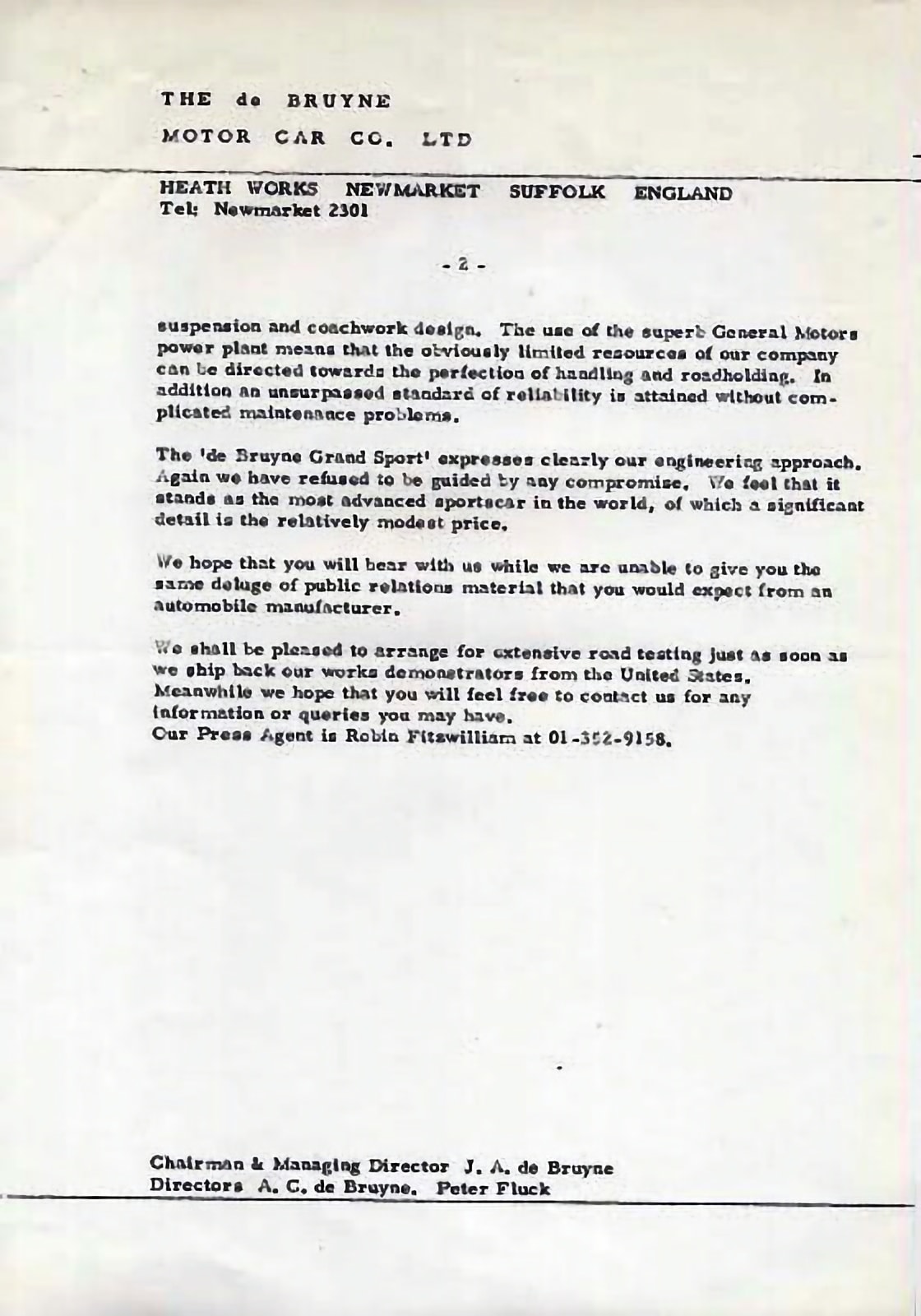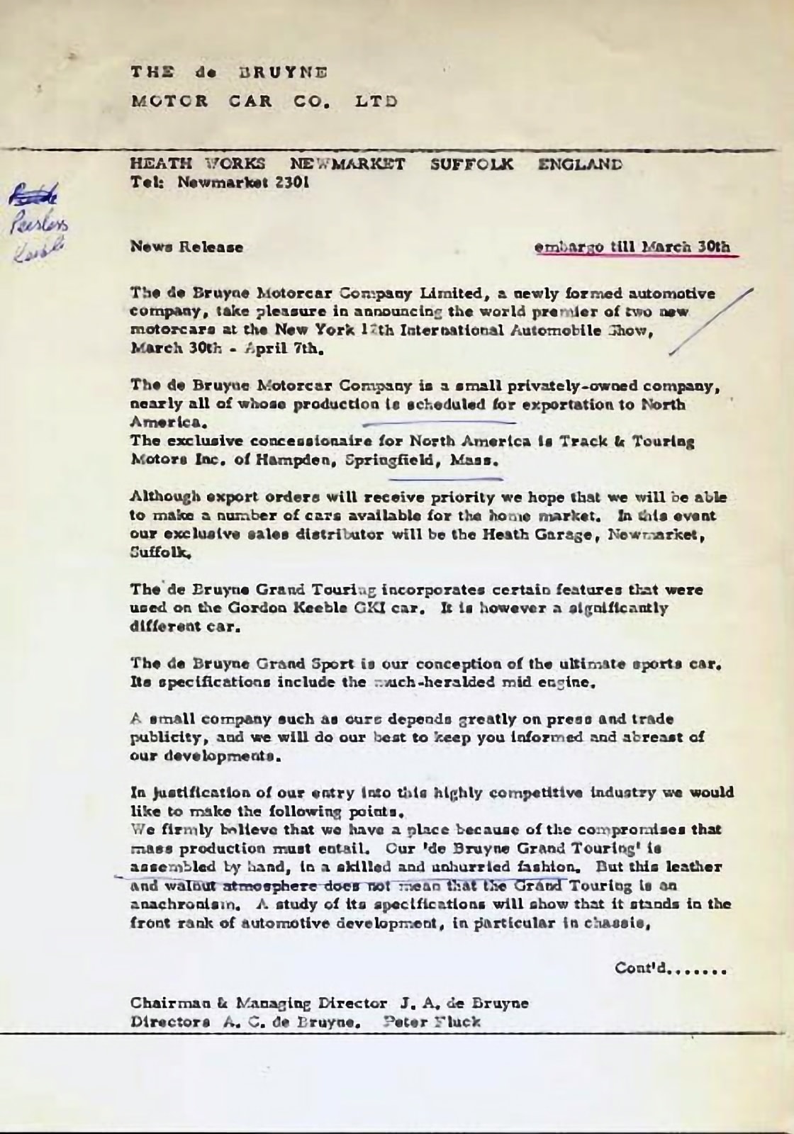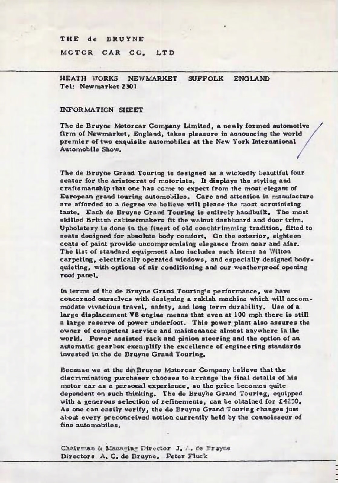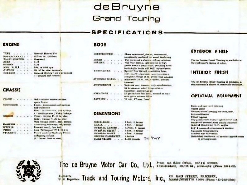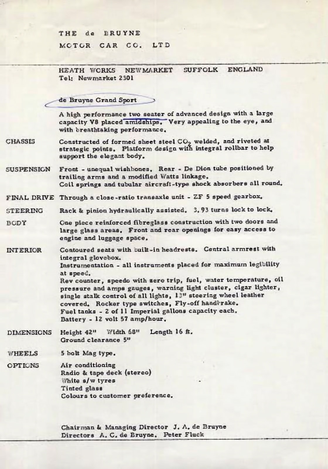 Deux voitures badgées “de Bruyne” sont fabriquées puis présentées au Salon de New York 1969. L’une étant l’ex Gordon Keeble nommée “de Bruyne GT” avec un relifting des faces avant et arrière et l’autre étant un nouveau coupé futuriste “Gran-Sport” tout en angles vifs et moteur central. Très peu de gens ont pu les voir… En exclusivité planétaire, je publie donc ici les seules photos au monde existantes de la construction de ces voitures uniques…, de même que les communiqués de presse de l’époque… et les brochures !