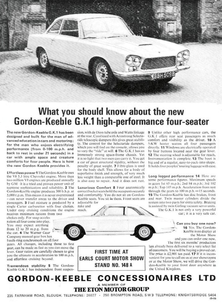 La production s’est poursuivie sous les tentatives successives de sauver l’entreprise, s’arrêtant finalement après la construction de 99 voitures. La 100e voiture a été expédiée en pièces pour être assemblées par B.C. & H. Motors à Londres. Malgré la disparition de la société Gordon-Keeble, les voitures ont continué à passionner les propriétaires. En 1969, Ernie Knott, propriétaire d’une entreprise de carrosserie et de réparation à Brackley, a acheté son G.K.1 ce qui l”a amené à acquérir la majorité des pièces de rechange laissées à la suite de la liquidation. Il voulait les offrir aux autres propriétaires !