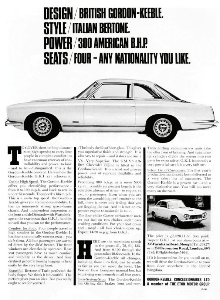 La Gordon-Keeble avait des phares très particulier légèrement inclinés en forme d’œil chinois (Chineese eyes), un design qui sera ensuite copié et utilisé par quelques autres marques européennes : Lagonda Rapide, Lancia Flaminia, Rolls-Royce et Peugeot pour la 504. La voiture a ensuite été présentée sur le stand Bertone en Mars 1960, au Salon automobile de Genève. Des problèmes avec les livraisons de pièces avaient retardé la construction, la voiture a donc été finalisée par Bertone à une vitesse vertigineuse… en 27 jours !