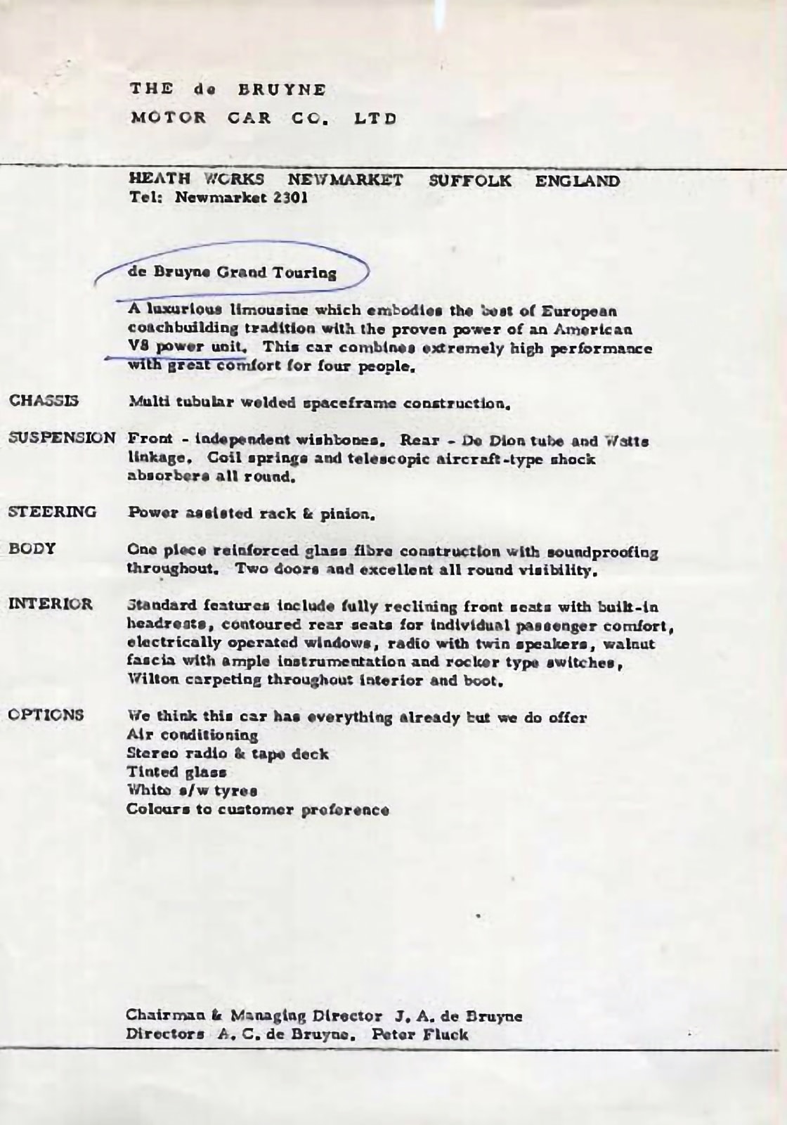 La de Bruyne Grand Touring est le seul modèle qui été construit en 1968 (avec un re-lifting) en suite de la Gordon Keeble GT (100 exemplaires), après sa disparition en 1967. Ma découverte de cet exemplaire rarissime est en cause d’un site de vente aux enchères ou ce véhicule était présenté à un prix très raisonnable compte tenu de sa rareté et de son état exceptionnel. Malheureusement, je suis arrivé trop tard, la voiture venait d’être vendue à un producteur de télévision Britannique pour le prix de £ 10,350 (US$ 16,430) en seulement 5 enchères !