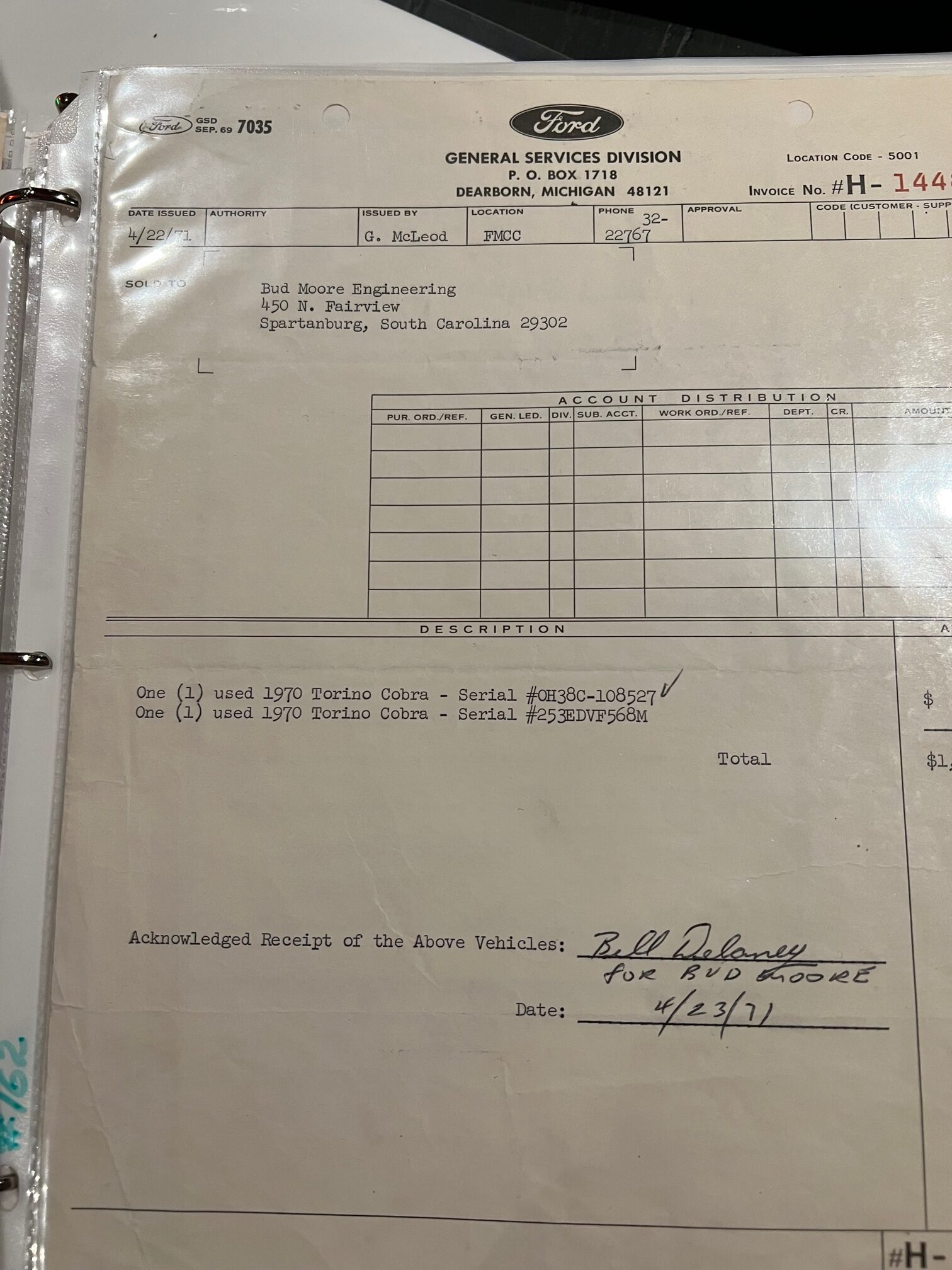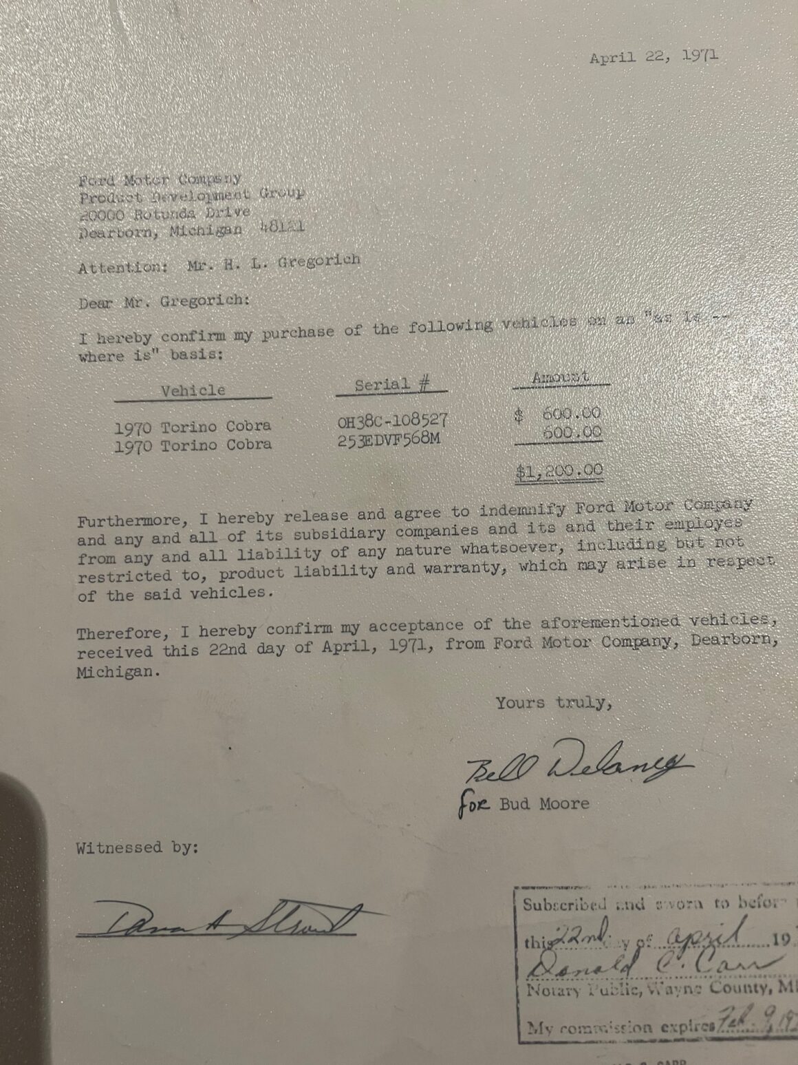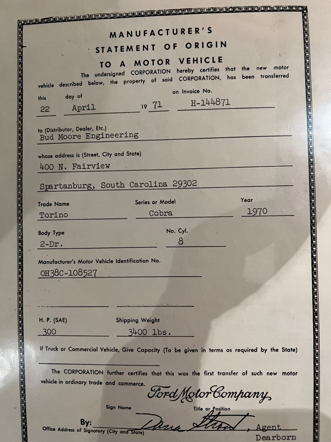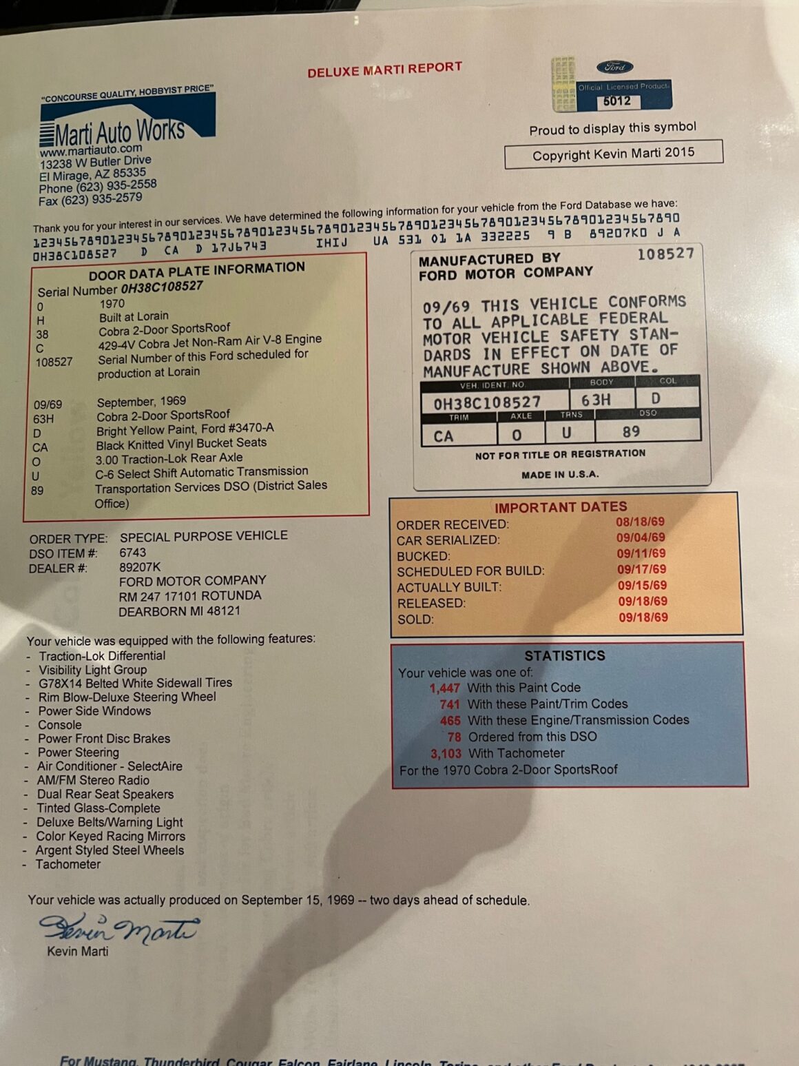La bête est documentée avec une copie de l’OSM original, l’acte de vente original et la facture originale de Ford à Bud Moore Engineering, les enregistrements d’immatriculation et les reçus d’inspection de Caroline du Sud au nom de Bud Moore, documentant le “Mileage” réel certifié, avec les actes de ventes certifiés authentiques de 2008 de Bud Moore à Jacky Jones et de Jacky Jones à Brett Torino. Cette documentation est complétée par un rapport Marti officiel avec cachets, tampons et signatures, un manuel du propriétaire, une carte du propriétaire et l’autocollant de porte original du fabricant Ford, qui, sous blister, est toujours intact !