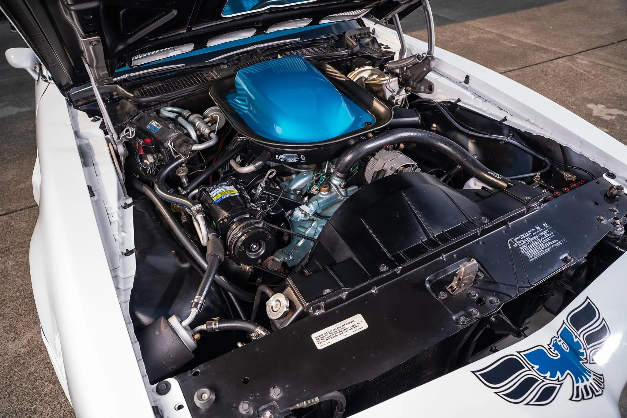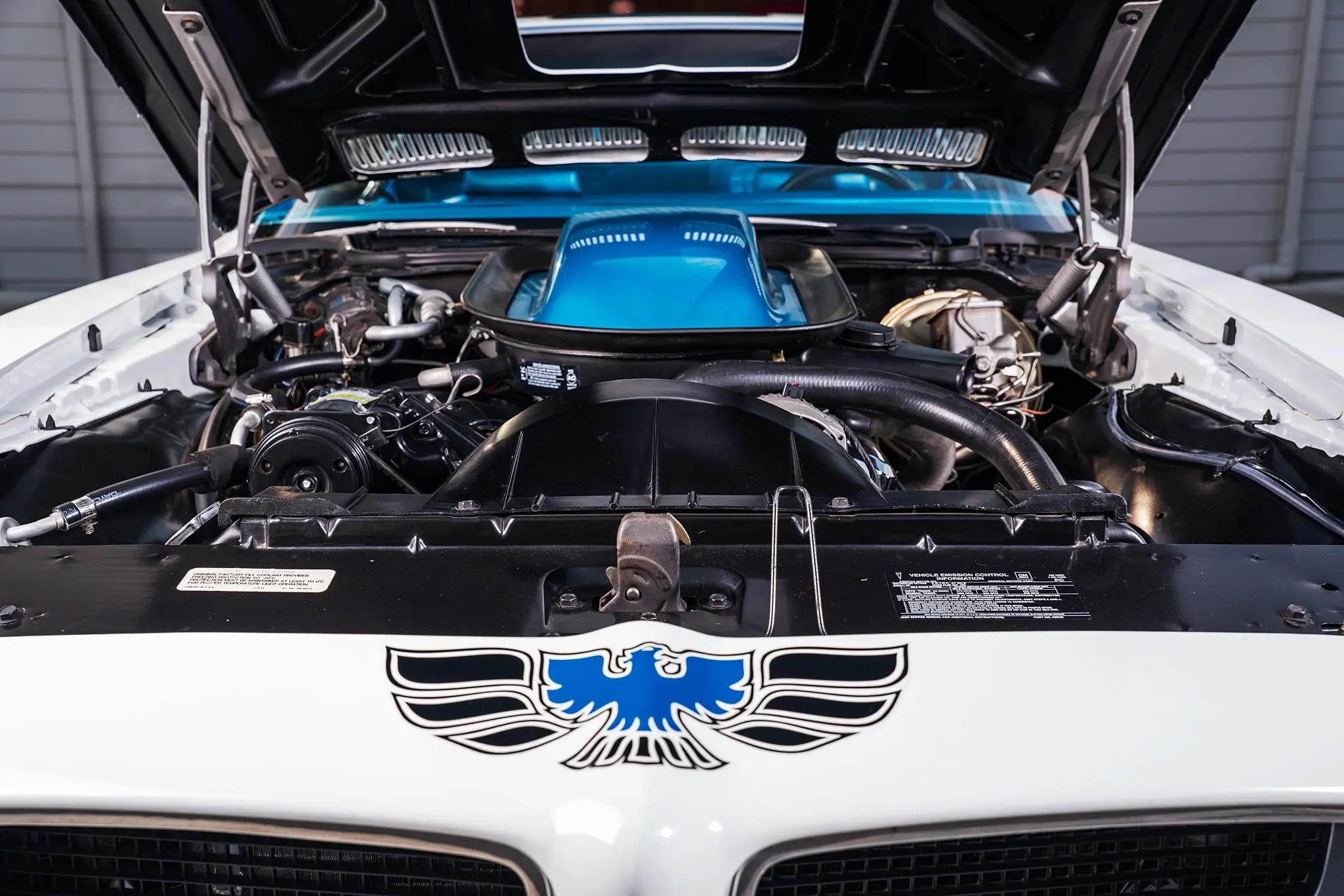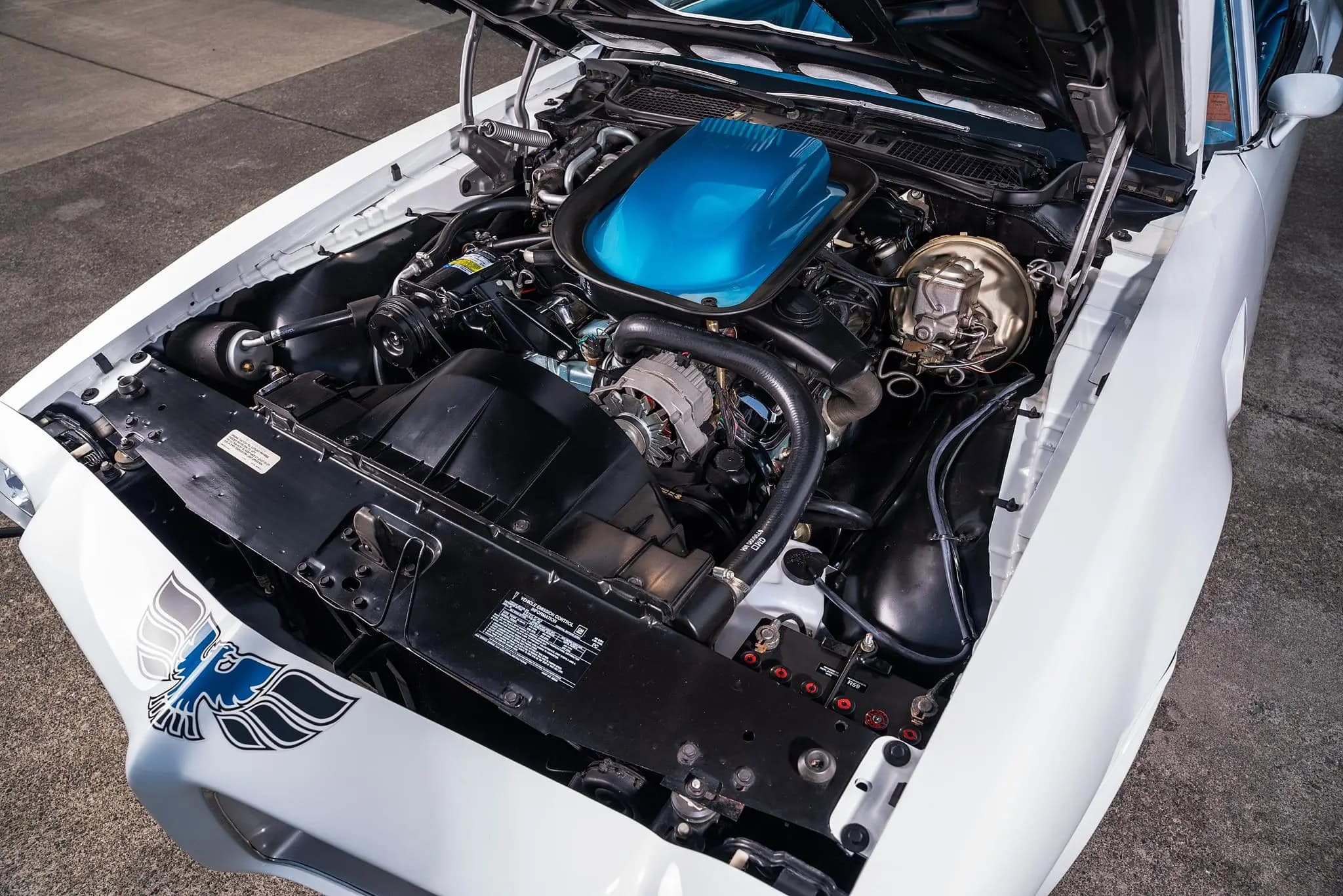 Des ressorts et amortisseurs renforcés, ainsi que des barres stabilisatrices plus larges, lui conféraient une tenue de route nettement supérieure à celle d’une Firebird de base. La Trans Am était conçue pour une conduite sportive et prévisible, et non pour des démarrages fulgurants. Le système de freinage reflétait cette même philosophie. La Trans Am de 1970 était équipée de série de freins à disque avant assistés et de freins à tambour arrière, une configuration qui offrait des performances de freinage supérieures aux systèmes à tambours uniquement encore courants à l’époque. Le refroidissement et la durabilité étaient également des éléments essentiels. Des prises d’air fonctionnelles sur le capot permettaient de gérer la température sous le capot.