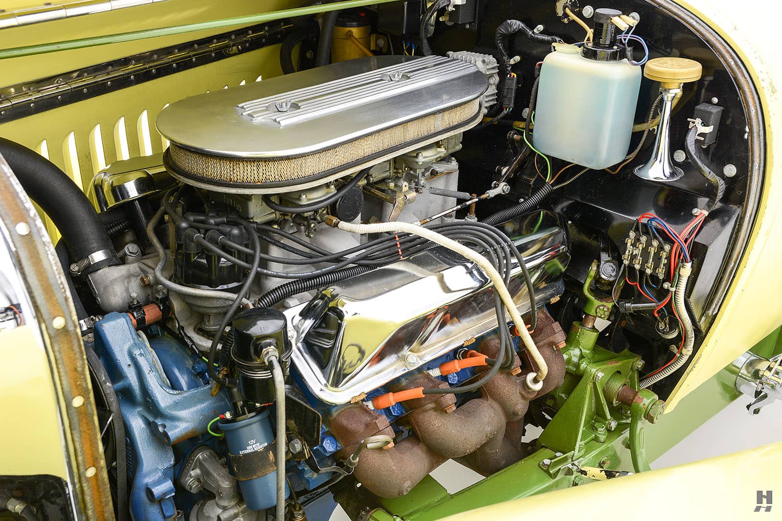 Bien sûr, rien d’autre que de grandes jantes à fils (rayons) donneraient la bonne apparence… et les Rugers se sont tournés vers Borrani pour fournir des jantes de 18 pouces. La puissance provenait de l’un des plus gros moteurs V8 des années ’60, le puissant 427ci de Ford, développant 425 chevaux, équipé de carburateurs à 4 corps, l’ensemble étant soutenu par une boîte de vitesses manuelle à quatre vitesses. Le châssis a ensuite reçu une carrosserie évocatrice des années trente, mais construite en fibre de verre renforcée avec un matériau vinyle surcollé, reprenant les techniques de la GM pour la Corvette.