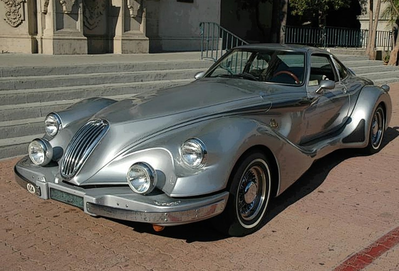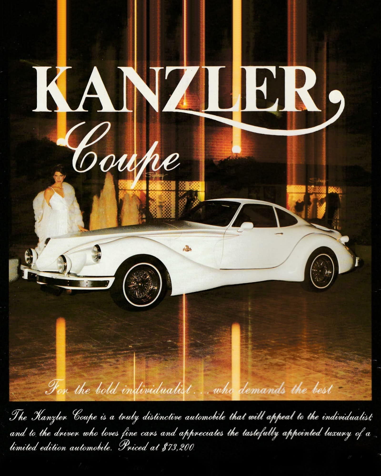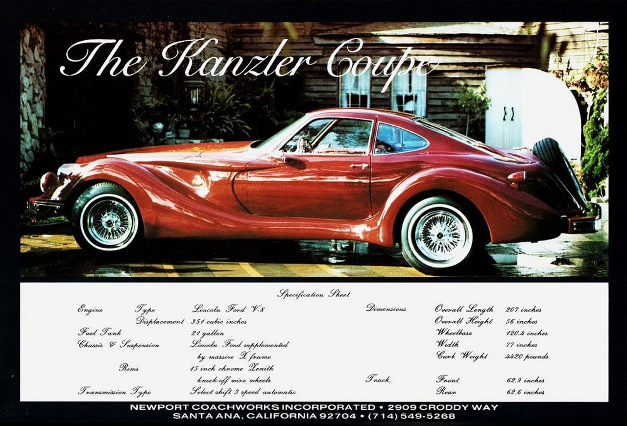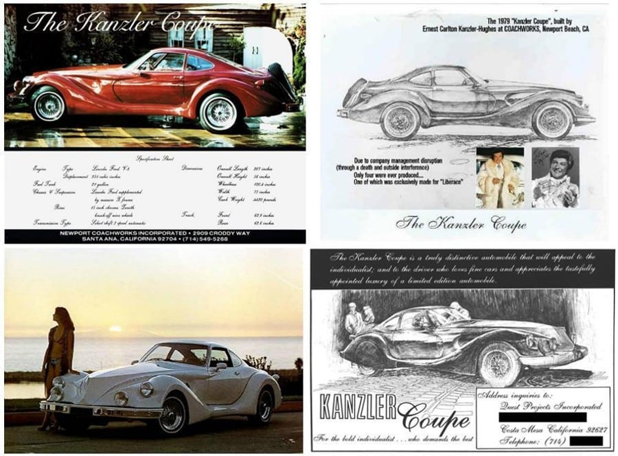 Ernest “Ernie” Kanzler s’afficha d’emblée aux USA comme un “Designer” de talent (il y a de quoi pleurer jusqu’à la fin des temps) et fit construire son “oeuvre” par la carrosserie Newport Coachworks en Californie. Kanzler voulait produire une série de 250 véhicules numérotés, comme le faisait Alain Clénet, mais seulement 7 furent construits avant que la Kanzler & co ferme ses portes définitivement en 1979, juste après avoir vendu une voiture au célèbre Liberace…