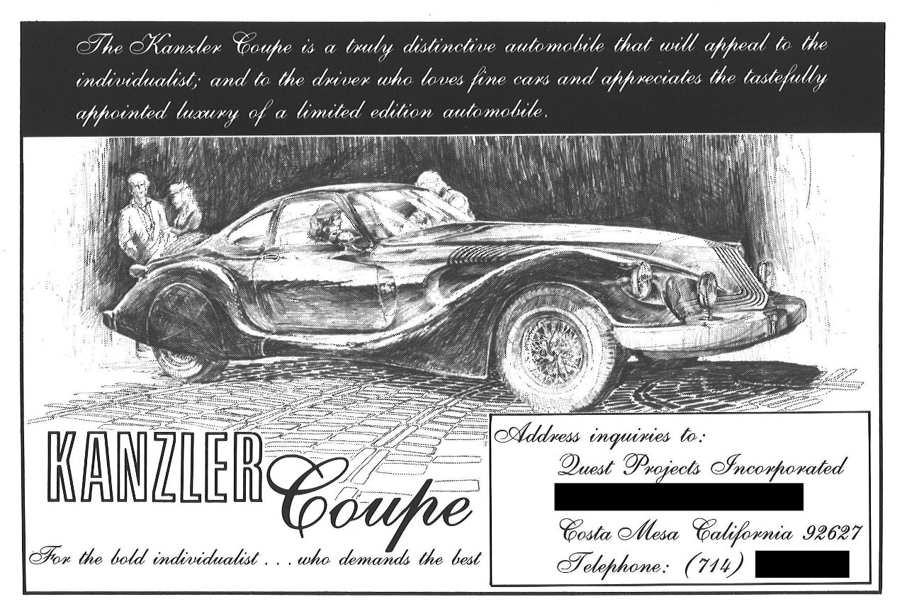 Le coût d’achat d’un coupé Kanzler était de 73 000 $ (en dollars de 1980), l’équivalent de 265.000 $ USD aujourd’hui, une somme importante pour une voiture d’un constructeur automobile inconnu et non éprouvé, basée sur un châssis Lincoln avec une carrosserie Opel GT modifiée, le tout “à-la-manière d’Alain Clénet”… Concernant cette épave on ne sait pas exactement ce qui lui est arrivé ni où et avec qui elle a passé sa vie et se trouvait, en fait, il est apparu que ce véhicule, est le troisième coupé Kanzler, qui avait été perdu à jamais dans l’histoire, mais est soudainement apparu en vente sur eBay à partir d’un dépotoir/casse automobile de Sun Valley, en Californie.