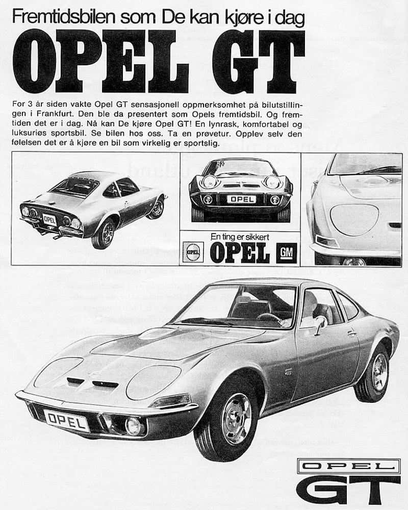 En 1971, à la suite de régularisations concernant les émissions, Opel réduisit le taux de compression du moteur 1900 USA, ce qui fit retomber la puissance de ce moteur à 83 ch (SAE). Il y eut également un modèle GT/J (Junior), qui était une version européenne de la 1900 GT moins onéreuse, une version à transmission automatique (3 vitesses) était cependant disponible avec le moteur 1900 cm³, quoique l’Opel GT était équipée d’une transmission manuelle à 4 rapports. La production de l’Opel GT s’étendit entre 1968 et 1973, elle était équipée d’un châssis monocoque métallique et d’un moteur longitudinal à l’avant, avec transmission aux roues arrières. Le moteur à arbre à cames en tête était monté très en arrière du châssis pour améliorer la répartition.