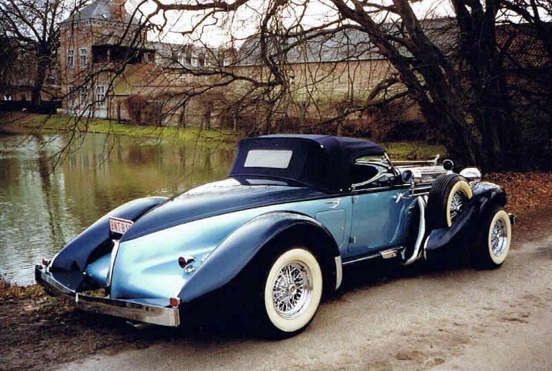 – Deux mots de l’authentique Speedster. C’est donc Gordon Buehrig qui a dessiné ce monstre en 1935. Le moteur était un 8 cylindres en ligne de 5000 cc qui développait soit 115 chevaux à 3.600 tr/mn, soit 150 chevaux à 4.000 tr/mn équipé d’un compresseur de marque Schwitzer-Cummins tournant à 24.000 tr/mn. La boîte était une trois vitesses non synchronisées et les freins hydrauliques. J’ajoute deux essieux rigides maintenus par des semi-elliptiques ! Pour la petite histoire, ou plutôt pour la grande, je rappelle que l’Auburn Speedster à compresseur fut la première voiture américaine à tourner pendant 12 heures à plus de 100 mph, soit à plus de 160 km/h ! Cette voiture avait donc une caisse de première beauté, mais aussi un caractère suffisamment distingué pour aller chatouiller le 160 chrono. La réplique, elle, c’est tout autre chose. Sur le plan mécanique, c’est d’abord et avant tout un châssis de Ford L.T.D., retravaillé dans tous les sens et même en biseau pour lui ajuster la caisse qui, je le répète, respecte les cotes d’origine. En commençant par l’arrière, on a un pont rigide, au milieu, une boîte automatique trois vitesses, puis le moteur proprement dit, un gros V8. II va sans dire que toute mécanique est adaptable”.