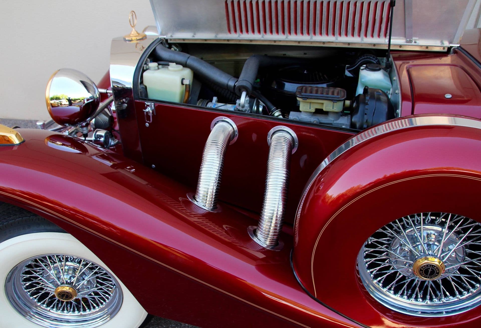 Direction assistée, freins assistés, vitres électriques, sièges électriques, climatisation et chauffage, système audio haut de gamme de Sony avec amplificateur Sony et haut-parleurs Sony, antenne radio électrique Sony et bien plus de Sony encore… Le look flamboyant des années trente peut être remarqué partout, des pneus à flancs blancs de style gangster, classiques, et de vraies jantes à rayons chromés en excellent état. Egalement de grands phares d’avant-guerre, deux phares chercheurs, plein de “trucs” partouze, deux roues de secours encastrées aux ailes, un double capot en aluminium (le reste est en polyester) et des pare-chocs en aluminium poli, très solides, une grande calandre de style Mercedes surmontée d’un ornement de capot Excalibur façon mascotte, 4 trompettes vintage, un feu antibrouillard central, des lattes de marchepieds en teck, un intérieur très propre, et un coffre très propre et modérément spacieux. La voiture pourrait en serrant les occupant(e)s, facilement accueillir 5 personnes, le grand compartiment arrière est d’ailleurs dans un état comme neuf, avec de nouveaux tapis, des nouveaux sièges en cuir véritable (sic !) et la banquette arrière itou…, Cette Excalibur est idéale pour les mariages ou autres événements chics incluant des diners et surtout des enterrements de première classe réservés aux pontifes qui furent pontifiants…
