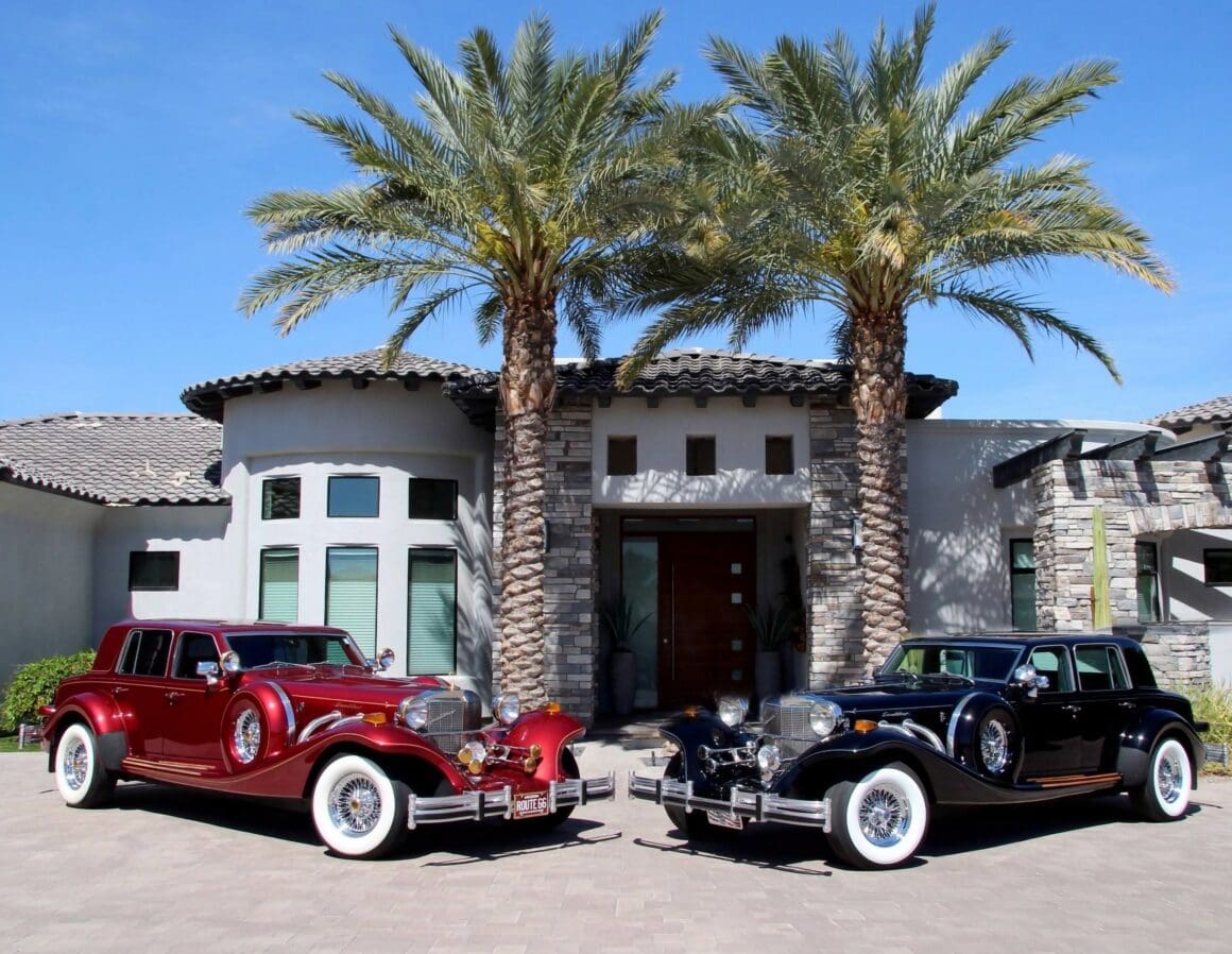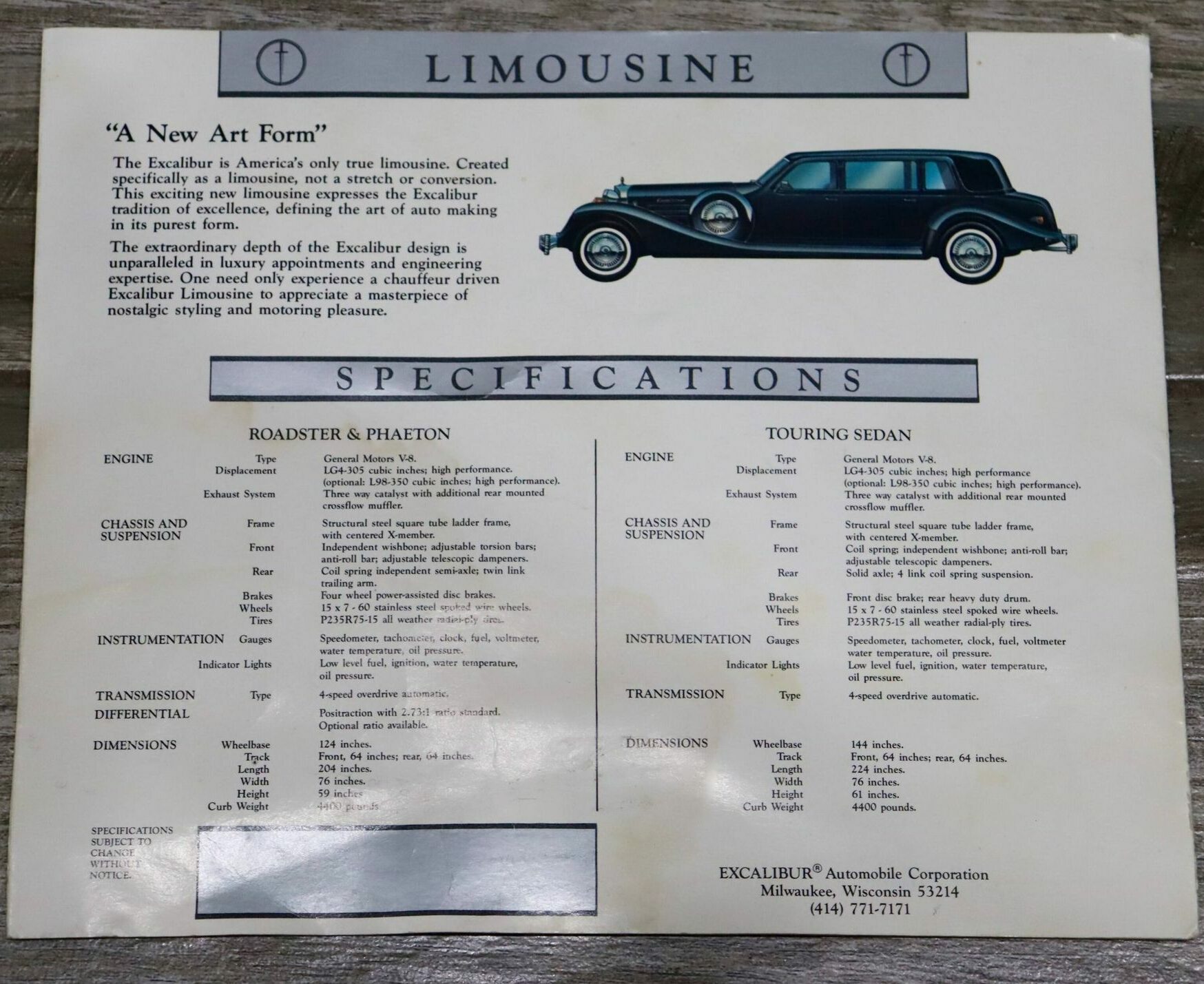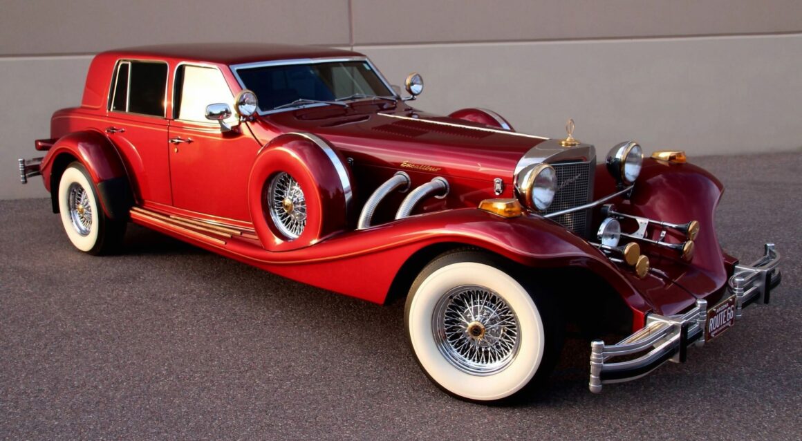 Sauf la première motorisée par un V8 Studebaker, toutes les suivantes disposeront d’un Small Bloc Chevrolet V8… Le vice-président de l’entreprise, fils de Brook…, William Stevens, a déclaré au New York Times en 1975 que leur produit était destiné à l’homme ou à la femme qui voulait une machine amusante avec une classe antique. Bigre… Quel souci du détail historique… Entre 1965 et 1989 divers types d’Excalibur’s ont été construites, attirant de nombreux propriétaires célèbres, dont Jay Leno, Arnold Schwarzenegger, Roberto Duran, Dick Van Dyke, Tony Curtis, Shirley Jones, Sonny and Cher, Dean Martin, Jackie Gleason, Paul Harvey, George Foreman, Steve McQueen et bien d’autres dont moi, en personne, qui en a eu (ou a été baisé par elles) une vingtaine, dont 10 en même temps… Je plaide coupable par vanité et inconscience de mes actes… J’étais jeune, riche, arrogant, j’avais préalablement possédé des Morgan’s et des Panther’s J72 et deVille ainsi que des Morgan’s et quantité de répliques… Je n’éprouve pas le besoin de vous en conter ici tout par le menu ni de vous conter la suite de l’histoire Excalibur qu’inclus la mise en production de toutes les séries et sous-séries, le début de la fin coïncidant avec la Séries V, la première faillite et la création de la Séries V 4 portes, de la Limo, des répliques de Cobra’s et des quelques successeurs en file indienne.