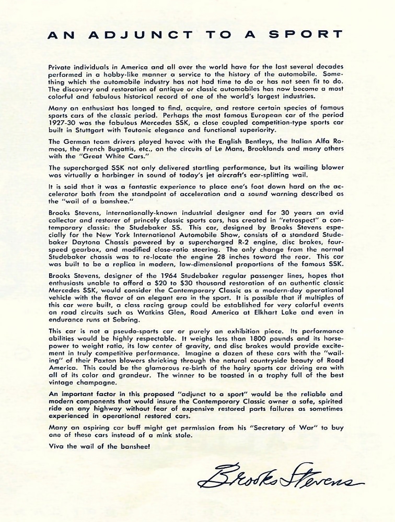 L’Excalibur-J était au départ une voiture de course, trois seront construites et quelques années plus tard elles ont terminé exposées dans le Musée de Brook Stevens. Dix ans plus tard, en 1961, Egbert McCulloch, qui venait d’être nommé président de Studebaker, a demandé à Brooks Stevens qu’il redessine la Studebaker GT Hawk, et fasse un “facelift” de la Studebaker Lark… tout en pensan à créer une nouvelle Studebaker sportive, un projet nommé “Avanti” sur lequel travaillait déjà Raymond Loewy. Va ainsi naître la Mercebaker, qui sera refusée au profit de l’Avanti de Raymond Loewy, suite aux pressions des dirigeants allemands de Mercedes…. Studebaker fait faillite peu de temps plus tard ce qui touche Brook Stevens dans ses finances, ce qui lui met en tête de fabriquer ce prototype avec le nom Excalibur de ces anciennes “J” d’il y a 10 ans, qui voit le jour sous la houlette de ses fils qui commencent sa fabrication et ses ventes en 1963/1964 à Milwaukee, Wisconsin. S’inspirant des lignes classiques d’avant-guerre des voitures de sport Mercedes-Benz Supercharged SSK de 1928. Pour minimiser les frais, “Papa Stevens” rachète 300 châssis Studebaker Lark dans la faillite de cette société… Les 300 premières Excalibur SSK ont donc été construites sur des châssis Studebaker récupérés/bricolés provenant de la faillite .