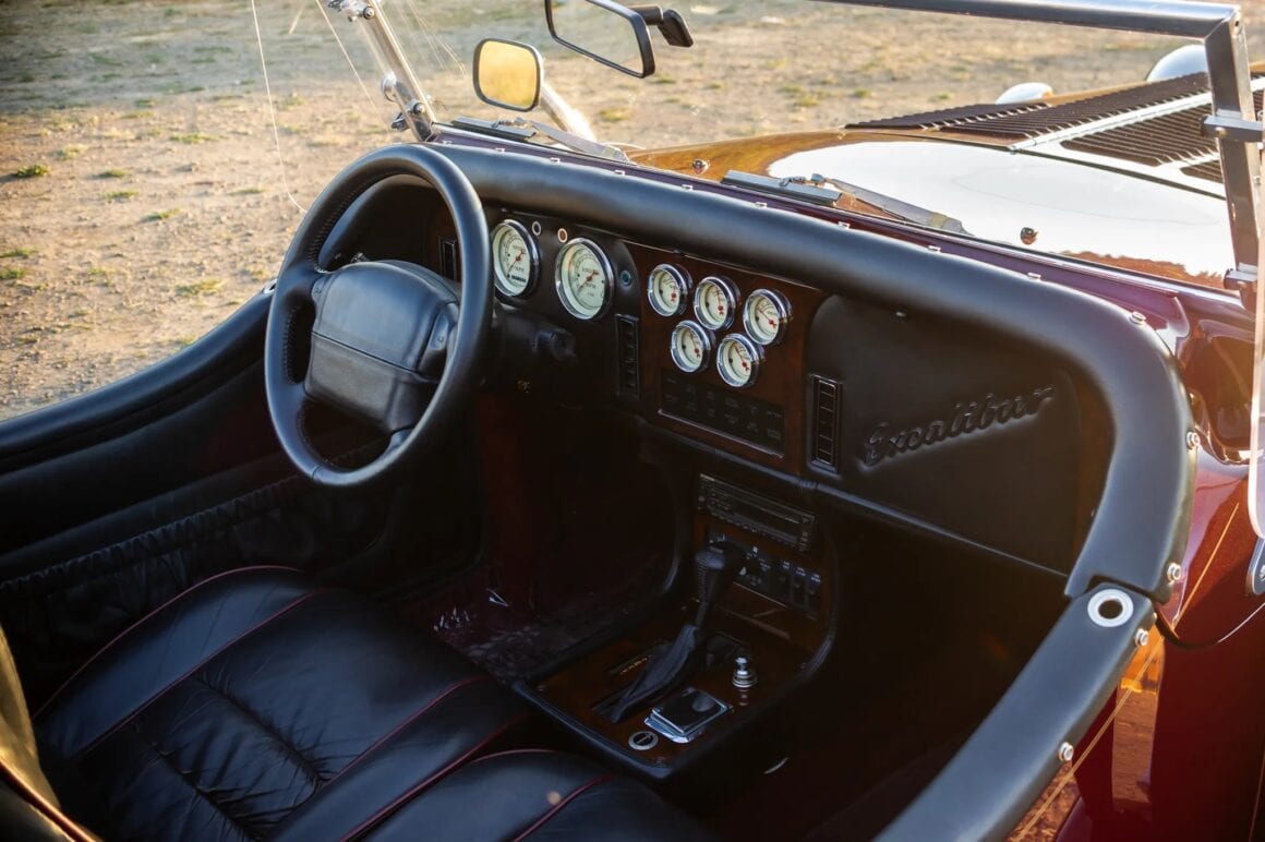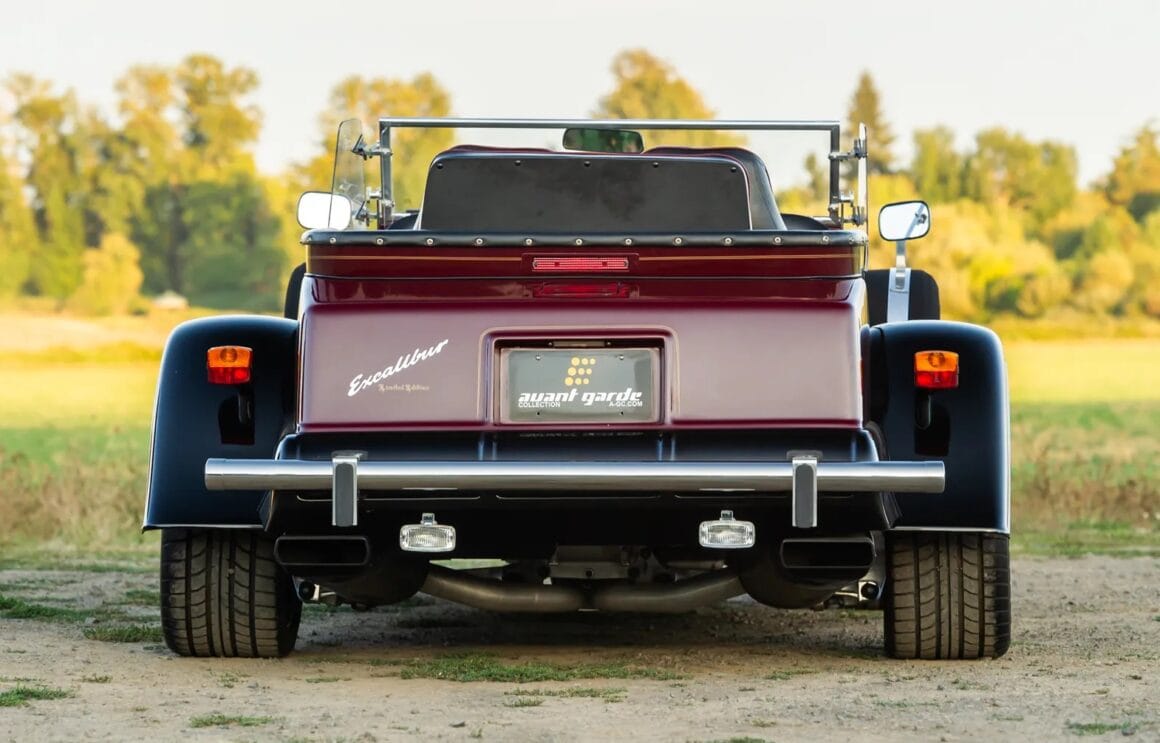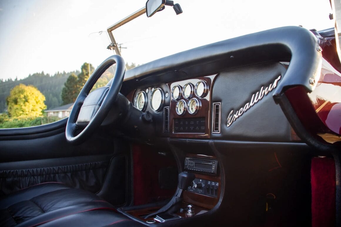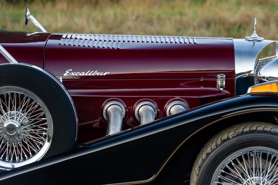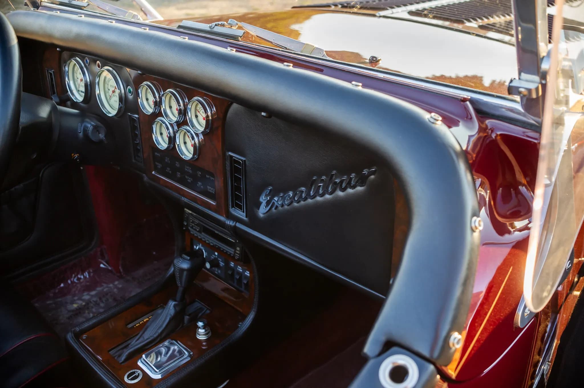 L’Excalibur a été produite à Milwaukee, dans le Wisconsin, avec des éléments de style inspirés du Roadster Mercedes-Benz SSK. Cet exemplaire est fini en bordeaux et noir, et l’équipement comprend une capote en toile noire, avec des panneaux latéraux assortis, des pare-chocs tubulaires, des marchepieds latéraux, un capot ventilé, des fausses sorties d’échappement latérales, ainsi que de faux klaxons. Les jantes à rayons polies de 17 pouces sont enveloppées de pneus BFGoodrich Comp T/A 275/40.