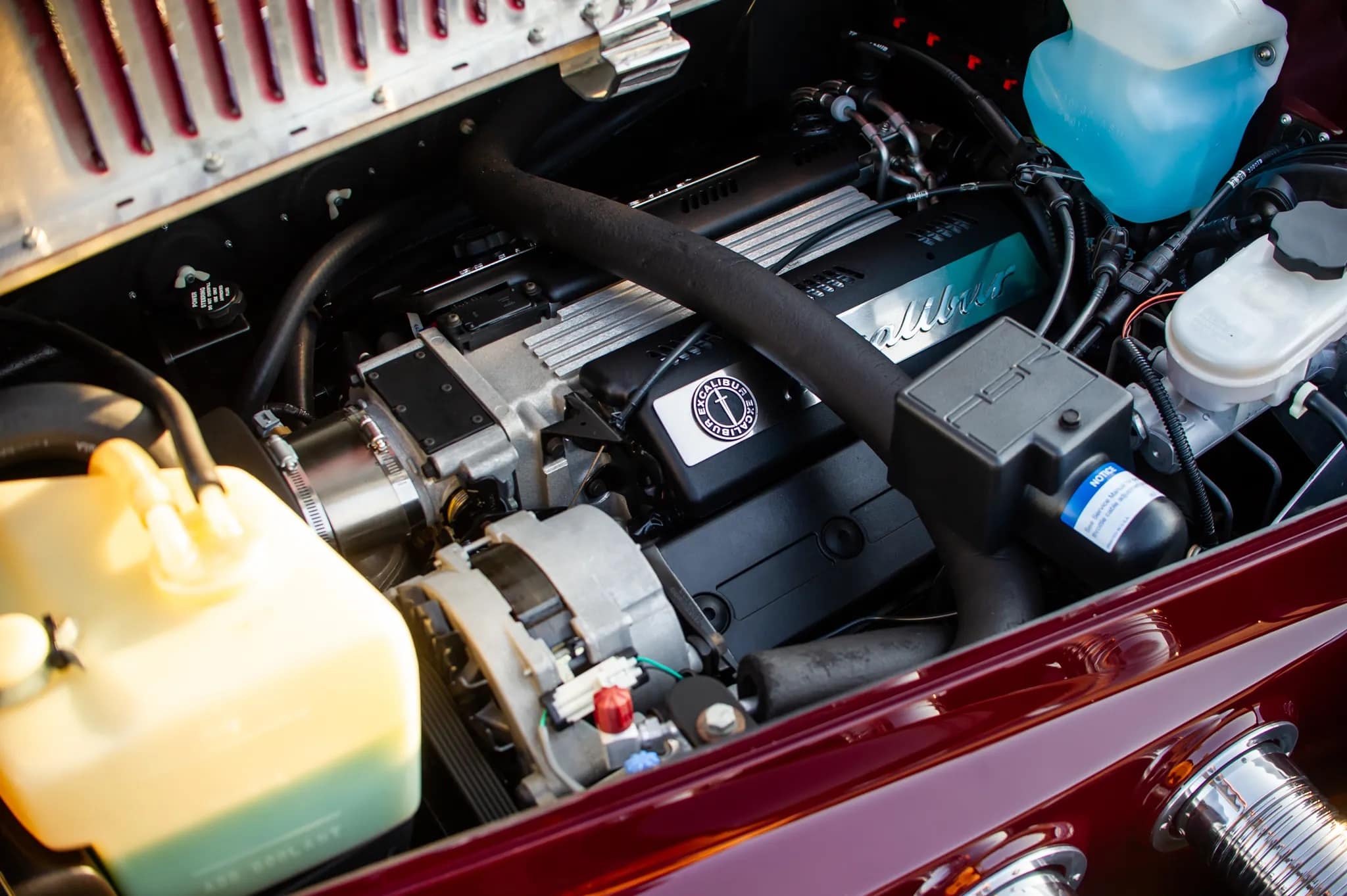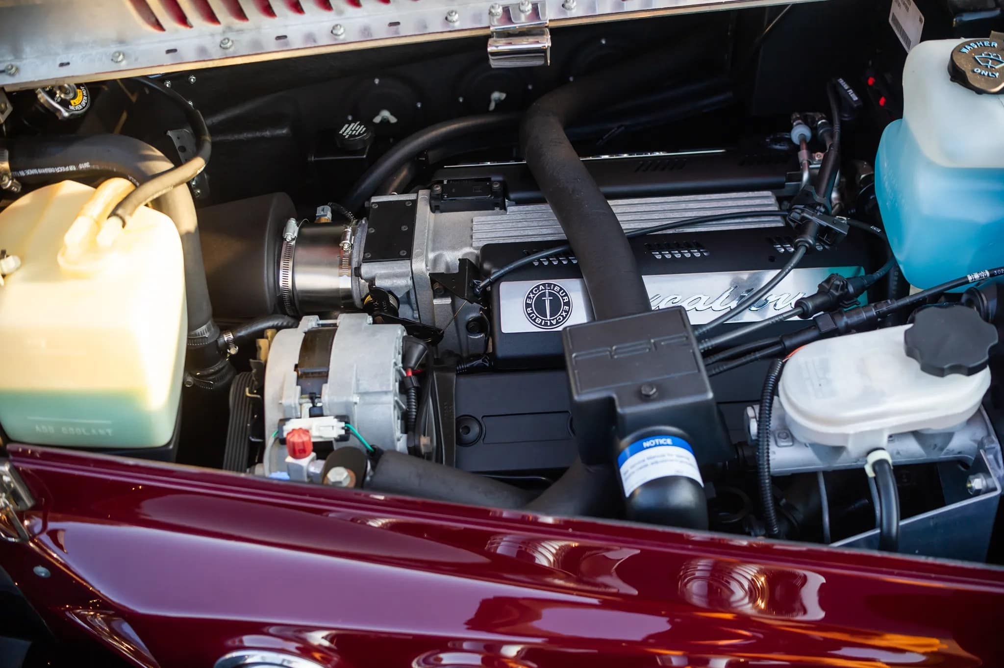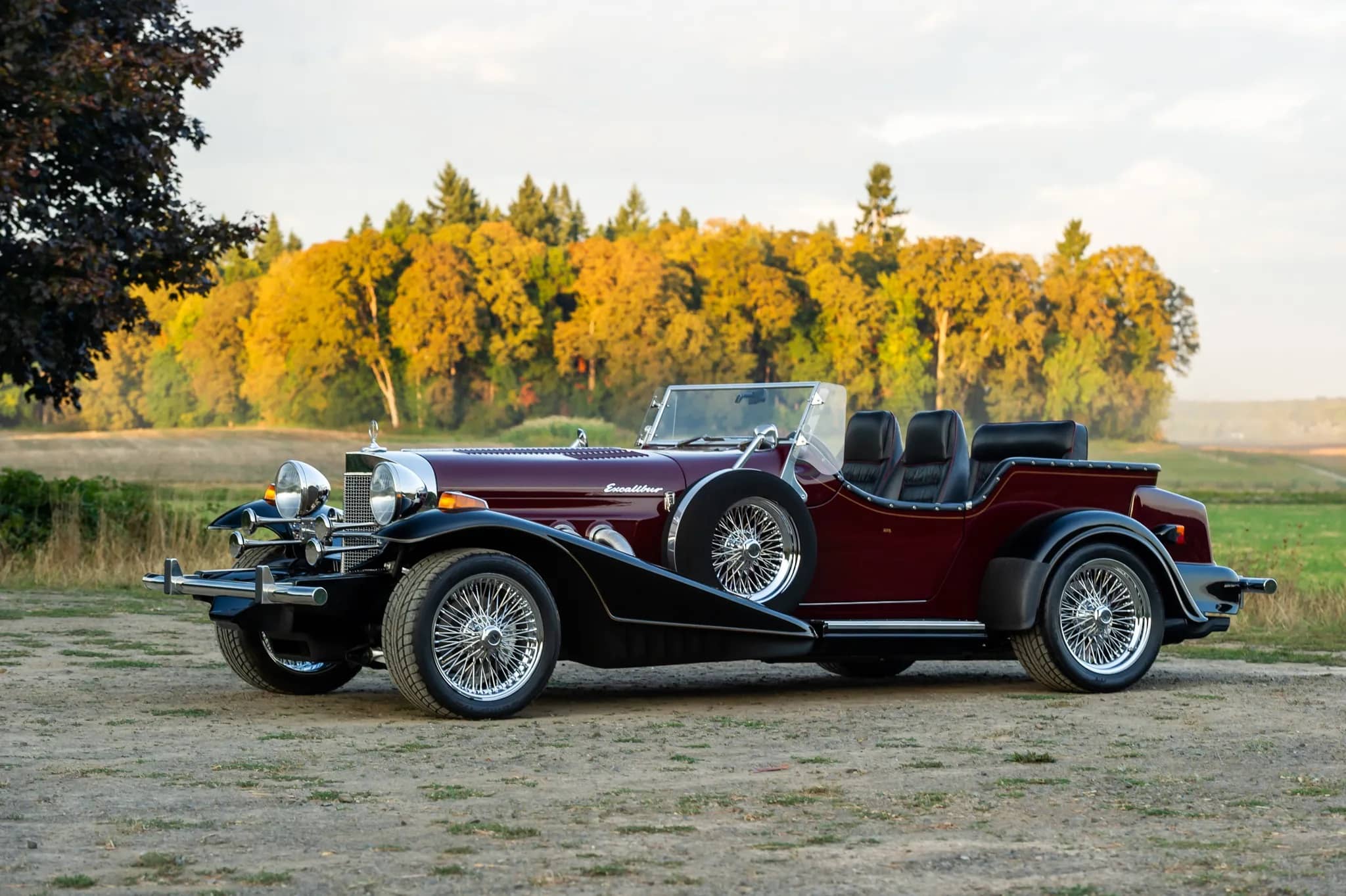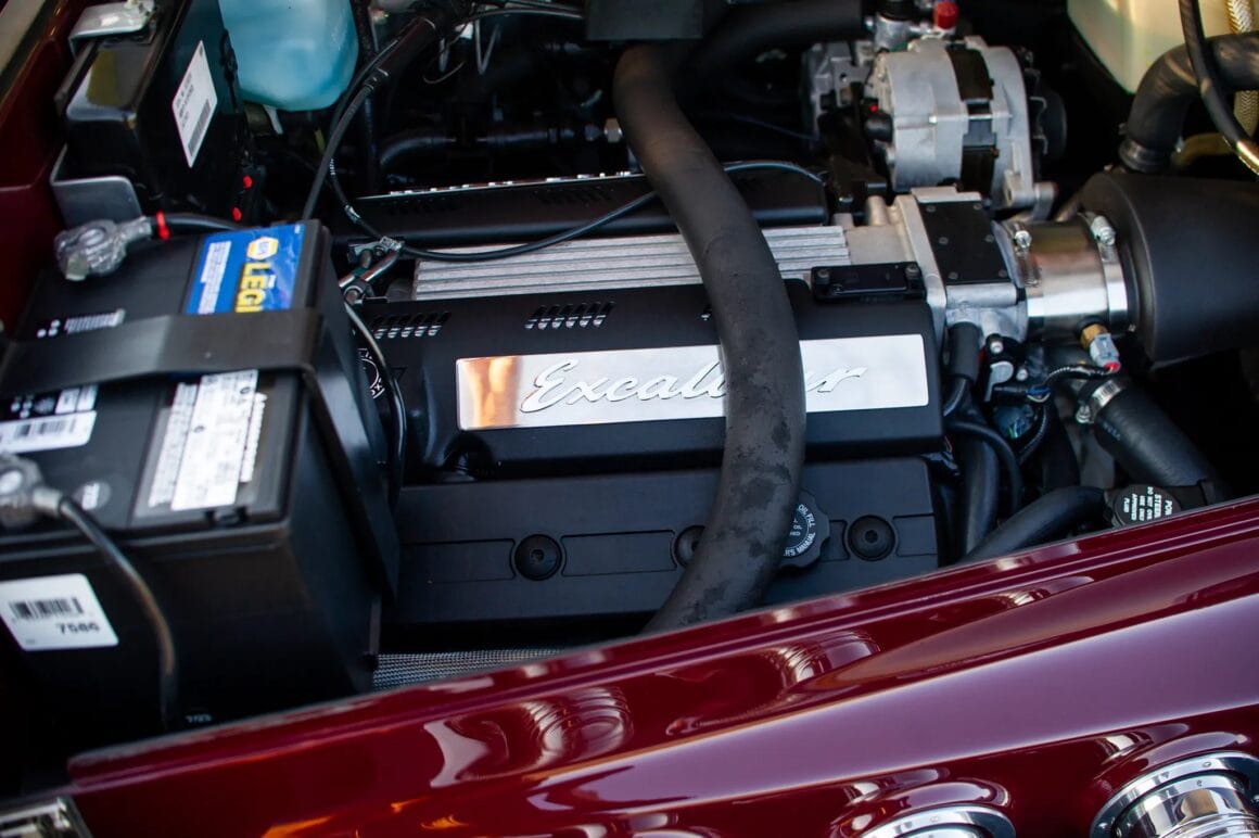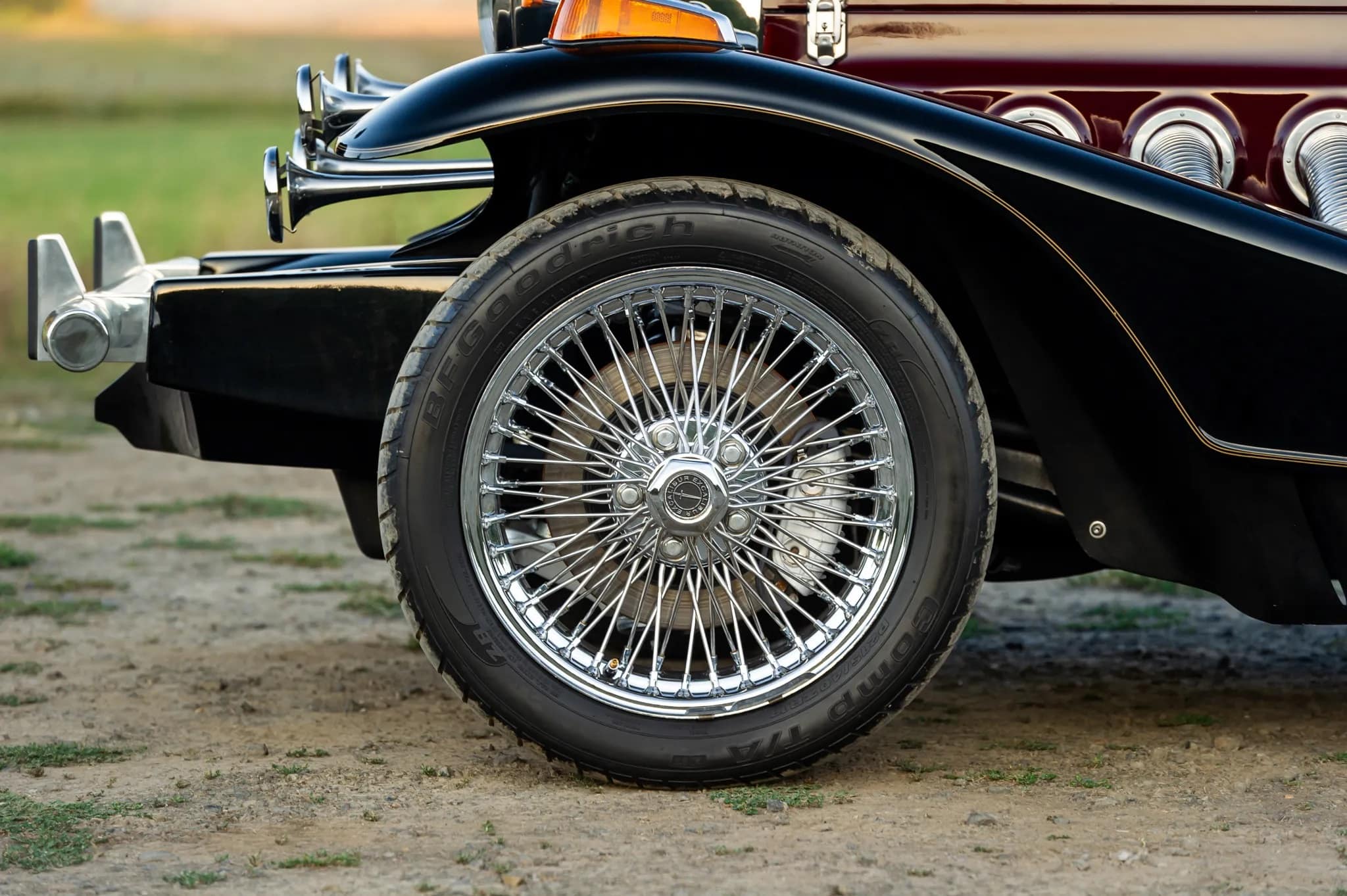 L’Excalibur a été produite à Milwaukee, dans le Wisconsin, avec des éléments de style inspirés du Roadster Mercedes-Benz SSK. Cet exemplaire est fini en bordeaux et noir, et l’équipement comprend une capote en toile noire, avec des panneaux latéraux assortis, des pare-chocs tubulaires, des marchepieds latéraux, un capot ventilé, des fausses sorties d’échappement latérales, ainsi que de faux klaxons. Les jantes à rayons polies de 17 pouces sont enveloppées de pneus BFGoodrich Comp T/A 275/40.