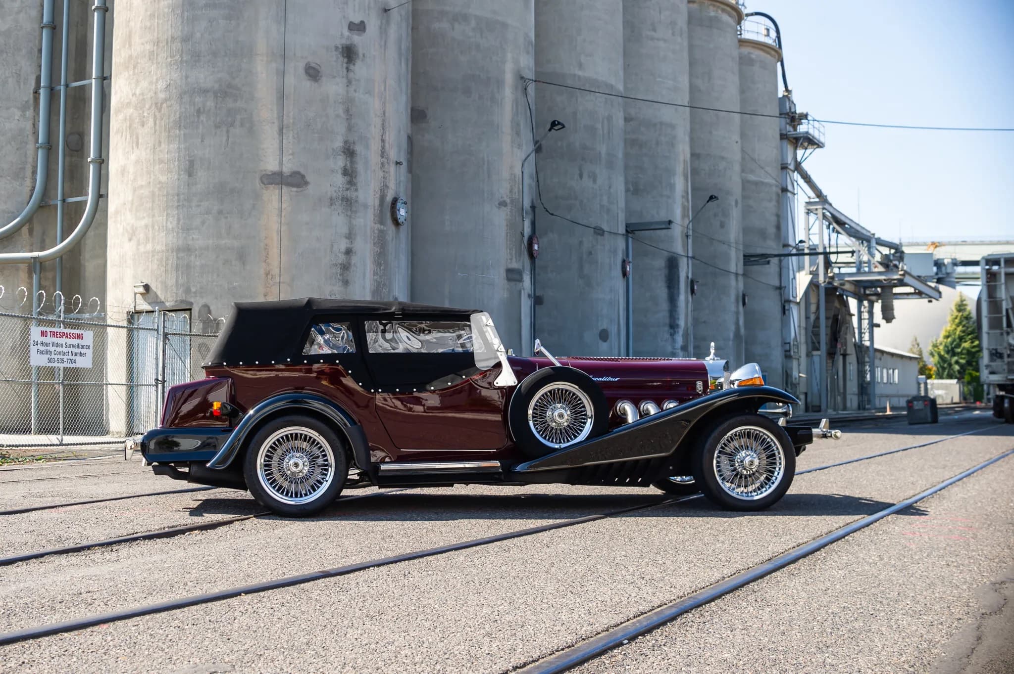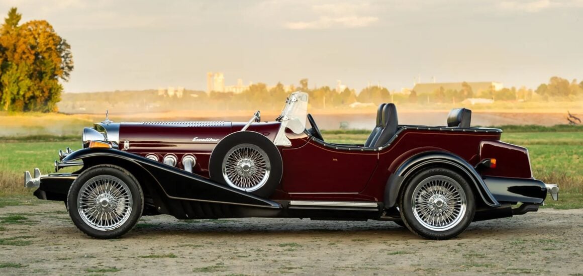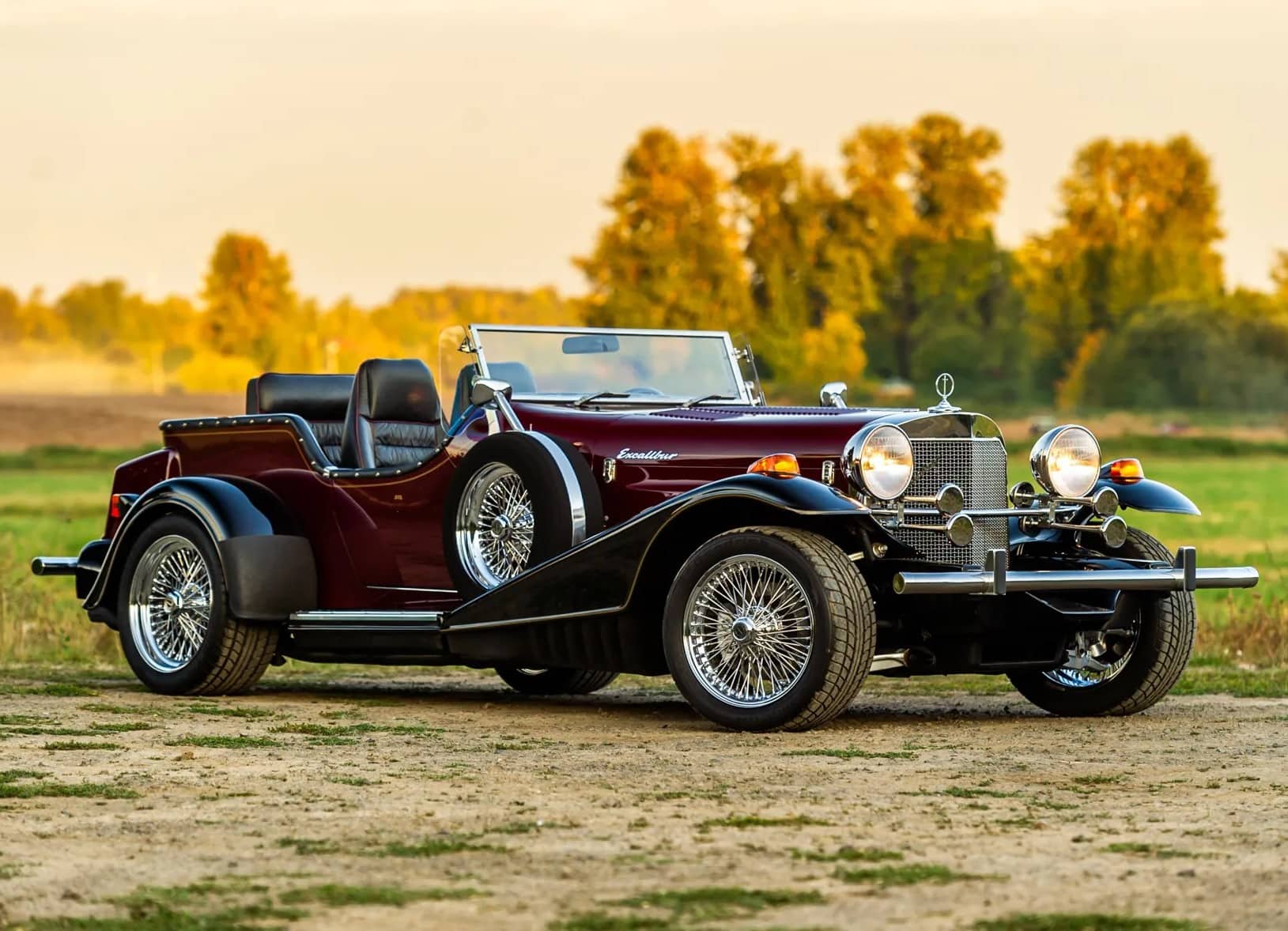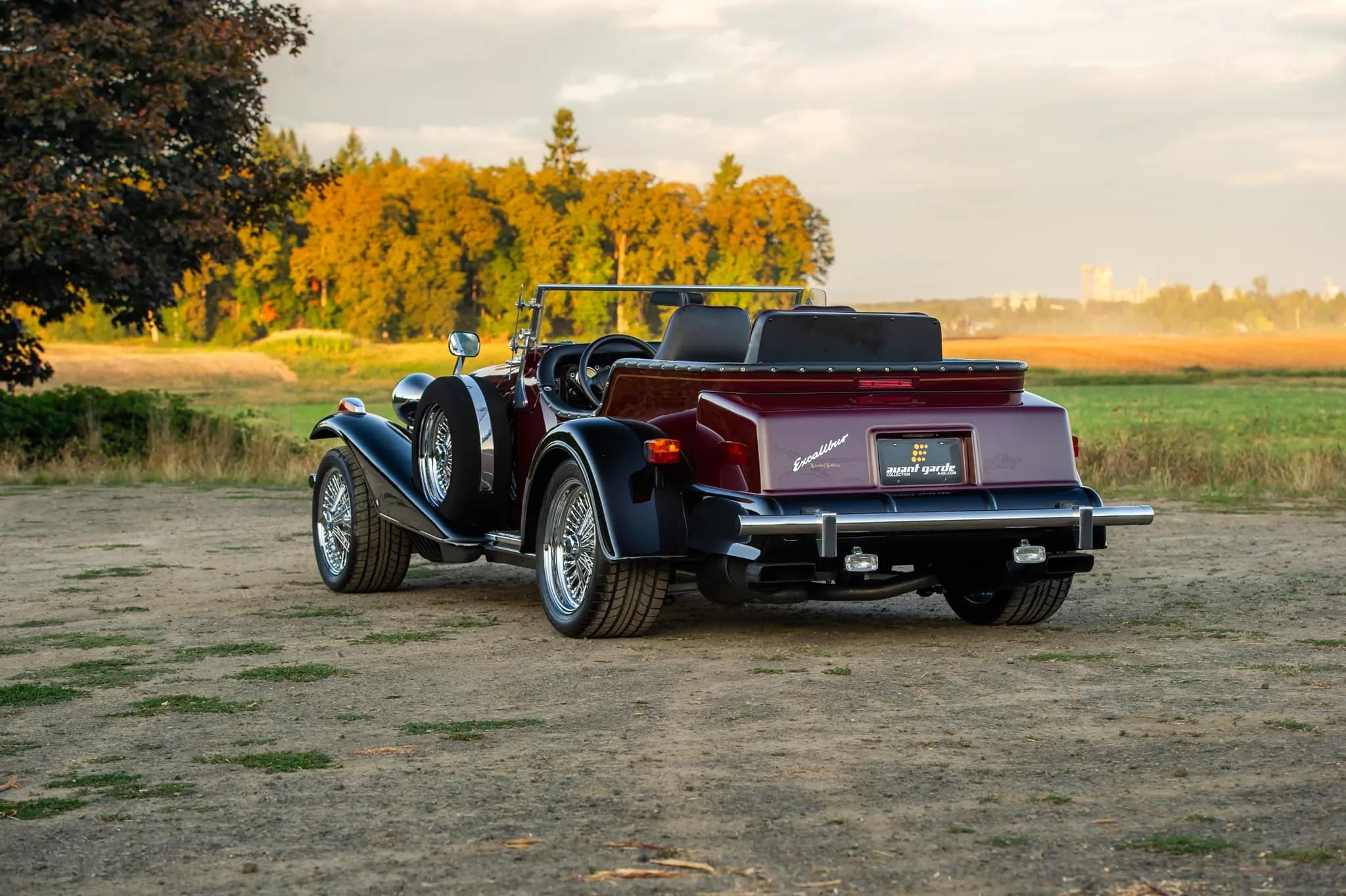 L’Excalibur a été produite à Milwaukee, dans le Wisconsin, avec des éléments de style inspirés du Roadster Mercedes-Benz SSK. Cet exemplaire est fini en bordeaux et noir, et l’équipement comprend une capote en toile noire, avec des panneaux latéraux assortis, des pare-chocs tubulaires, des marchepieds latéraux, un capot ventilé, des fausses sorties d’échappement latérales, ainsi que de faux klaxons. Les jantes à rayons polies de 17 pouces sont enveloppées de pneus BFGoodrich Comp T/A 275/40.