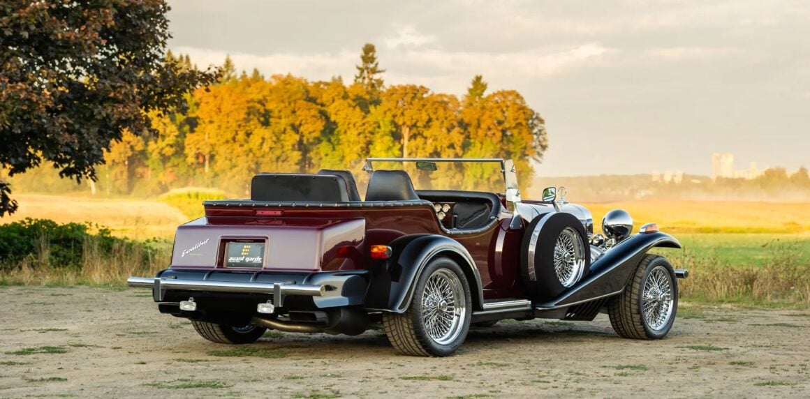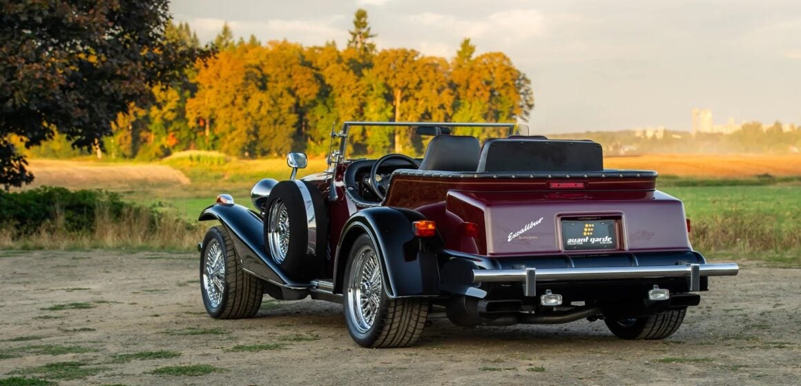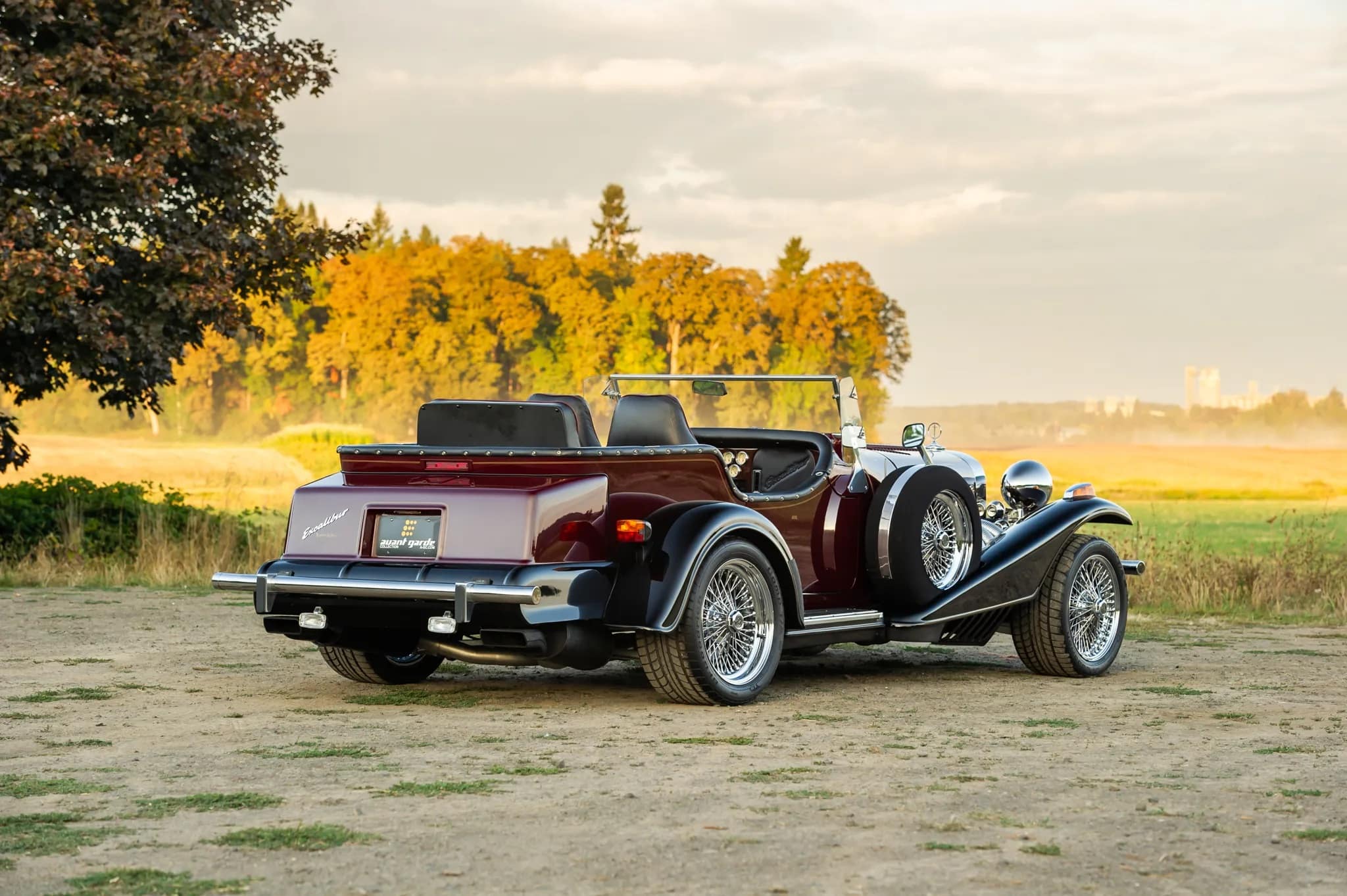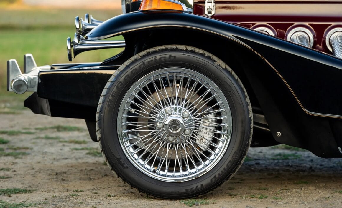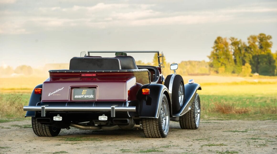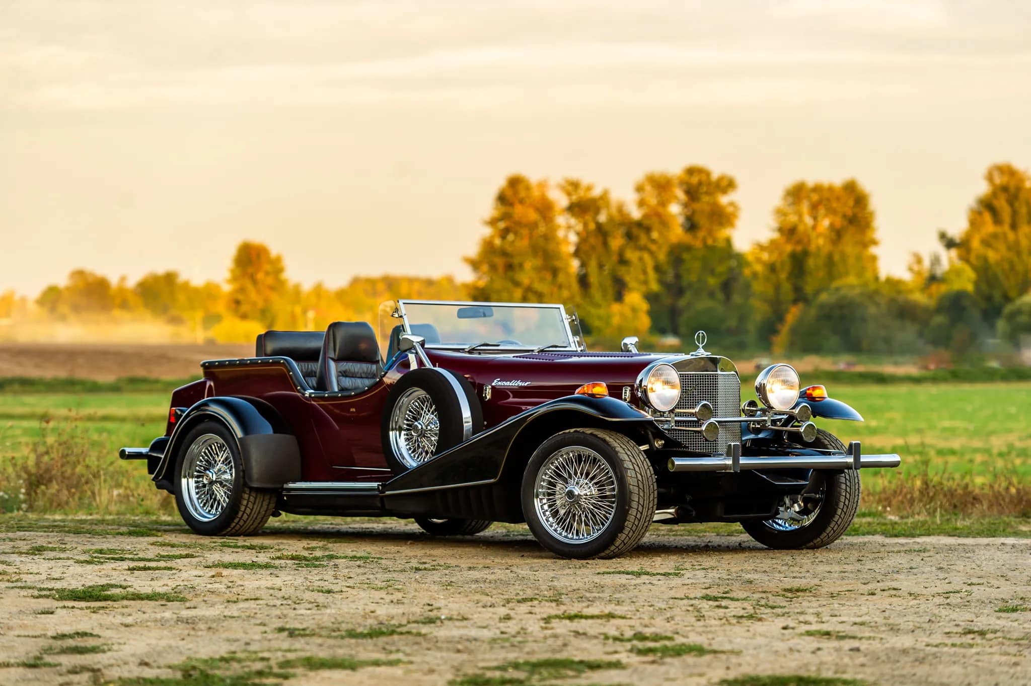 L’Excalibur a été produite à Milwaukee, dans le Wisconsin, avec des éléments de style inspirés du Roadster Mercedes-Benz SSK. Cet exemplaire est fini en bordeaux et noir, et l’équipement comprend une capote en toile noire, avec des panneaux latéraux assortis, des pare-chocs tubulaires, des marchepieds latéraux, un capot ventilé, des fausses sorties d’échappement latérales, ainsi que de faux klaxons. Les jantes à rayons polies de 17 pouces sont enveloppées de pneus BFGoodrich Comp T/A 275/40.