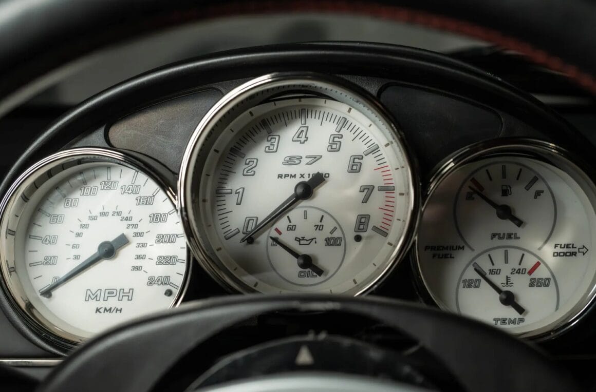 Quoi d’autre en mieux pour un américain fortuné ? D’autant qu’en plus de cette sensation dynamique véritablement racée, la S7 est raisonnablement à l’aise sur la route. Les amortisseurs hélicoïdaux, chacun avec des ressorts souples et durs empilés, offrent une conduite souple à des vitesses modérées. Lorsque le conducteur commence à rouler rapidement et que l’appui comprime la suspension, la voiture s’installe sur les ressorts les plus rigides, qui correspondent mieux aux charges plus élevées. Le passage des pneus Pirelli P Zero Rosso aux pneus Michelin ne nuit pas non plus à la conduite. Sur les routes lisses de Californie, la Saleen est raisonnablement absorbante, avec juste un soupçon de cliquetis métallique à entendre sur les bosses tranchantes.