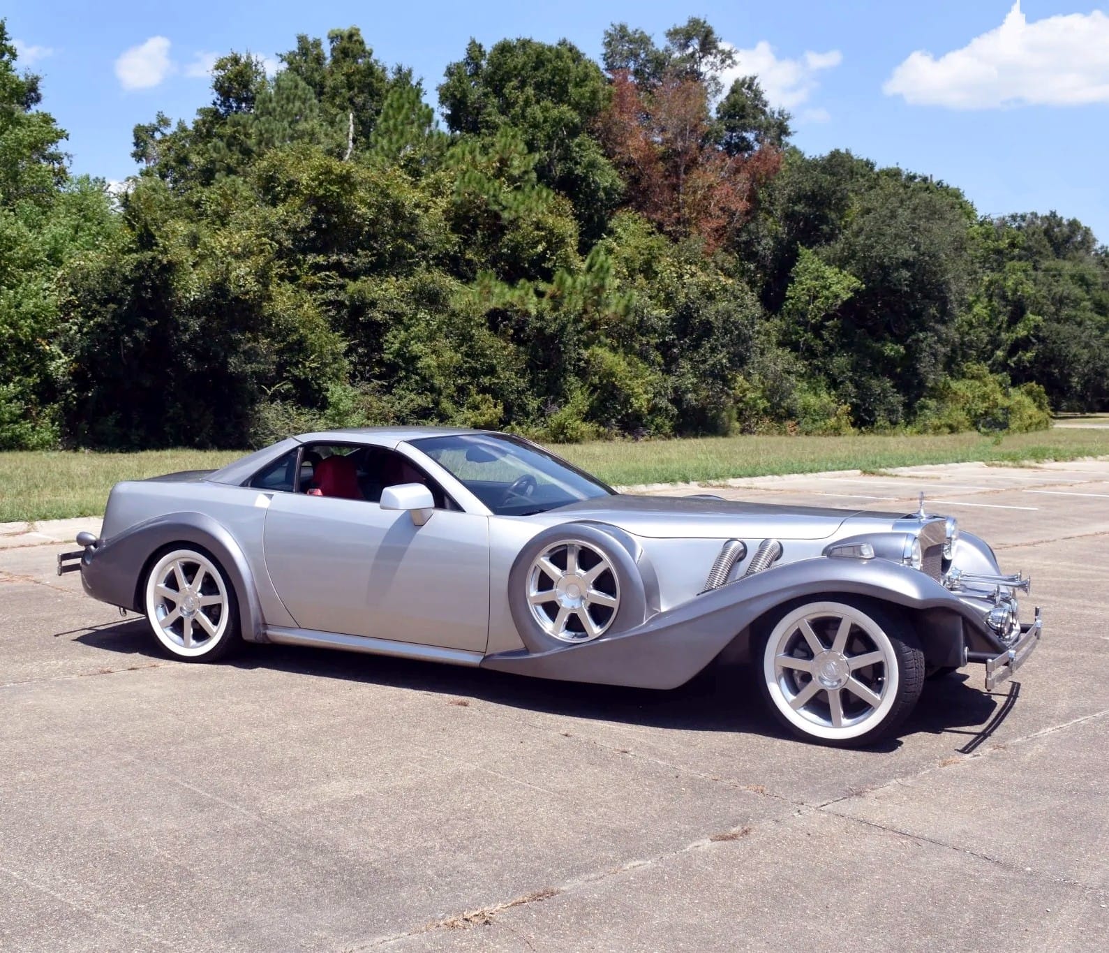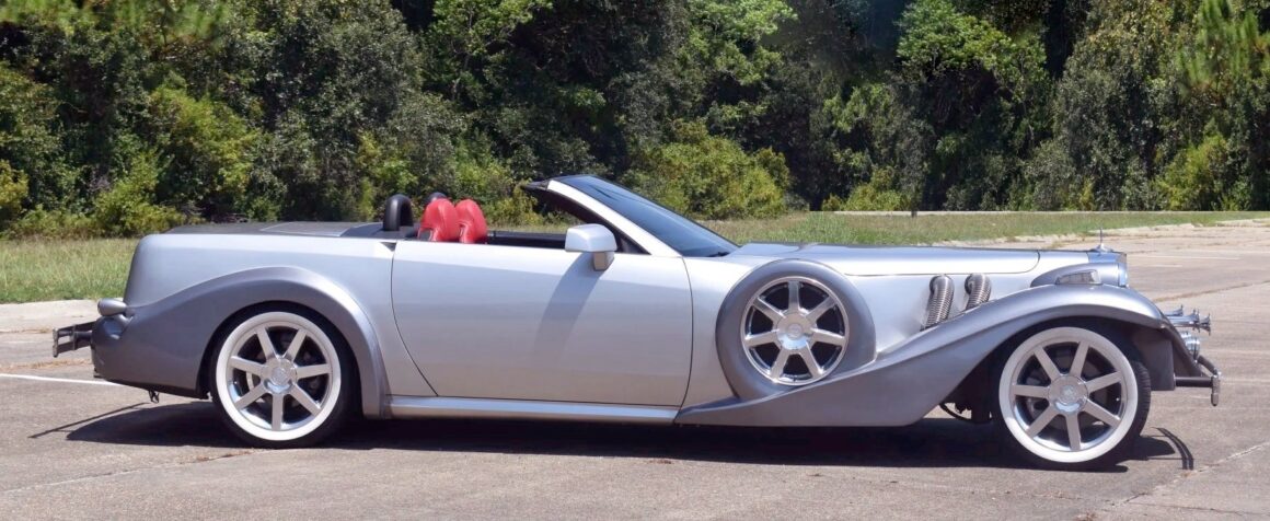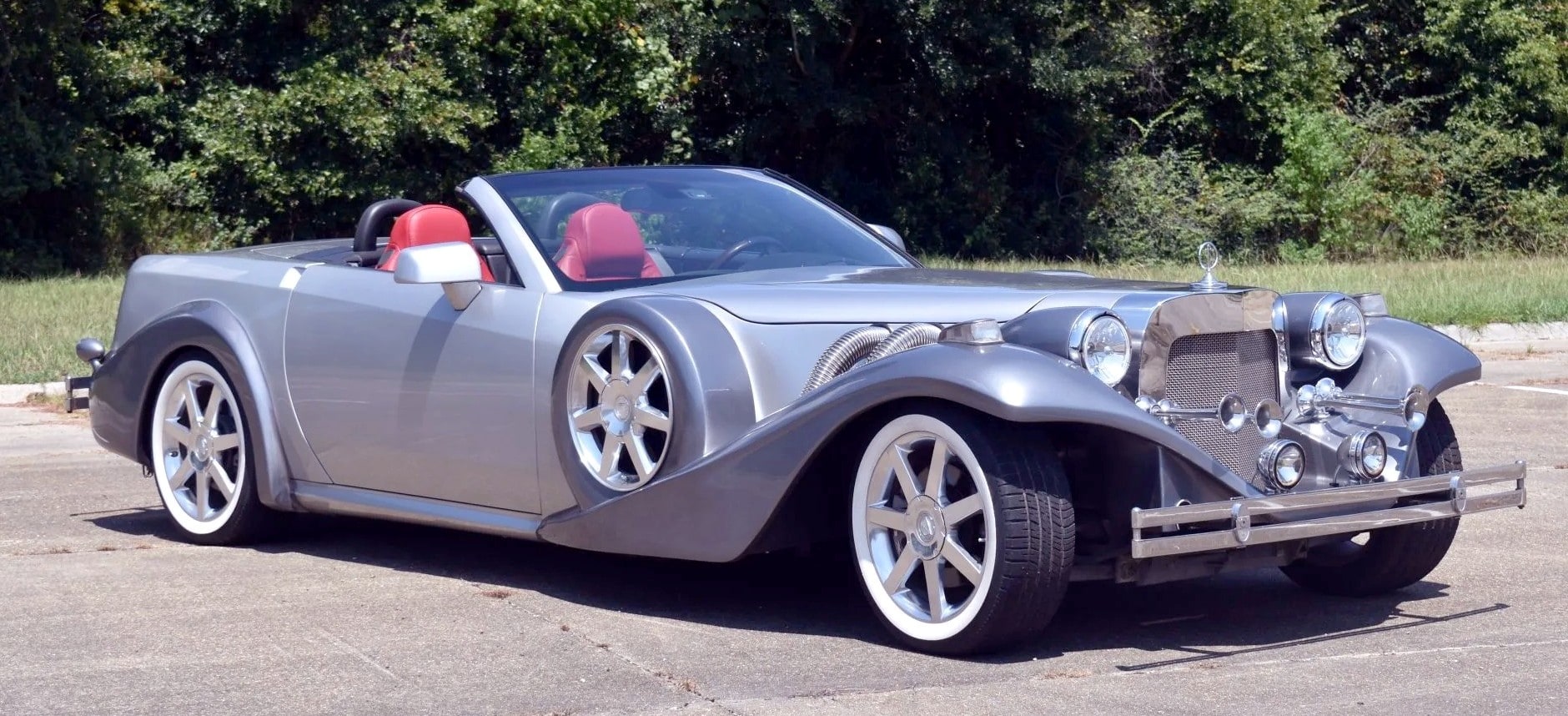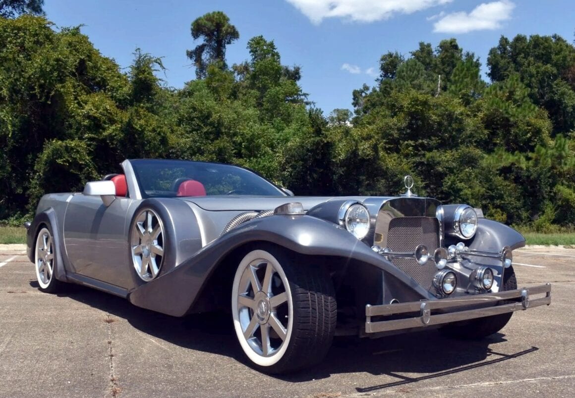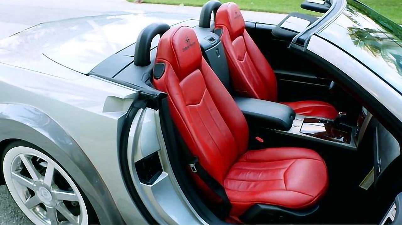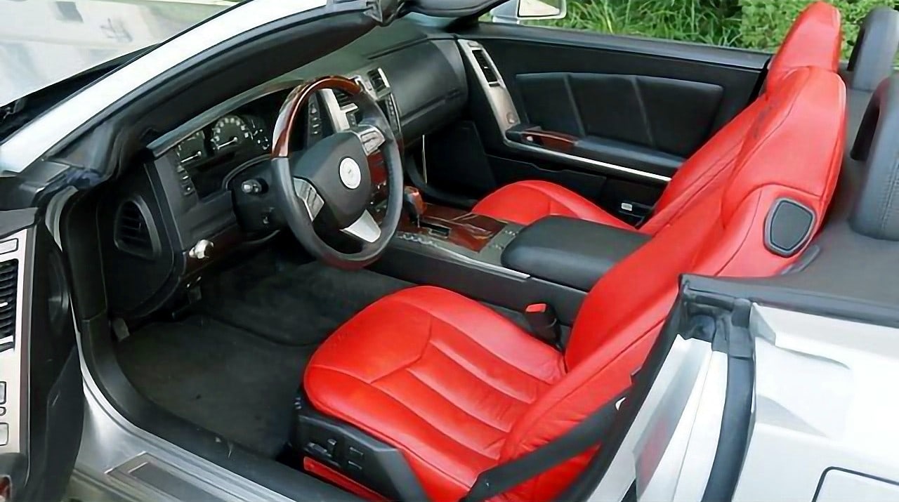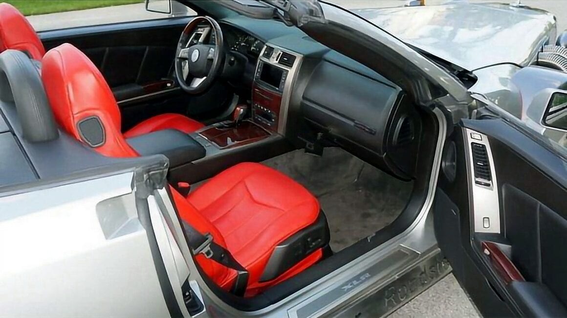 J’allais oublier les couvres fausses roues de secours de chaque côté du capot resculpté. Pffffff ! Peinte en argent et gris sur une sellerie rouge, la voiture est motorisée par le V8 Northstar 4L6 litres de 320cv et sa transmission automatique à six vitesses. Tout comme la Cadillac XLR le toit rigide/hard-top est resté rétractable électriquement, et tout ce qui faisait le confort de la Cadillac XLR a intégralement été repris : contrôle magnétique, sièges chauffants à réglages électriques, système d’infodivertissement à écran tactile, la navigation et un système audio Bose. Les modifications représentent un coût de 80.000 $ plus la Cadillac donneuse (d’occasion) de 30.000 $ et un profit de 40.000 $…
