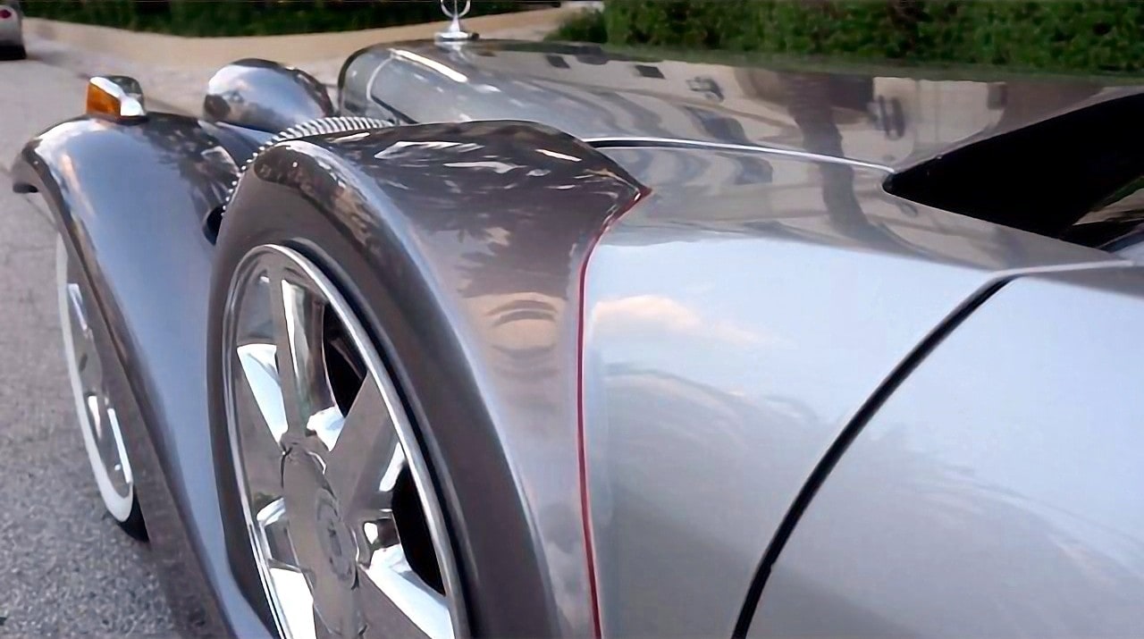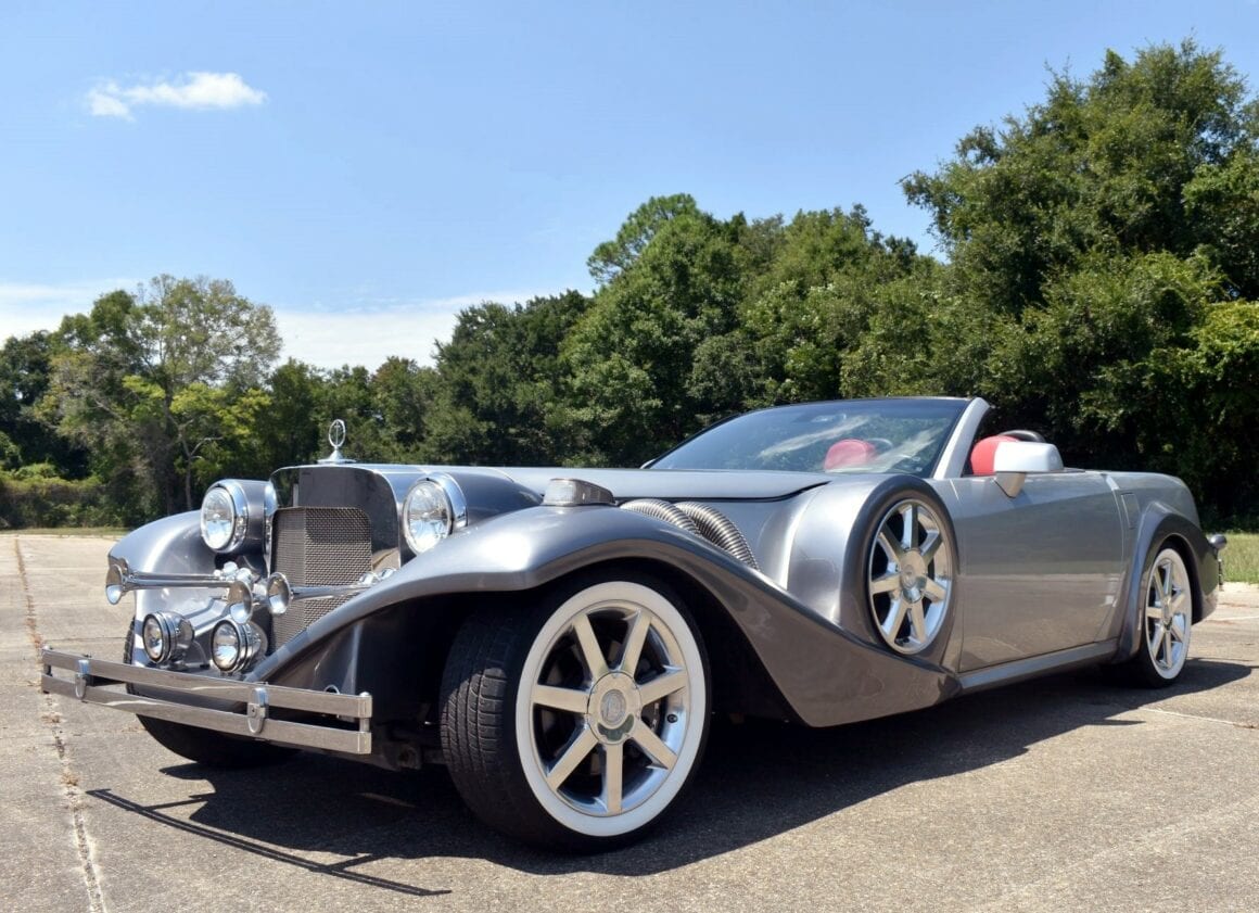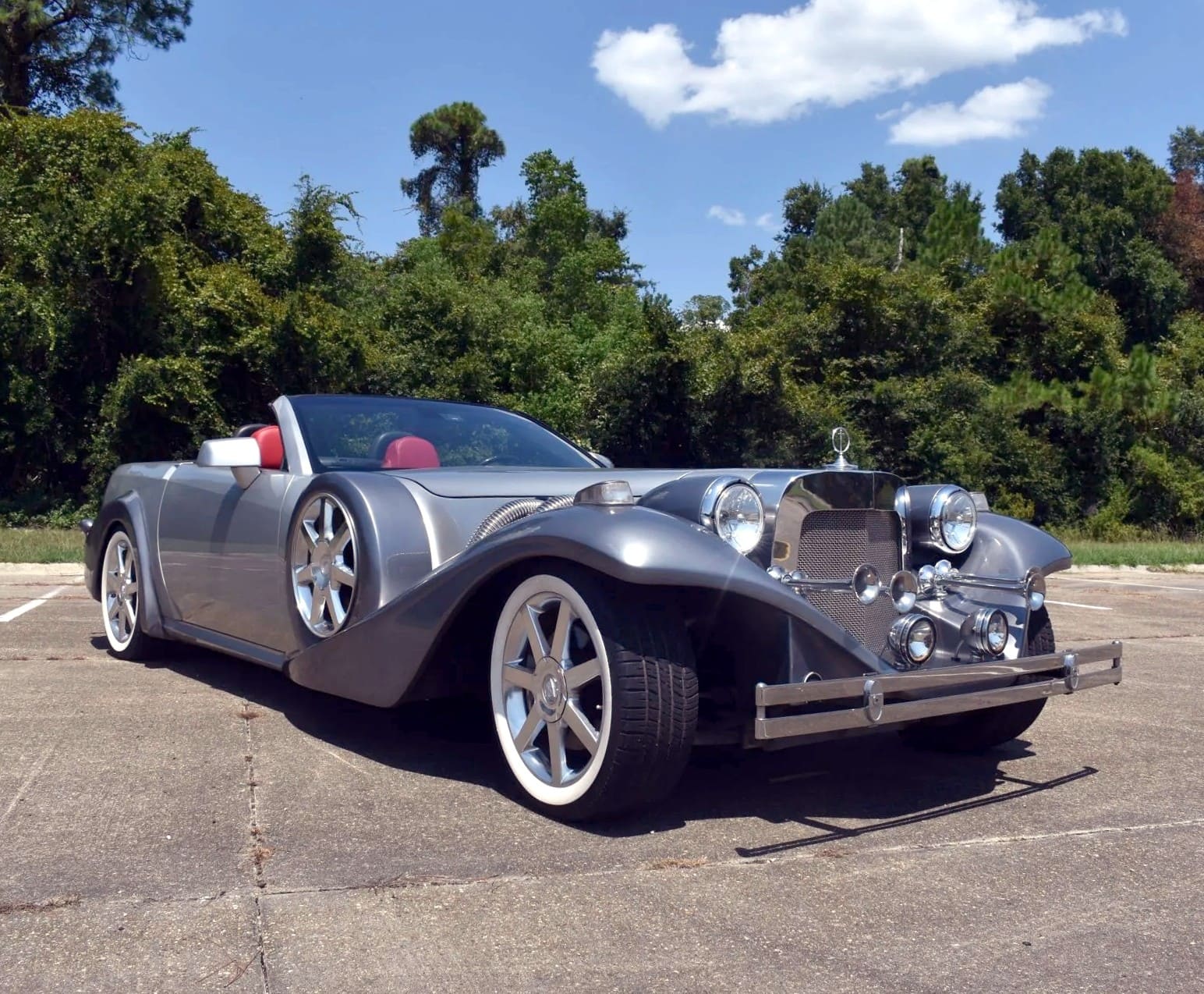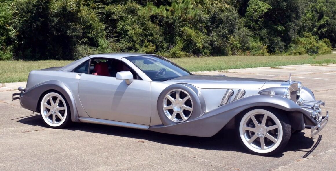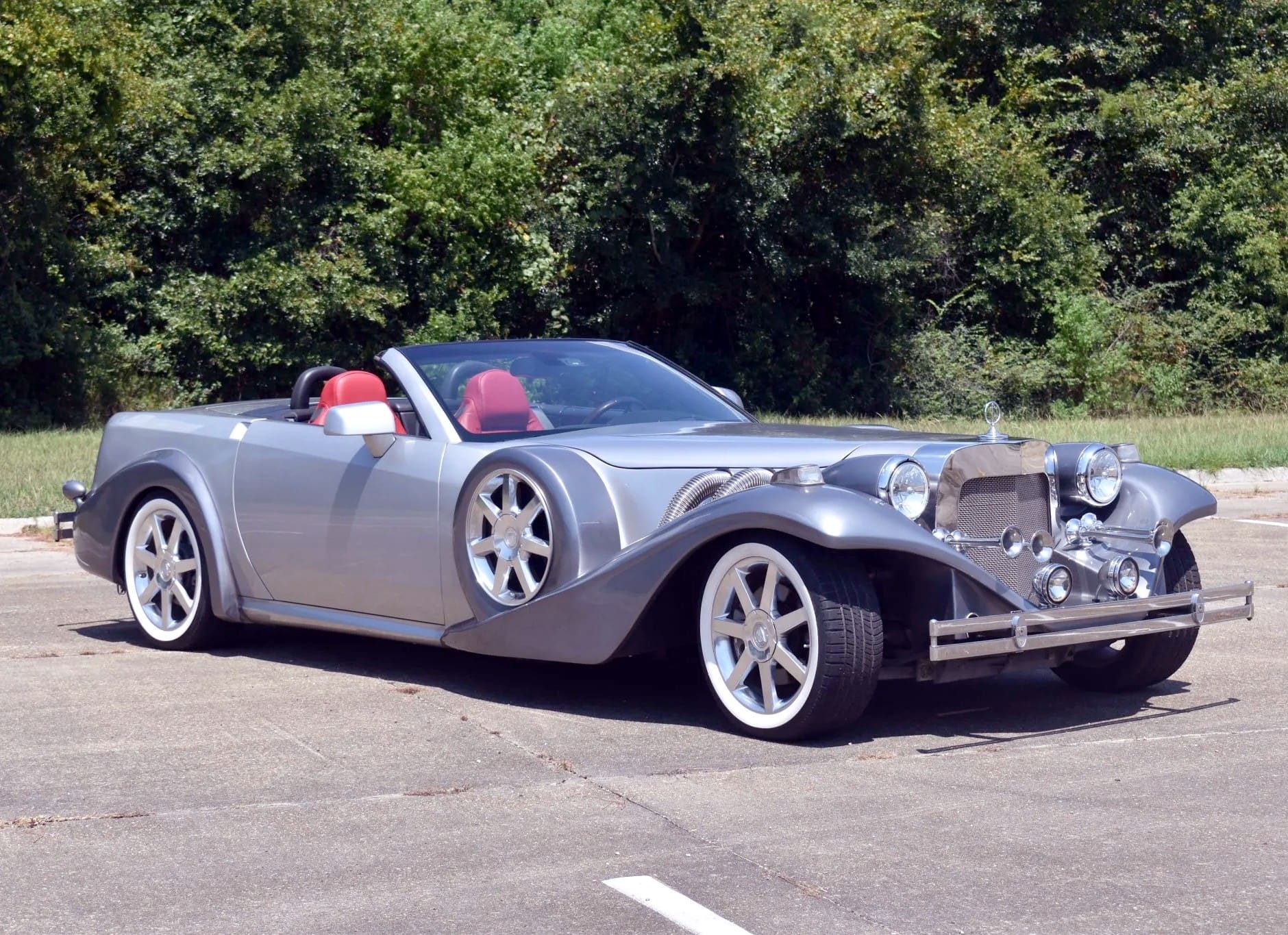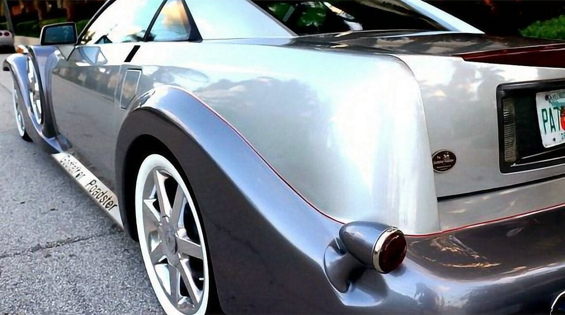 J’allais oublier les couvres fausses roues de secours de chaque côté du capot resculpté. Pffffff ! Peinte en argent et gris sur une sellerie rouge, la voiture est motorisée par le V8 Northstar 4L6 litres de 320cv et sa transmission automatique à six vitesses. Tout comme la Cadillac XLR le toit rigide/hard-top est resté rétractable électriquement, et tout ce qui faisait le confort de la Cadillac XLR a intégralement été repris : contrôle magnétique, sièges chauffants à réglages électriques, système d’infodivertissement à écran tactile, la navigation et un système audio Bose. Les modifications représentent un coût de 80.000 $ plus la Cadillac donneuse (d’occasion) de 30.000 $ et un profit de 40.000 $…