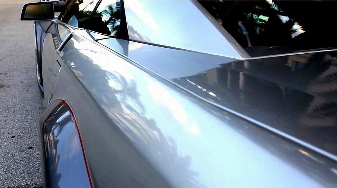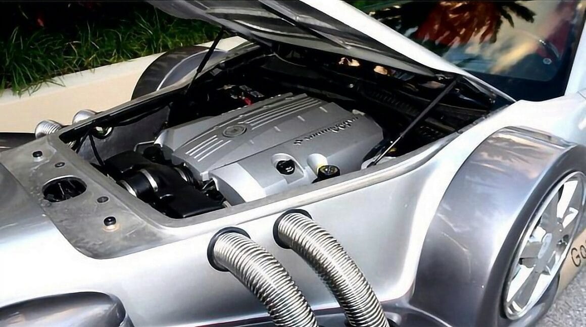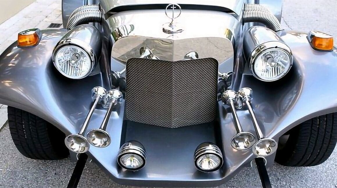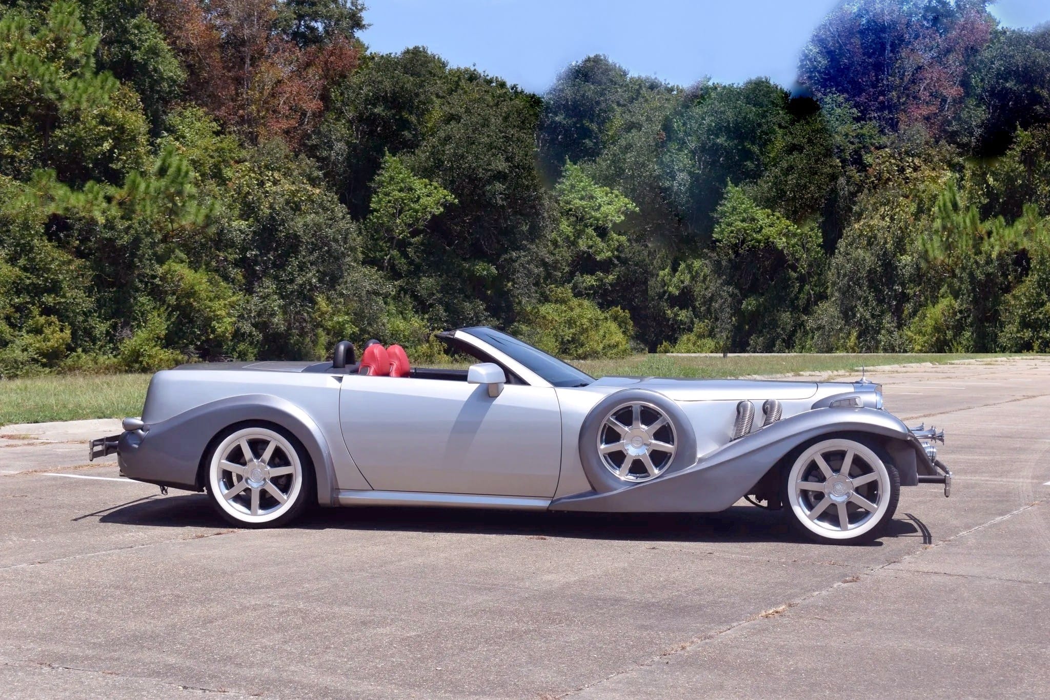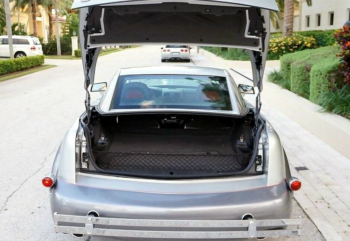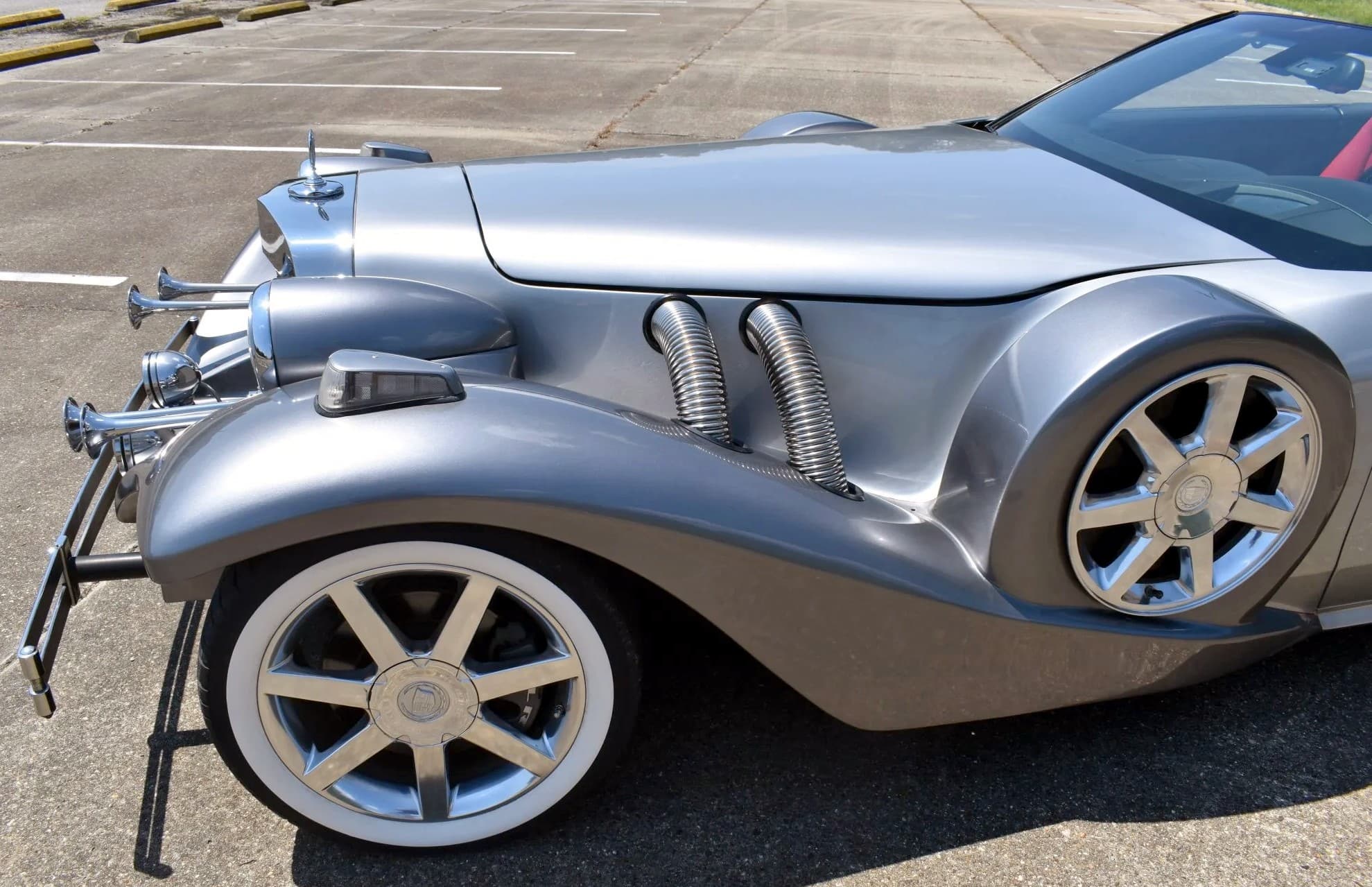 J’allais oublier les couvres fausses roues de secours de chaque côté du capot resculpté. Pffffff ! Peinte en argent et gris sur une sellerie rouge, la voiture est motorisée par le V8 Northstar 4L6 litres de 320cv et sa transmission automatique à six vitesses. Tout comme la Cadillac XLR le toit rigide/hard-top est resté rétractable électriquement, et tout ce qui faisait le confort de la Cadillac XLR a intégralement été repris : contrôle magnétique, sièges chauffants à réglages électriques, système d’infodivertissement à écran tactile, la navigation et un système audio Bose. Les modifications représentent un coût de 80.000 $ plus la Cadillac donneuse (d’occasion) de 30.000 $ et un profit de 40.000 $…