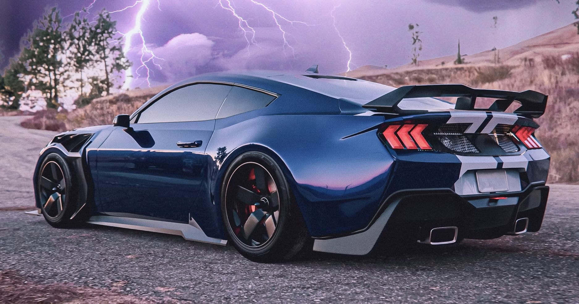 Ok, assez de bave d’ingénierie. Vous pouvez voir où est allongé l’empattement de la voiture pour l’adaptation. Tirer l’essieu avant vers l’avant et étendre les ailes à l’aide d’évents en fibre de carbone. L’étirement de l’empattement vers l’avant est bon pour la maniabilité. Il maintient le poids du moteur centré dans le châssis au lieu de pendre au-dessus de la ligne de l’essieu avant. Un nouveau carénage avant avec beaucoup de carbone visible met en valeur la voiture. Des loquets de capot semi-exposés, plus de ventilation du capot et un séparateur qui racle le sol contribuent à la méchanceté, au refroidissement et aux performances aérodynamiques de la voiture dans cet ordre. Des jupes latérales qui ne permettraient pas d’éliminer une fourmi dans un parking, un nouveau diffuseur et un énorme aileron arrière ajoutent tous à l’apparence sérieuse de la Mustang V12. Comme pour la Mustang GTD, les bouches d’aération à l’arrière permettent à l’air de s’écouler du différentiel et vous permettent de voir la suspension arrière intérieure en action. Le prix ? Pfffffffffffffffffffff ! Lorsqu’on aime on ne compte pas plus que lorsqu’on a de bons moyens financiers…